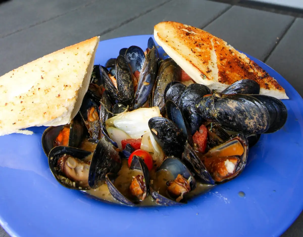 Tender mussels are cooked in a fragrant broth of apple moonshine, white wine, fennel, onions, tomatoes, and chorizo. The broth is so flavorful you will want to soak it up with the garlic bread served alongside.