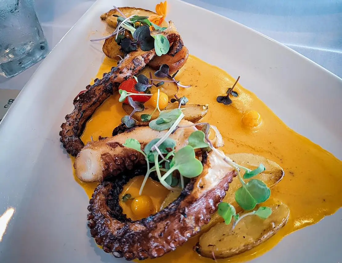 For those seeking a more elegant night out, Fresh Catch Bistro delivers. The white-tablecloth setting is relaxed but sophisticated, and every table has a view of the water. Reservations are recommended, especially for sunset dining.