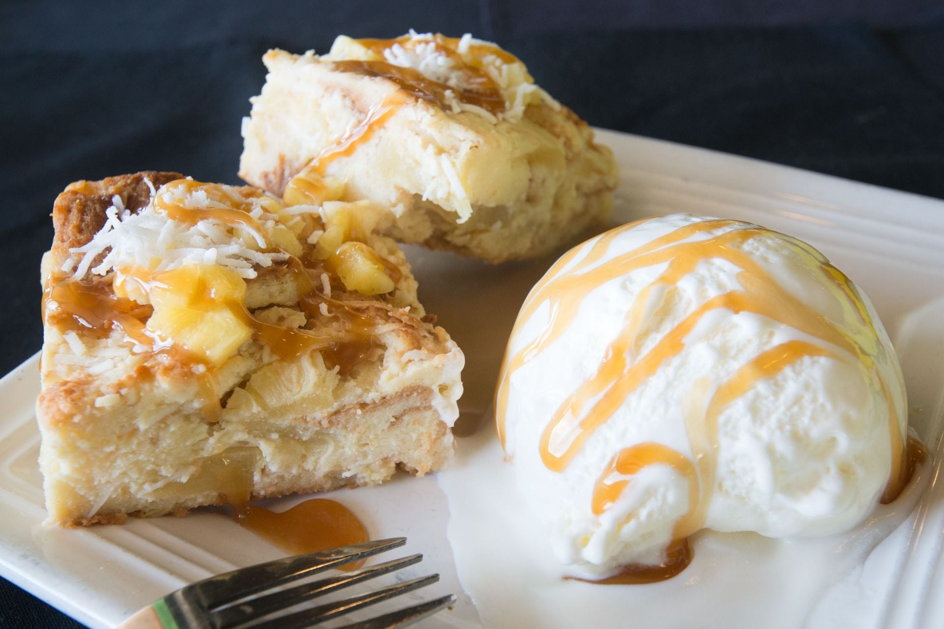 This dessert is the ultimate indulgence: a coconut-pineapple custard bread pudding with rum sauce and vanilla ice cream. It’s a tropical twist on a Southern classic.