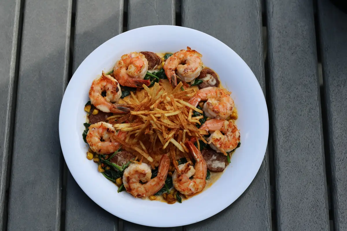 A hearty plate of jumbo shrimp and smoky chorizo served over buttery stone-ground grits. Sweet red peppers and roasted corn add color and texture, and crispy fried potatoes on top make the dish unforgettable.