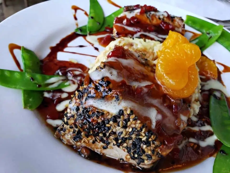This entrée combines sushi-grade tuna with a sesame crust for crunch and flavor. The tuna is served with Thai chili sauce, teriyaki glaze, and wasabi aioli, making it a feast for the senses.