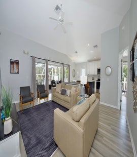 "The area is still coming back from Hurricane Ian but is getting there. The house was nicely furnished, very clean, new kitchen and beautiful bathrooms. Very comfortable beds with nice linens. Nice new, fluffy towels. Pool heated, hot tub nice but no instructions, had to figure it out for ourselves. Was told chairs and umbrella available but 2 chairs for house that sleeps 6-8 makes no sense. Umbrella was broken. Kitchen stocked with dishes, glasses, pots,etc but no coffee filters for machine. You need to bring everything if you plan to cook…nothing there, not even salt and pepper. Management company was responsive."