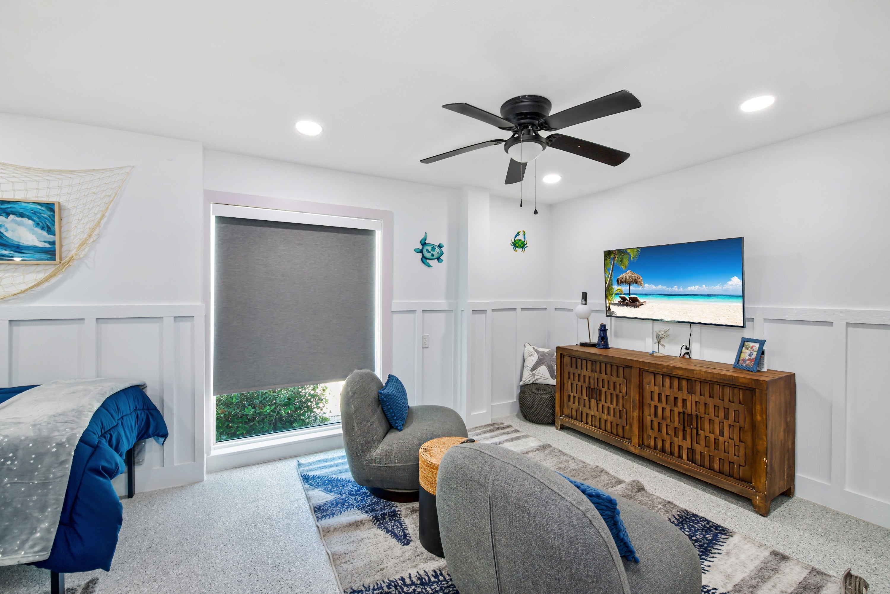 Escape to Bayview Beach House, a true island retreat on Fort Myers Beach with stunning bay views, a tropical outdoor oasis, and just a short walk to the Gulf of Mexico. This spacious two-story home offers 5 bedrooms and 4 bathrooms, including a first-floor queen bedroom with an ensuite bath, a twin bedroom with a fun gaming room, and an upstairs king master suite with its own bathroom. Two additional upstairs queen bedrooms share a guest bath. The outdoor area is a highlight, featuring a large tiki bar that seats 12, complete with lights, TVs, and music features—perfect for gathering with friends and family. Enjoy a refreshing dip in the pool with a peaceful waterfall while soaking in the sunny, southeast-facing bayfront setting. Inside, you’ll find a well-equipped kitchen with Italian marble countertops, comfortable living spaces, and balconies with gorgeous water views. Starlink satellite WiFi powers the home, so you’ll never miss a beat—whether working remotely or streaming by the pool. Book your stay today and experience Fort Myers Beach in a home with relaxed coastal living. BONUS: Ping pong table that can be converted to a pool table in the garage!