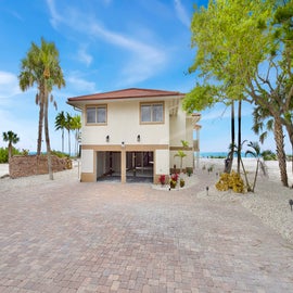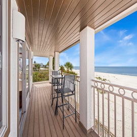 Welcome to Beachfront Palace where this beachfront home will make you feel like royalty. Expansive gulf views greet you as you walk through the doors and onto the main floor. The main floor hosts a stunning kitchen that would make anyone want to be a chef. The oversized kitchen island will have everyone gathering for conversations. An open floor plan floods the living spaces with natural light. From the large sectional, dining table that seats eight, and the kitchen island that seats 4, there is not a shortage of comfort and luxury in this home. Four of the five bedrooms are on the main floor. A queen with gorgeous ensuite bath, another additional queen bedroom, a guest room with 2 twin beds, the guest bath with walk in shower is shared between a queen bedroom and the twin bedroom. The second primary king bedroom suite is very private and serene with its own lovely en suite with an extra-large shower. Upstairs is an incredibly private primary suite with a king bed facing the Gulf, plus a huge bath with a soaker tub, walk-in shower, and large closet. Come and watch the shore birds, dolphins and the spectacular sunsets for which Fort Myers Beach is famous right from the balcony of Beachfront Palace.