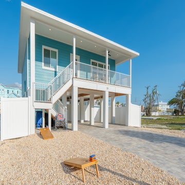 Front of house with cornhole game.Welcome to Betty's Beach HouseBalcony viewFront balcony view with chairs to watch sunset/sunriseFront balcony view of beach