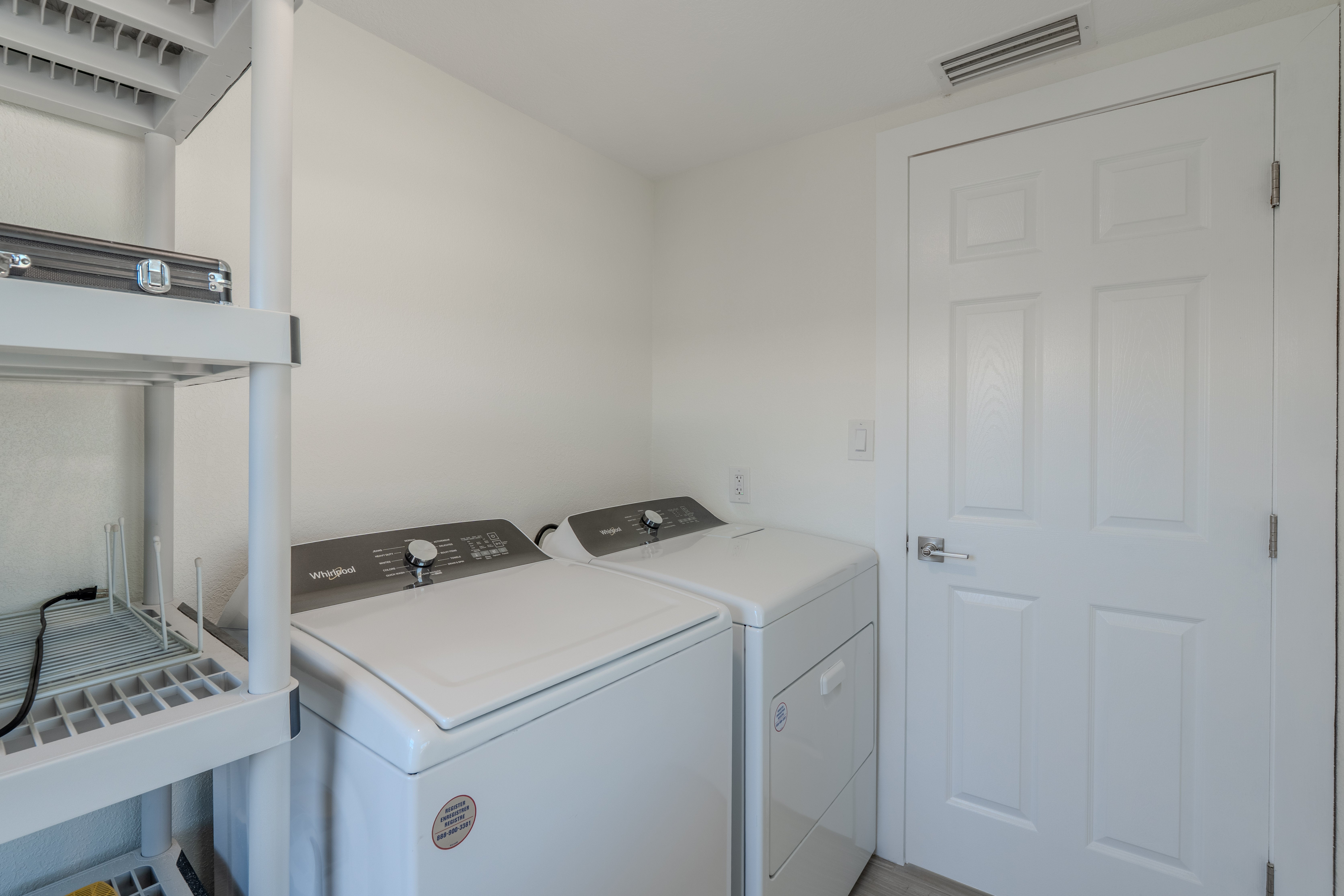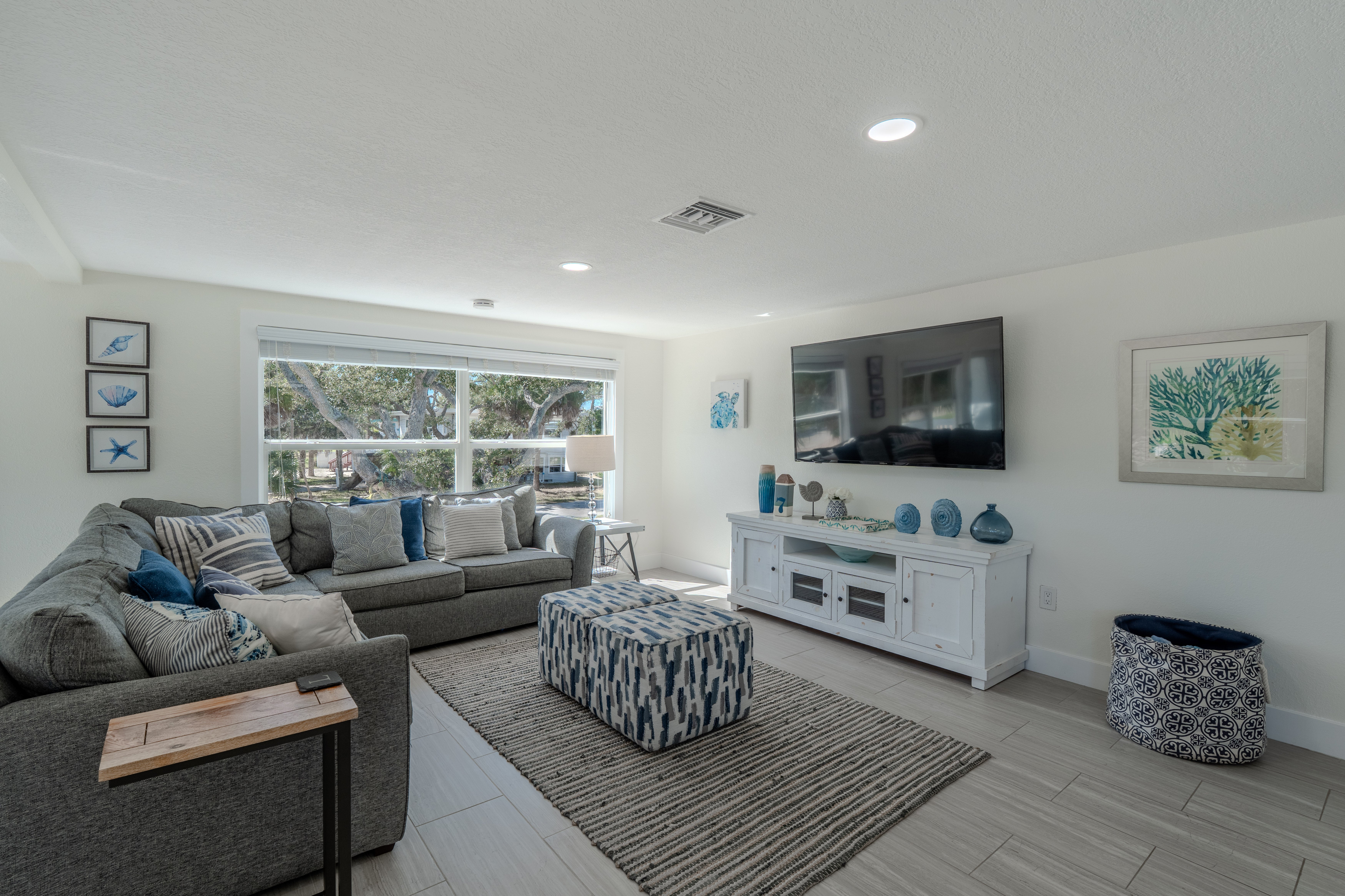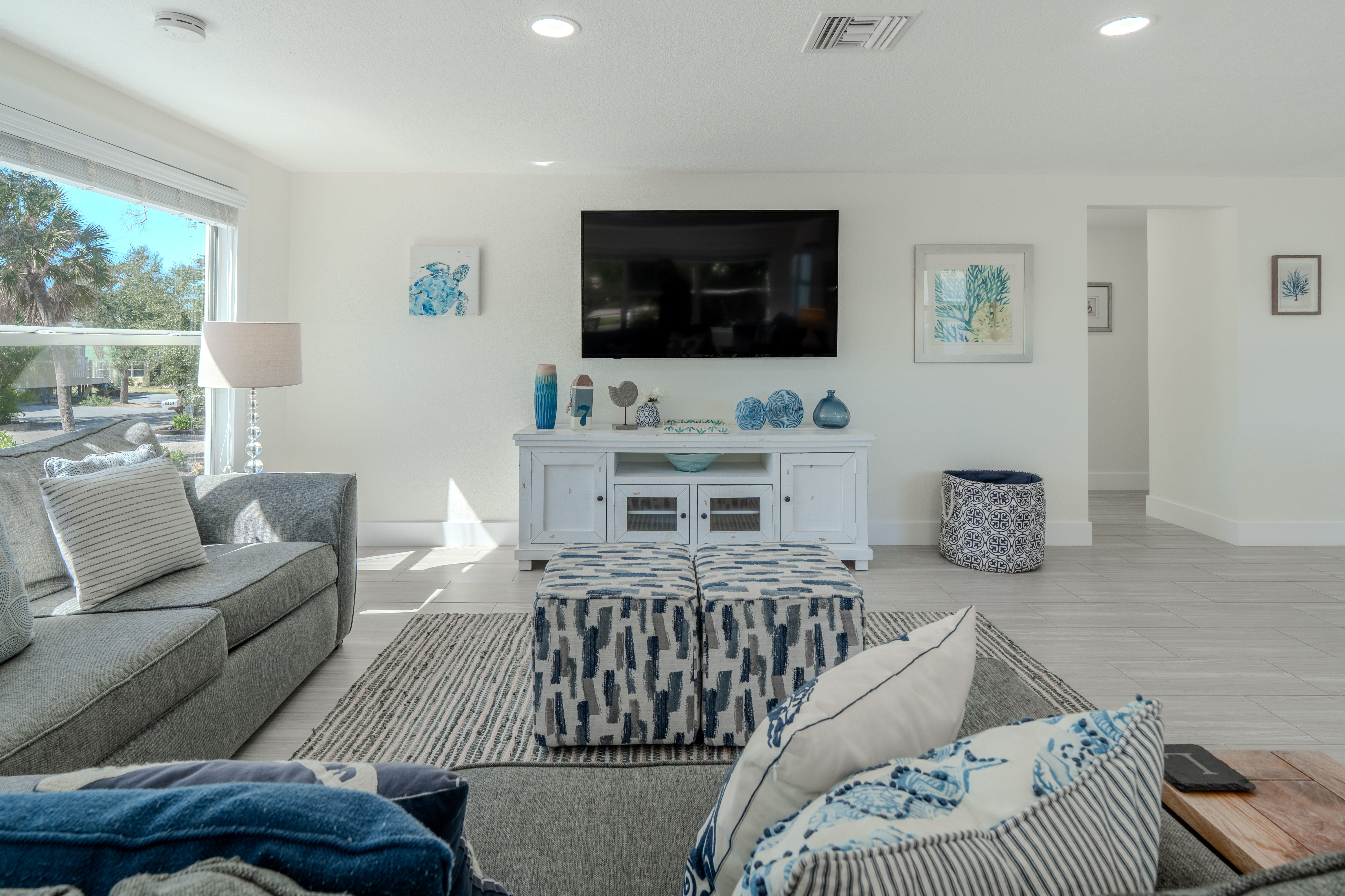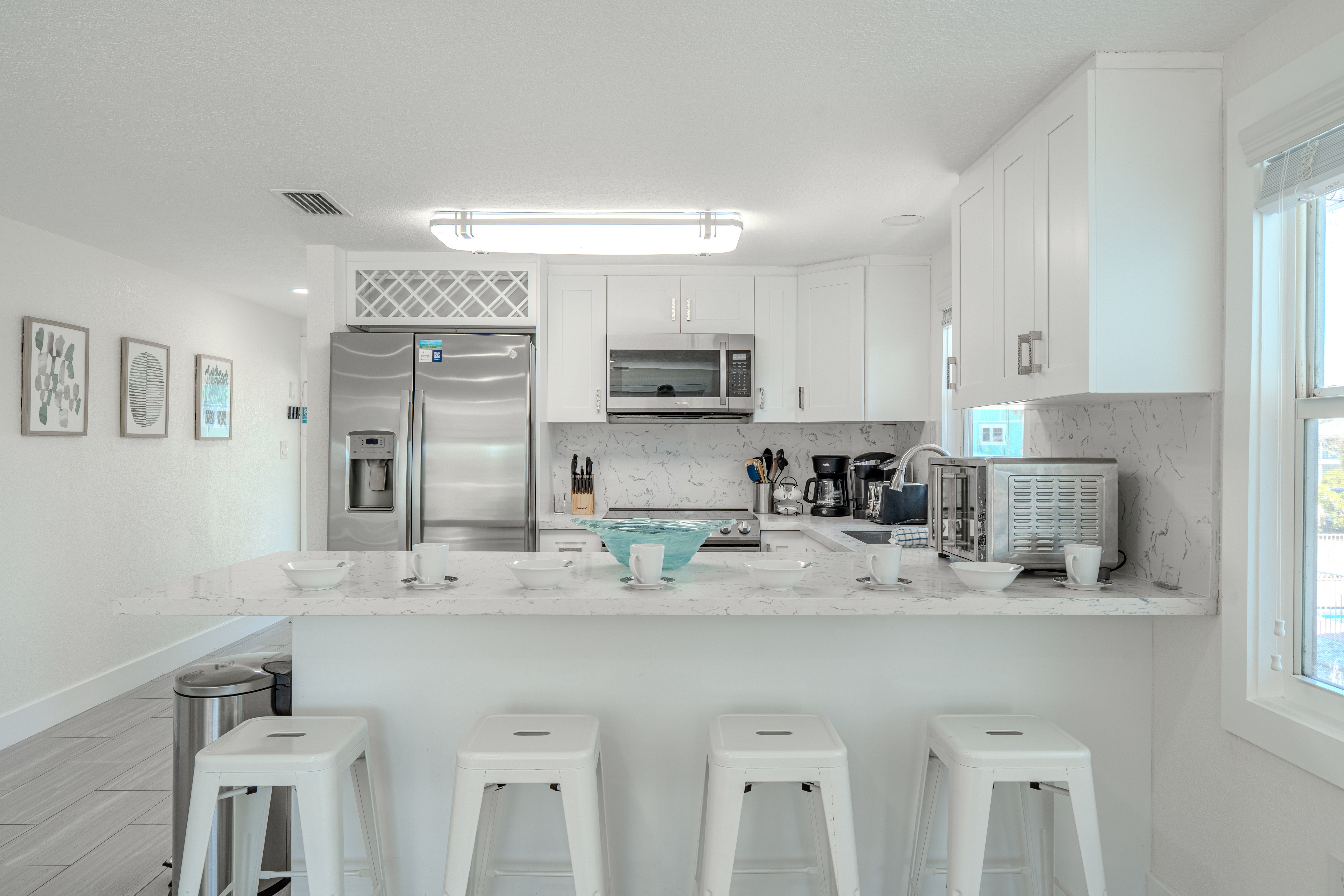 Welcome to Blue Oasis, a beautiful two-bedroom two bath home sleeping up to eight guests. This oversized home has modern coastal touches decorated throughout and natural light that floods in through all the windows. The chef of the group will love the bright white fully equipped kitchen with stainless steel appliances and breakfast bar. Curl up in the living room after a full day in the sun and relax watching your favorite TV show on the flat screen TV. When it is time for bed the primary bedroom features a king bed, bathroom with walk-in shower, and access to the screened balcony. The guest bedroom hosts two twin beds, while there are two sleeper sofas in the living areas for additional sleeping accommodation. Venture outside to the screened patio with your morning coffee or take your favorite libation to the pool. An oversized pool offers a large deck and lounge chairs. For added convenience there is a washer, dryer, and beach equipment for guests to use. Come stay at Blue Oasis for your next vacation.