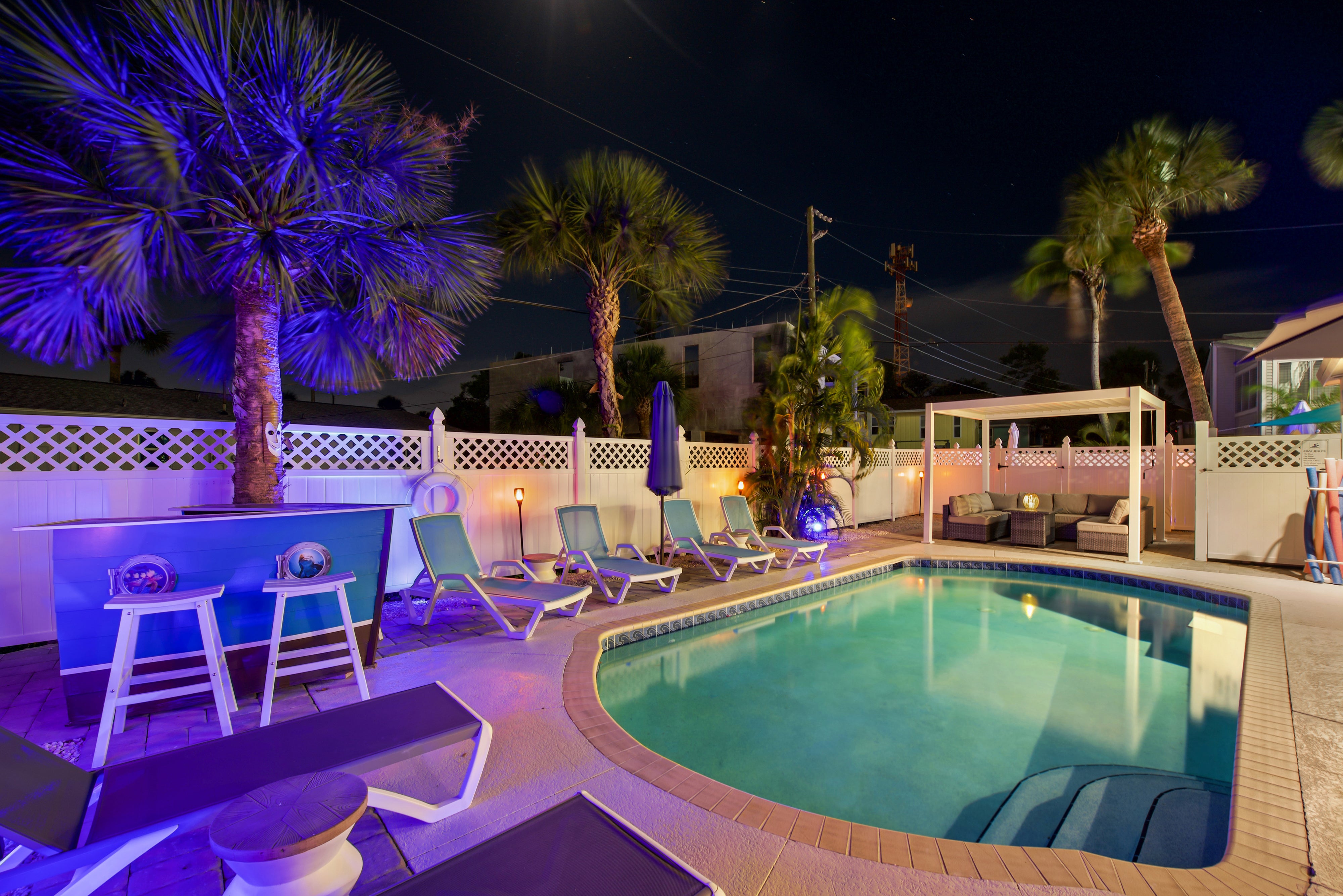 Welcome to Bluewaters Beach House. This 3 bed 3 bath home sleeps up to 10 guests comfortably. Located mid-island in Fort Myers Beach the beach access is a short walk from the home. Decorated in a modern coastal design, this home will have you relaxing as soon as you enter. The open floor plan allows guests to socialize easily no matter that they are doing. The beautiful wood hues of the kitchen mixed with stainless steel appliances bring warmth into the home. Plenty of seating for meals can be found inside and out with a breakfast nook, dining table, kitchen island, and lastly a large outdoor table on the patio. There is a full bathroom on the main level just off the living room. Upstairs there are all three bedrooms and one bathroom. There is a king bedroom, queen bedroom, and bunk room with two twin-over-twin bunk beds. Venturing outdoors guests will find another bathroom for the pool which has a shower and hooks to hang up towels and swimsuits. There is also a large conversation pit under a gazebo and plenty of lounge chairs around the pool. This fantastic home is fully stocked with all your beach and entertainment needs. Come visit Bluewaters Beach House today.