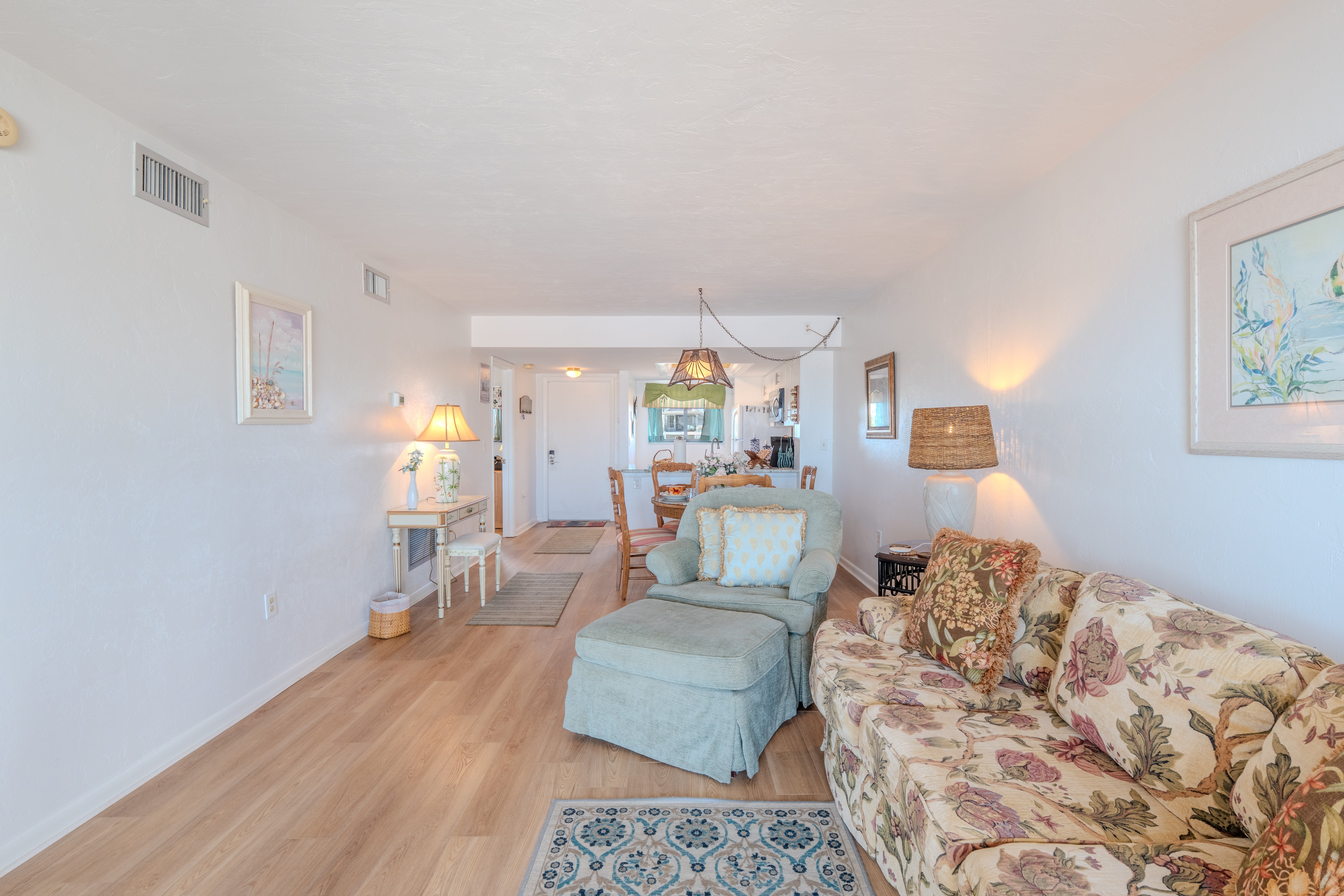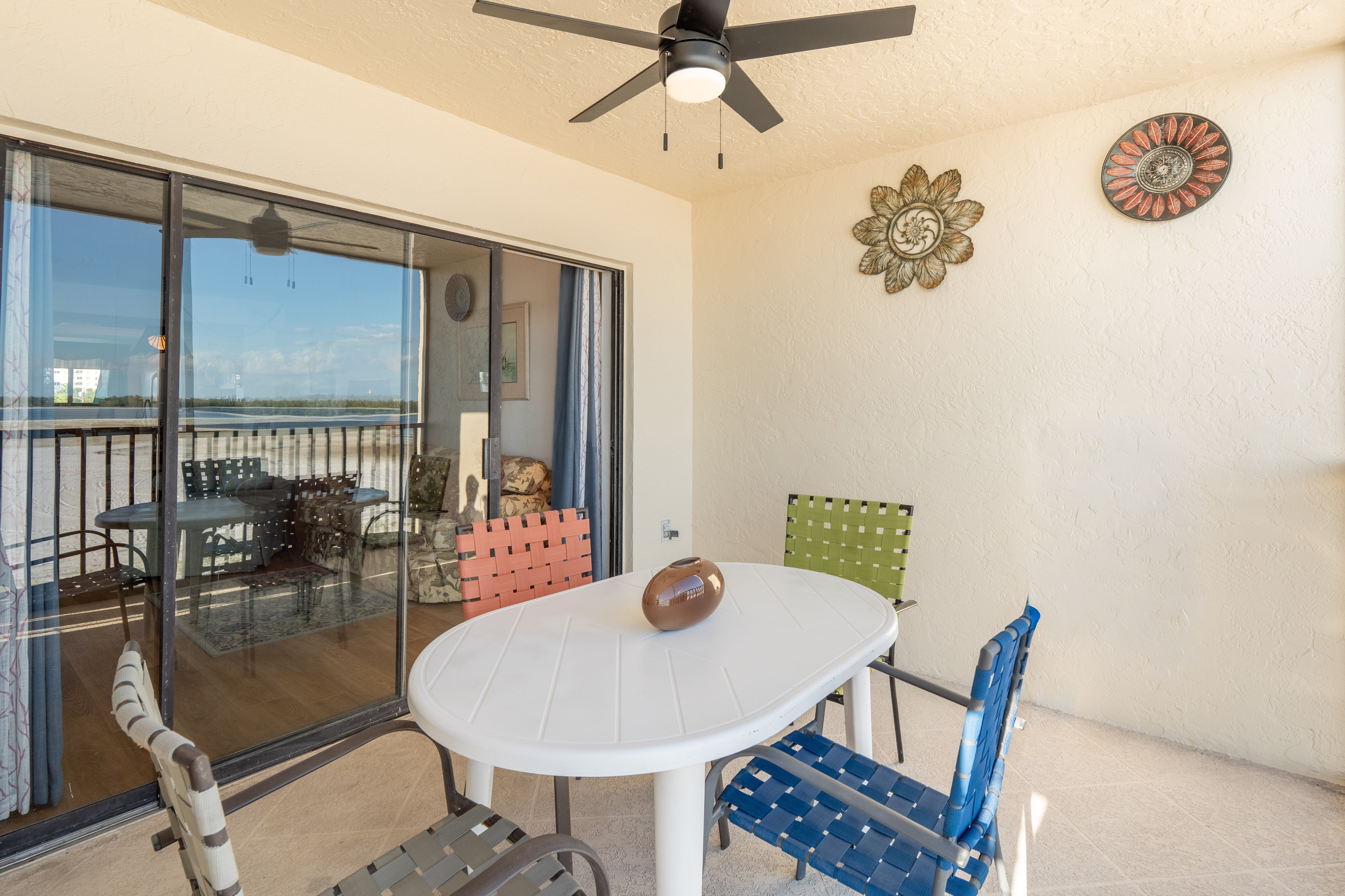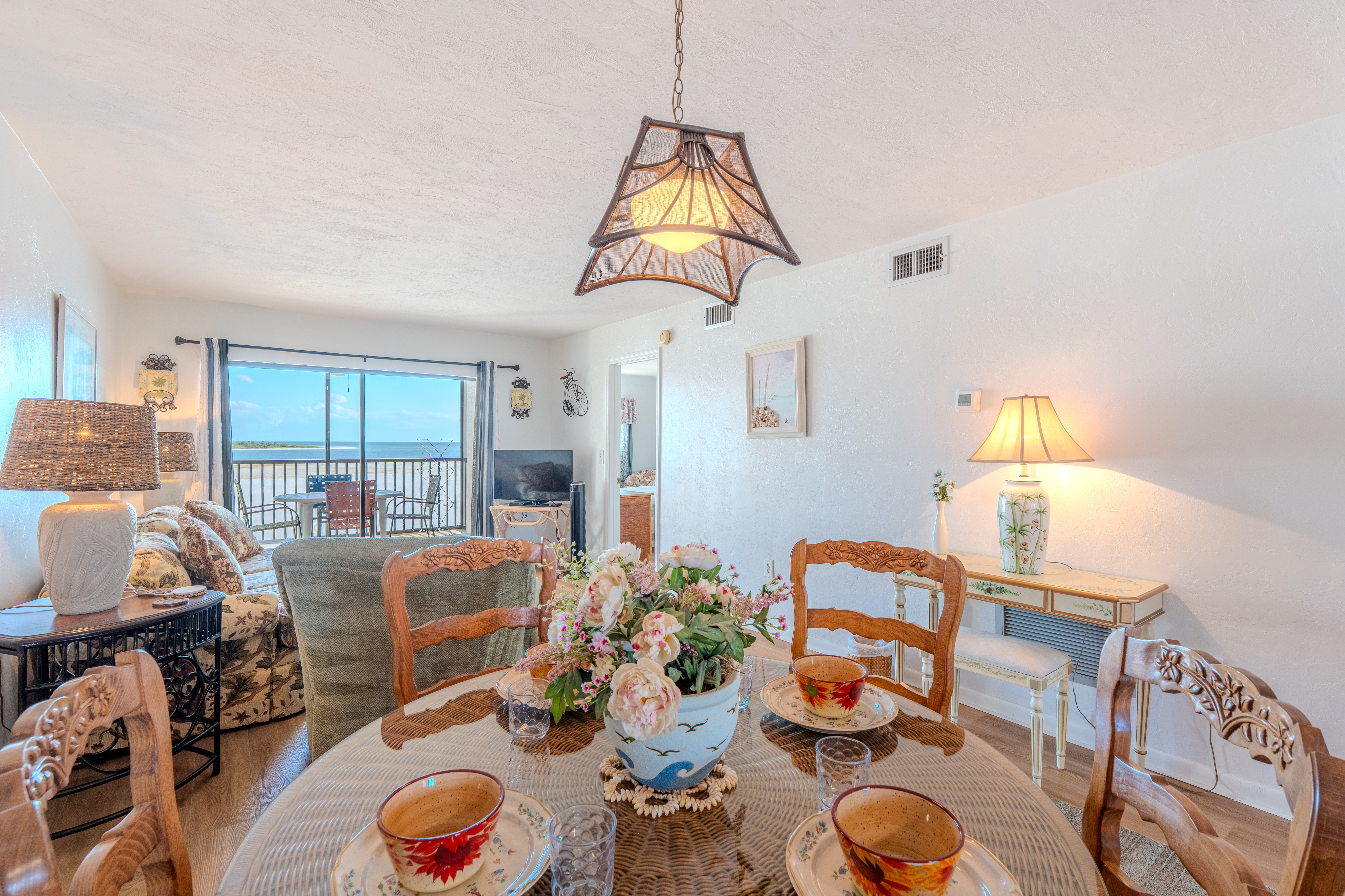 Welcome to Carlos Pointe #233 – a beautifully appointed 2-bedroom, 2-bath condo on the 2nd floor, offering stunning, direct beachfront views of the Gulf of Mexico. The open-concept kitchen flows seamlessly into the dining and living area, leading out to a spacious, screened-in lanai—perfect for relaxing and taking in the sweeping 180-degree views of Lovers Key and Big Carlos Pass. The well-equipped kitchen has everything you need to prepare your favorite meals, whether you're cooking for a quiet night in or entertaining guests. The master bedroom features a comfortable king-sized bed, while the guest room includes 1 Queen bed. For your convenience, there’s an in-unit washer and dryer. On the Gulf side of the property, you’ll enjoy a large community pool with cabanas, a hot tub, a ground-level game room, and bike storage. Your beachside escape awaits at Carlos Pointe #233!