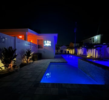 Coconut Villa A is a modern 2 bed 2 bath duplex with a coastal flair located in mid-island. Whip up a quick meal in the kitchen to take to the beach or unwind in the living room with a movie after a long day in the sun. The primary suite features a queen bed plus an en suite with a walk-in shower. The guest bedroom offers comfortable accommodations with a full over full bunk bed and their own stylish, updated bathroom. The backyard oasis features a state-of-the-art shared pool with a spillover spa and an outdoor TV, providing endless fun for all ages. Completing this home is a washer, dryer, and a grill for your added convenience. Make your reservations for Coconut Villa A today.