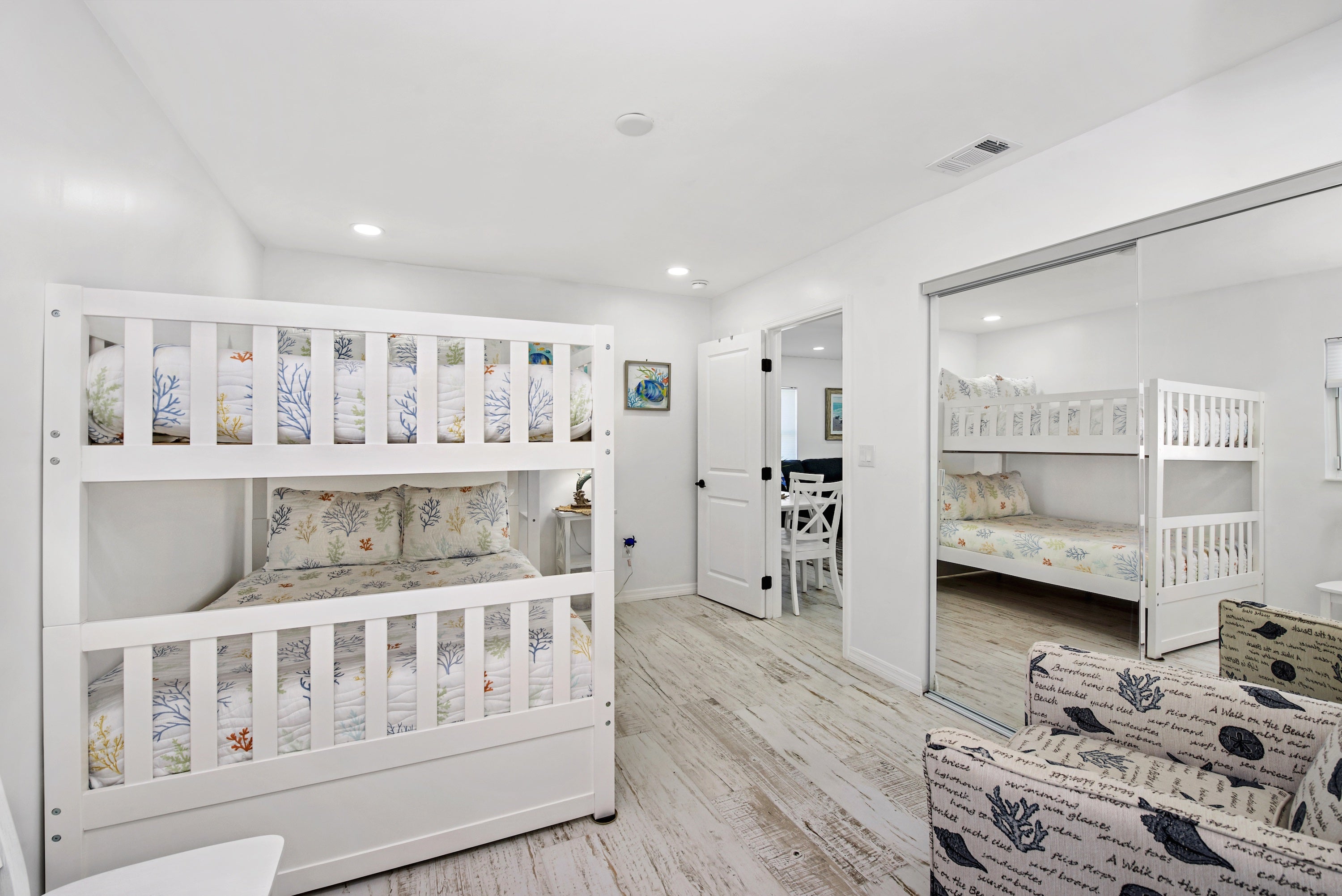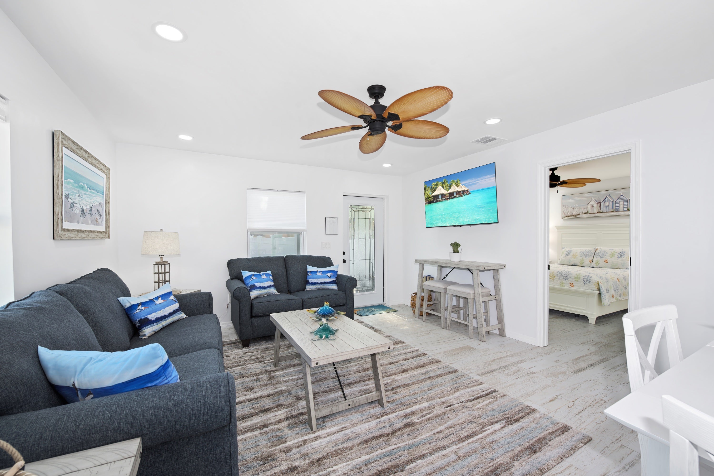 Coconut Villa B is a modern 2 bed 2 bath duplex with a coastal flair located in mid-island. Whip up a quick meal in the kitchen to take to the beach or unwind in the living room with a movie after a long day in the sun. The primary suite features a queen bed plus an en suite with a walk-in shower. The guest bedroom offers comfortable accommodations with a full over full bunk bed and their own stylish, updated bathroom. The backyard oasis features a state-of-the-art shared pool with a spillover spa and outdoor TV, providing endless fun for all ages. Completing this home is a washer, dryer, and a grill for your added convenience. Make your reservations for Coconut Villa B today.