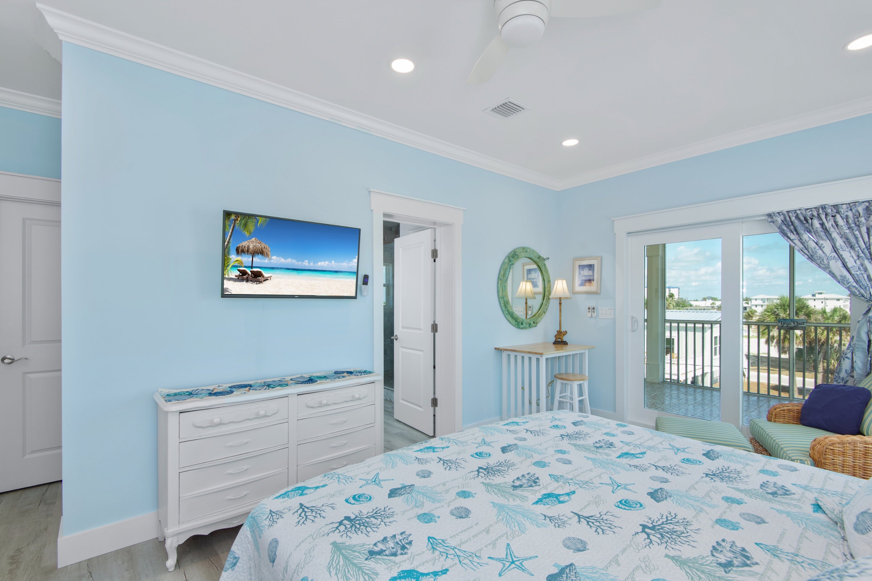 Upstairs, you’ll find three more bedrooms. Two feature King Beds, and the fourth is a bunk room with two Twin-over-Twin Bunkbeds, perfect for kids or extra guests. The upstairs primary King bedroom has a private en-suite bath with a tub/shower combo, its own balcony overlooking the pool, and a relaxing setup complete with four yoga mats and cozy seating. Bonus: enjoy your own coffee and tea bar with a mini fridge in this suite!