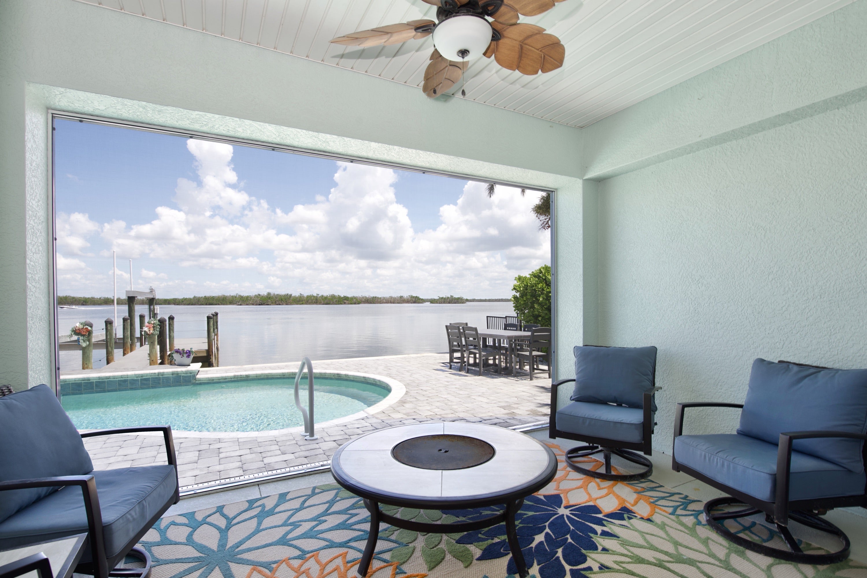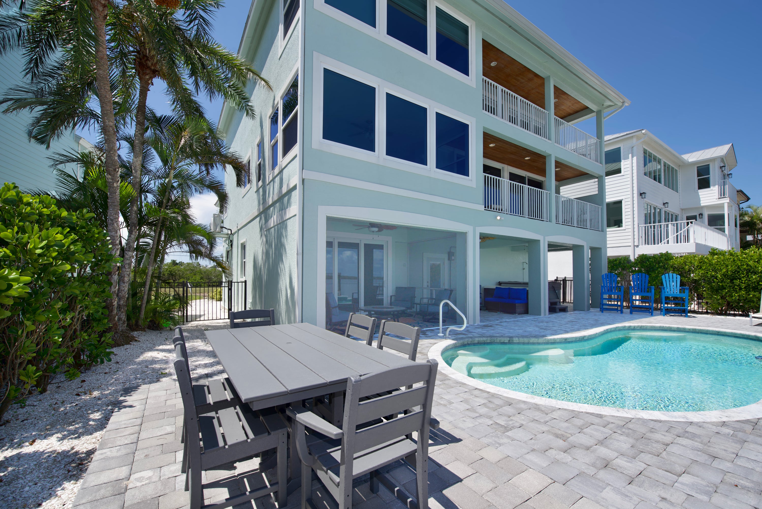"We absolutely loved the views from the backyard. Dolphins even swim up near the dock. 8-12 minute walk to the beach depending on your pace. Everything is so clean and organized. Pool towels, toys, floats, coolers, etc. The kitchen is fully stocked beyond the typical amount. Everyone enjoyed the pool everyday and night. We were a group of 6 people ages 10-64 and everyone enjoyed everything about the space. We definitely plan to go again."