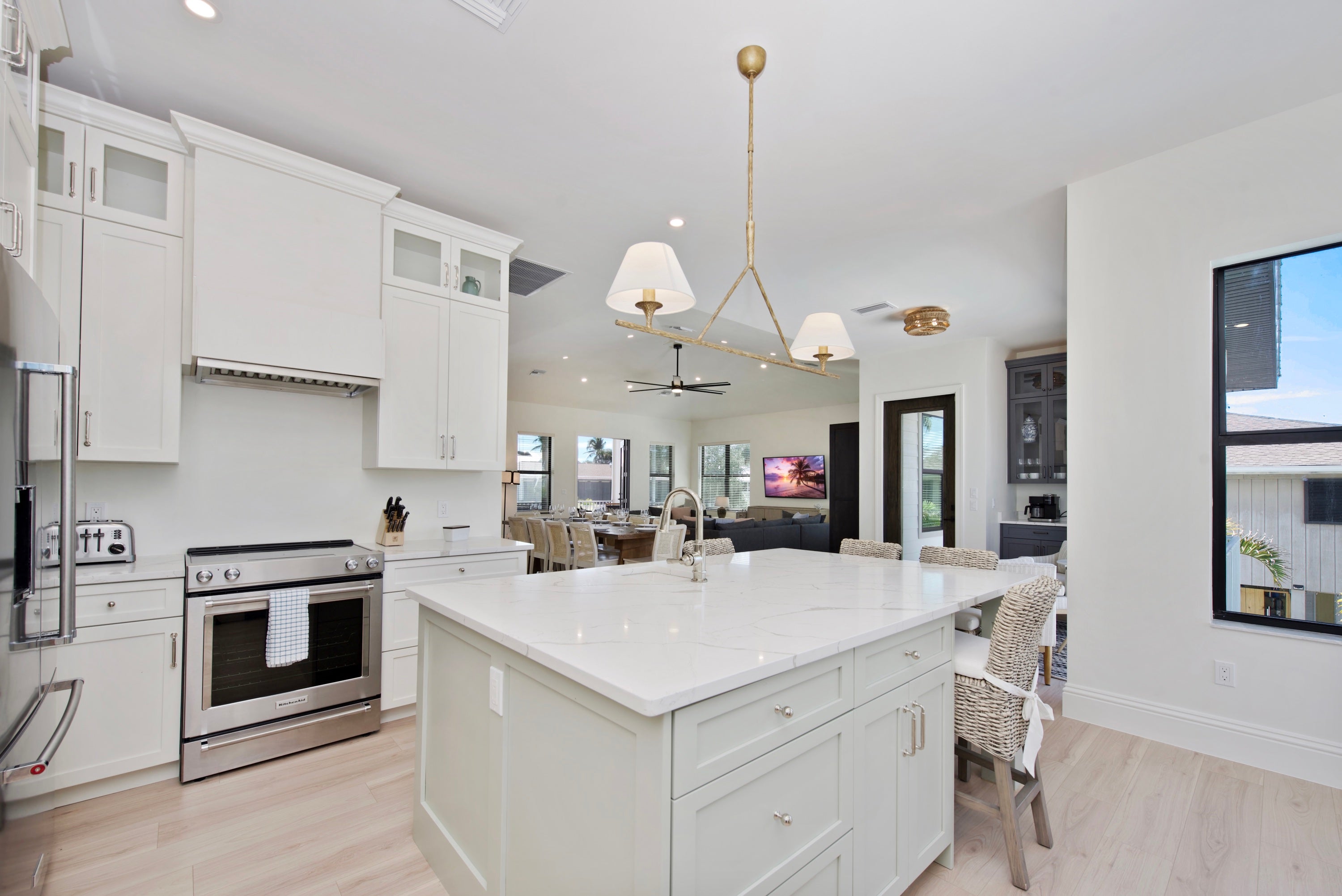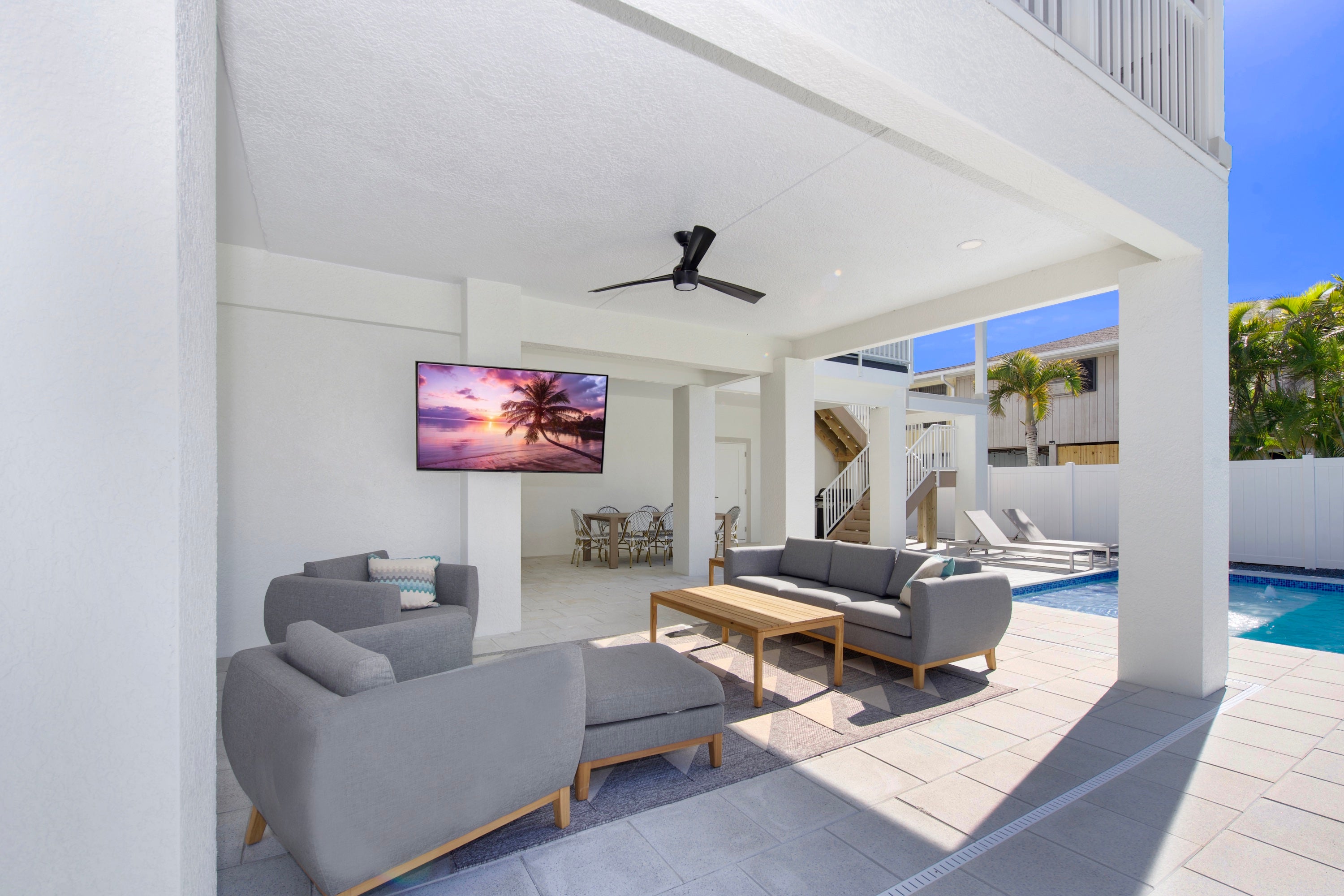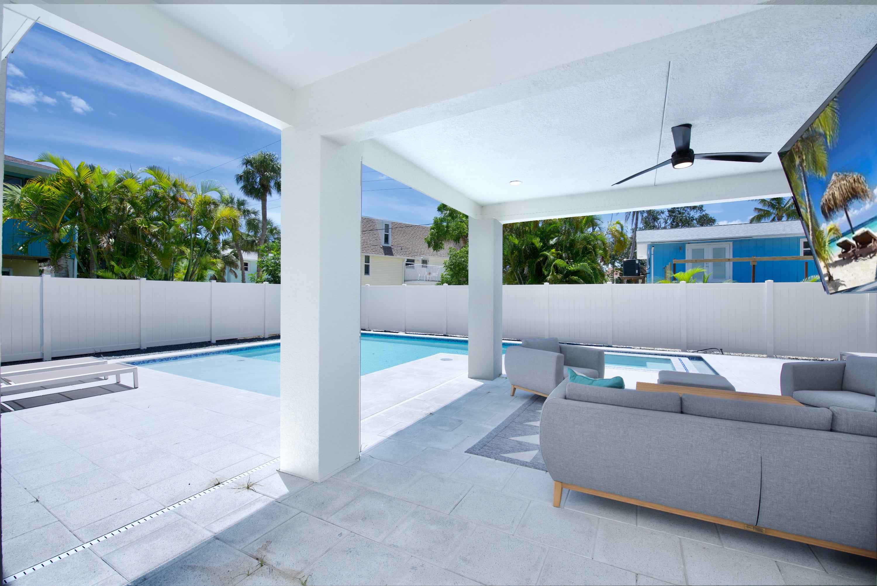* owner does have a camera on the pool equiptment Come relax in luxury at Funky Conch. This breathtaking 5 bedroom home is located Mid-Island and features a fabulous pool with spill-over-spa, relaxing outdoor living space with TV, and is an easy walk to the beach. Upon entering the home, you are greeted by vaulted, 14-foot ceilings, oversized TV, and sectional that comfortably entertains 20+ people. The kitchen is fully equipped with everything you need including state-of-the-art appliances, to make a gourmet meal or just easy meals on the run. A large dining table seats 10, plus 4 bar stools are at the quartz island allows everyone to eat together. There’s a dedicated coffee bar and wine cooler adjacent to the kitchen and a second fridge on the lower level provides ample space for extra food storage, making it easy to cater to large groups or extended stays. The open living area has nesting sliding doors that lead out to over 700 SF of additional living space outdoors and an amazing pool area, complete with outdoor seating and an oversized outdoor flat screen tv to catch your favorite team or movie in the evenings by the pool. There is also an outdoor bathroom for your convenience while you enjoy all the outdoor amenities. Each bedroom in this residence is a private sanctuary, boasting its own en suite. The two primary suites feature double vanities and ample space for family conveniences such as pack-and-plays (not provided) and convertible twin beds for children (2 included). If your vacation requires balancing leisure with work, our home features a private office that doubles as a kids' playroom, equipped with a queen sleeper sofa for additional sleeping arrangements. There is a half bath off the kitchen and an additional half bath off the pool. Finishing off the home is an outdoor shower, washer and dryer, and plenty of board games. Come see why the Funky Conch will be a favorite for years to come.