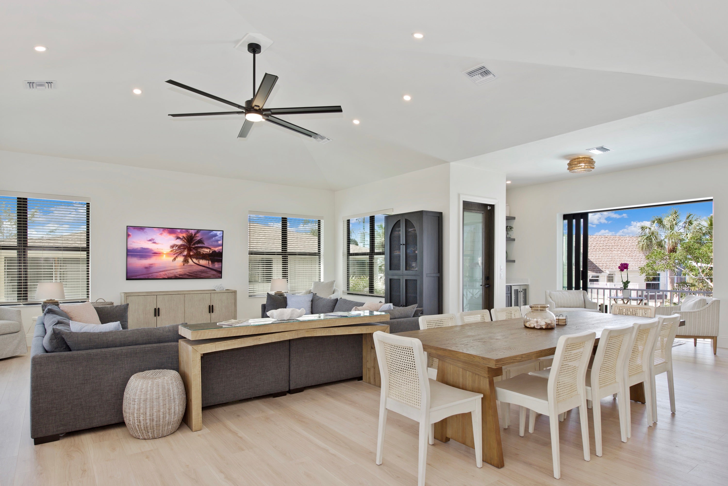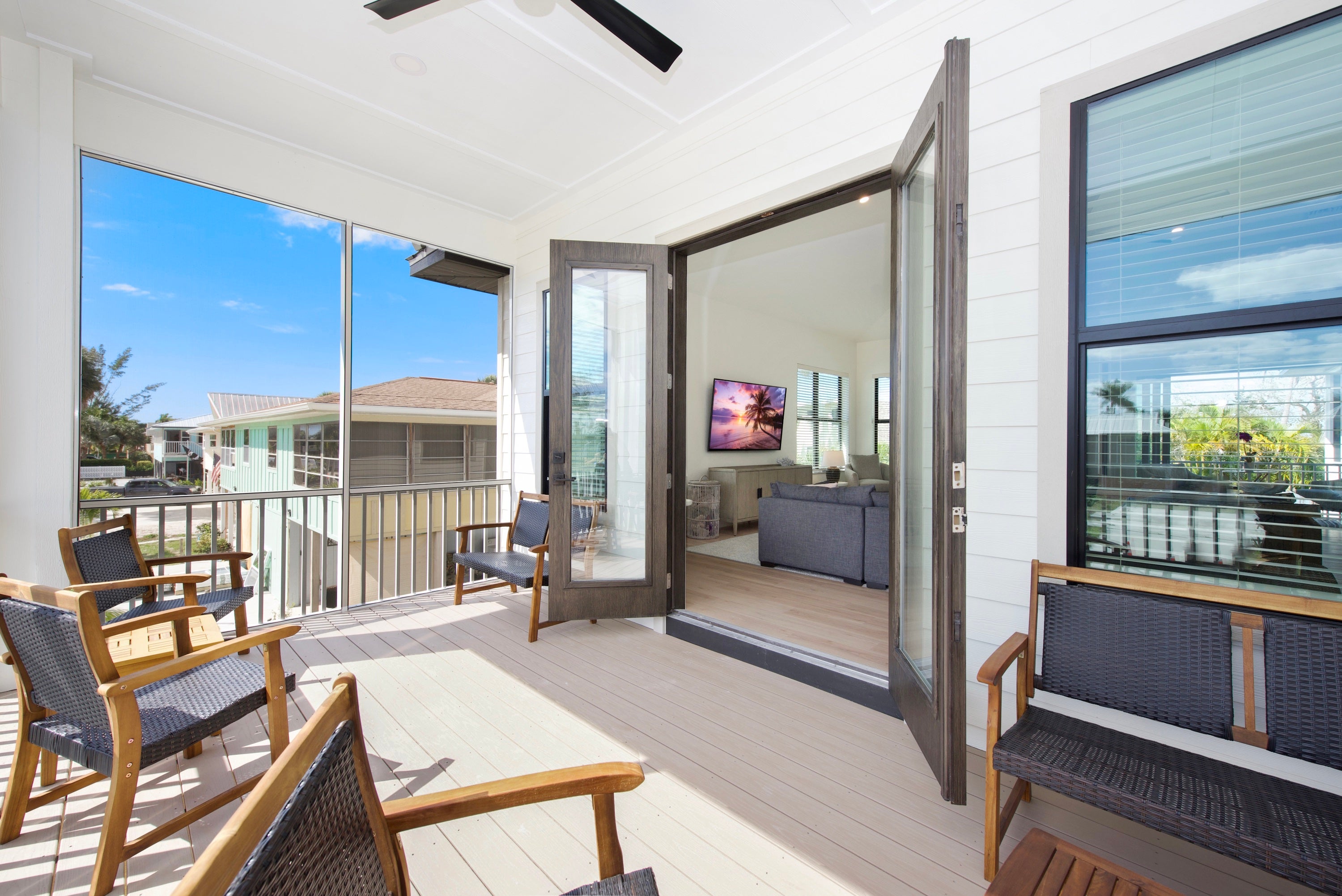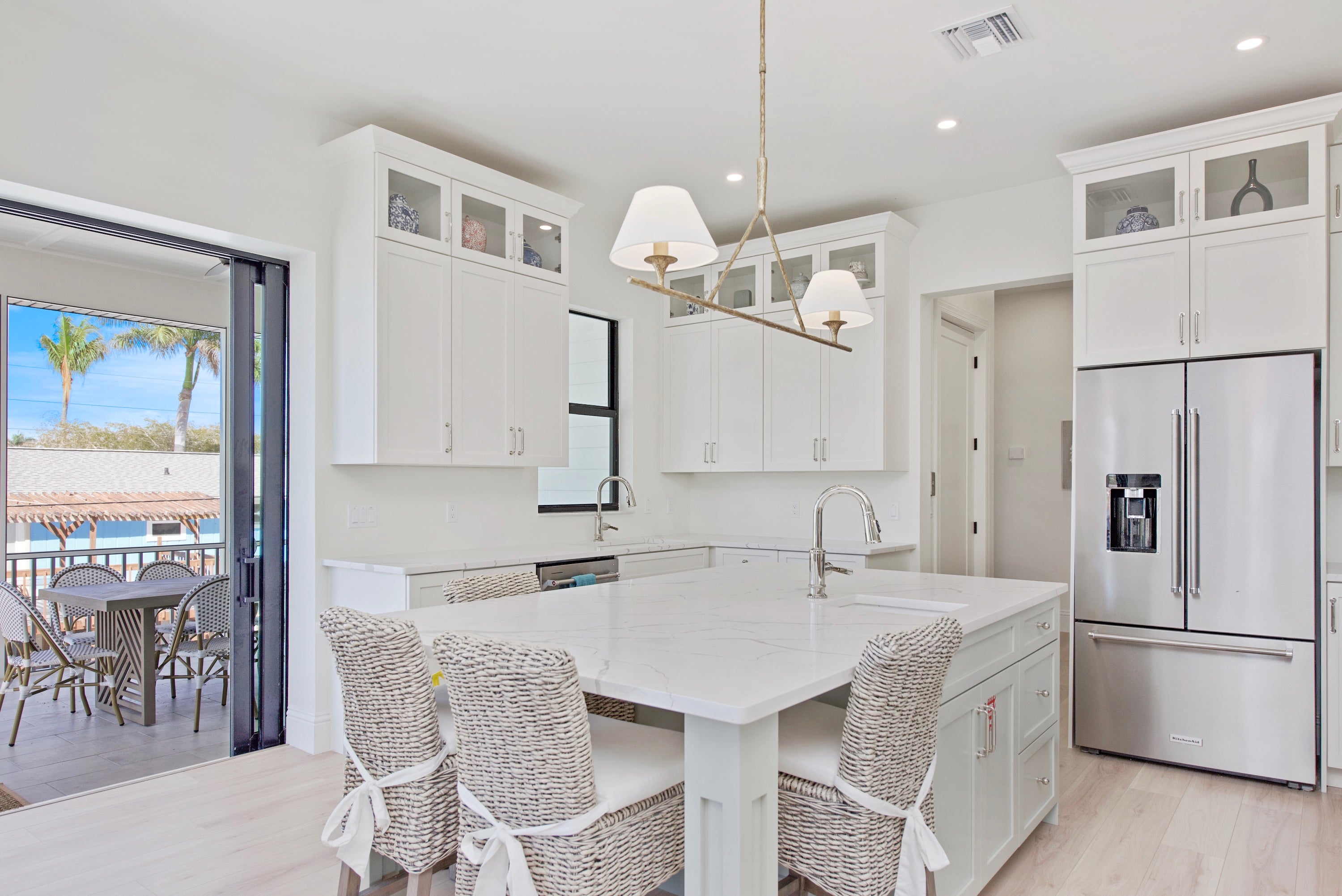 * owner does have a camera on the pool equiptment Come relax in luxury at Funky Conch. This breathtaking 5 bedroom home is located Mid-Island and features a fabulous pool with spill-over-spa, relaxing outdoor living space with TV, and is an easy walk to the beach. Upon entering the home, you are greeted by vaulted, 14-foot ceilings, oversized TV, and sectional that comfortably entertains 20+ people. The kitchen is fully equipped with everything you need including state-of-the-art appliances, to make a gourmet meal or just easy meals on the run. A large dining table seats 10, plus 4 bar stools are at the quartz island allows everyone to eat together. There’s a dedicated coffee bar and wine cooler adjacent to the kitchen and a second fridge on the lower level provides ample space for extra food storage, making it easy to cater to large groups or extended stays. The open living area has nesting sliding doors that lead out to over 700 SF of additional living space outdoors and an amazing pool area, complete with outdoor seating and an oversized outdoor flat screen tv to catch your favorite team or movie in the evenings by the pool. There is also an outdoor bathroom for your convenience while you enjoy all the outdoor amenities. Each bedroom in this residence is a private sanctuary, boasting its own en suite. The two primary suites feature double vanities and ample space for family conveniences such as pack-and-plays (not provided) and convertible twin beds for children (2 included). If your vacation requires balancing leisure with work, our home features a private office that doubles as a kids' playroom, equipped with a queen sleeper sofa for additional sleeping arrangements. There is a half bath off the kitchen and an additional half bath off the pool. Finishing off the home is an outdoor shower, washer and dryer, and plenty of board games. Come see why the Funky Conch will be a favorite for years to come.