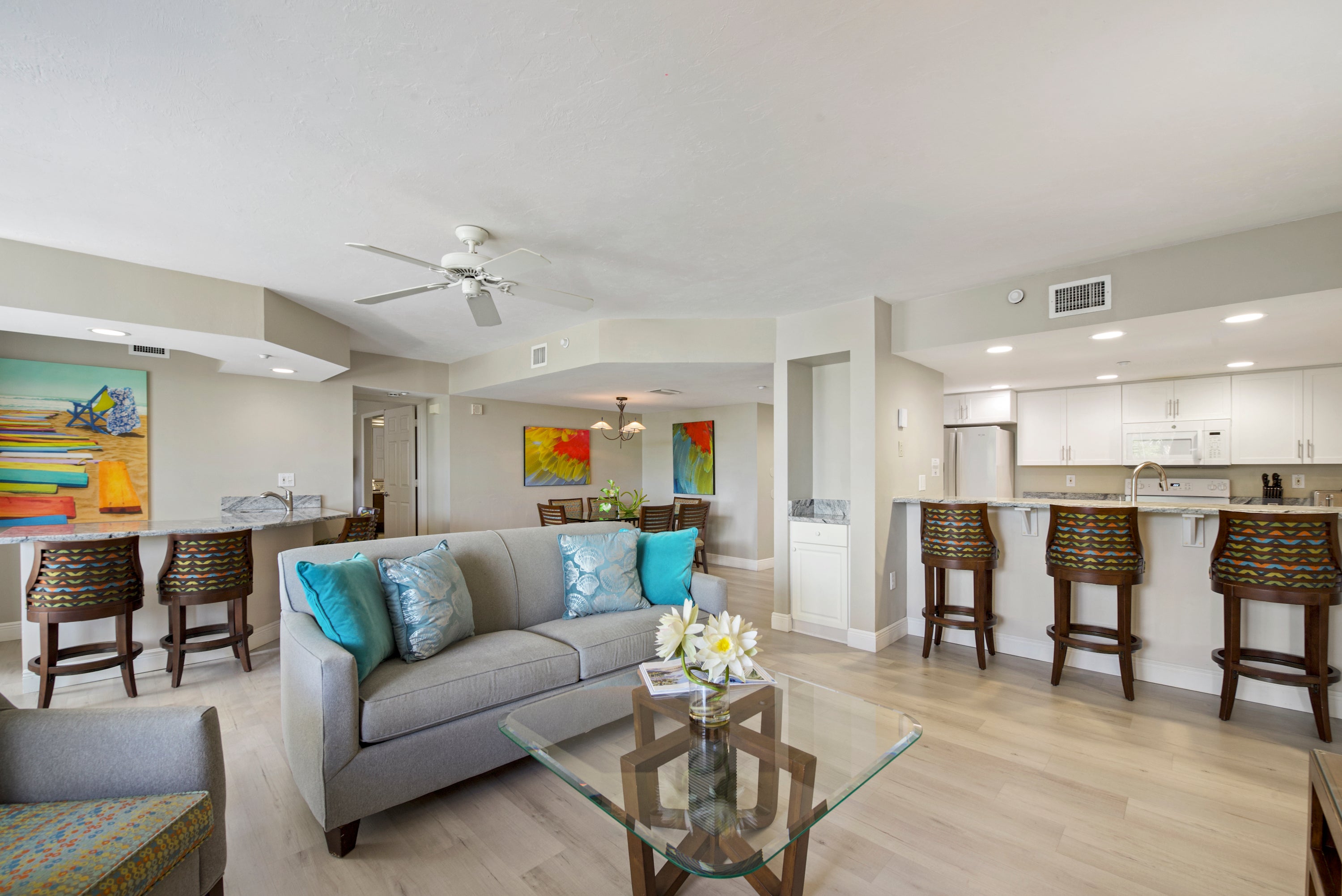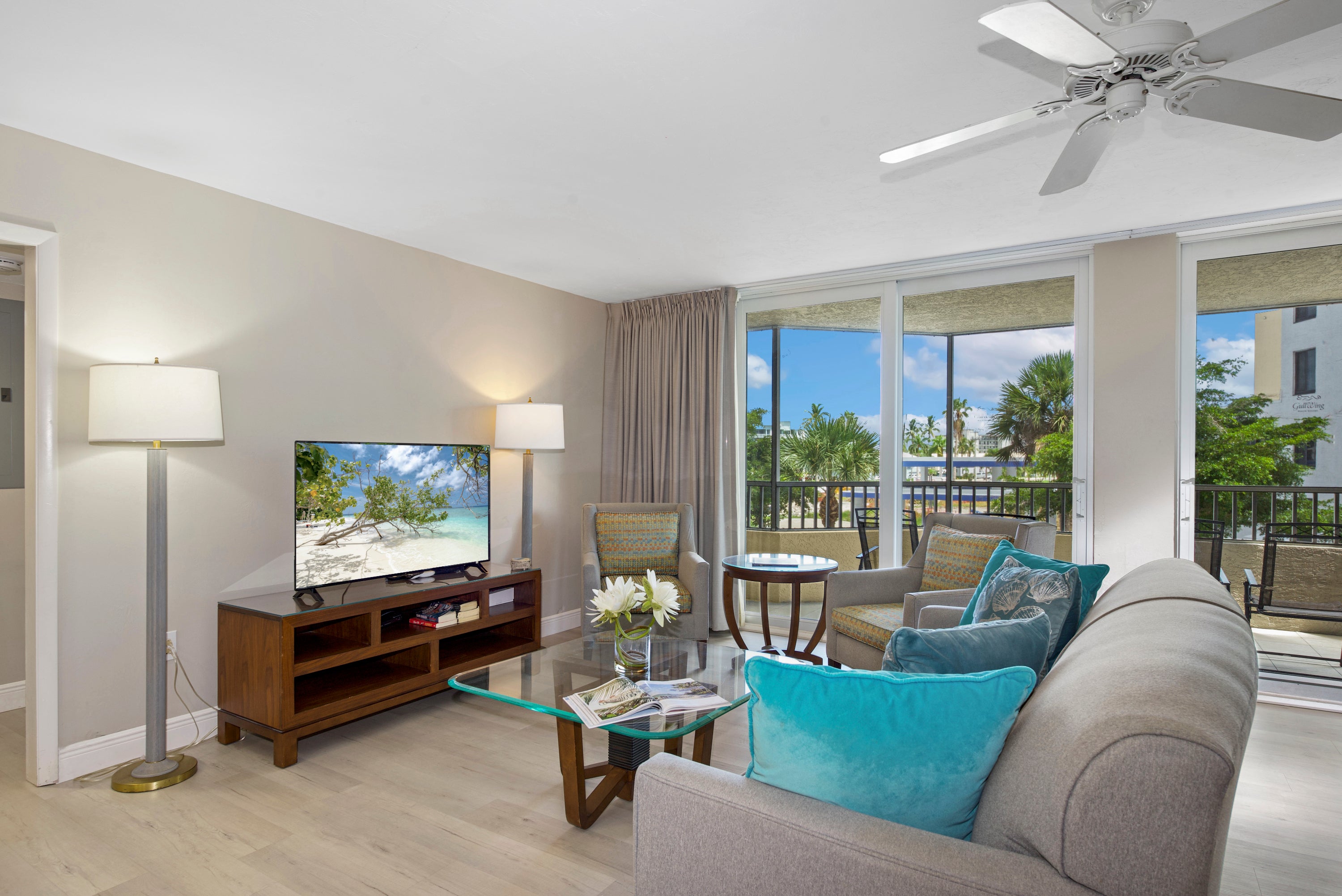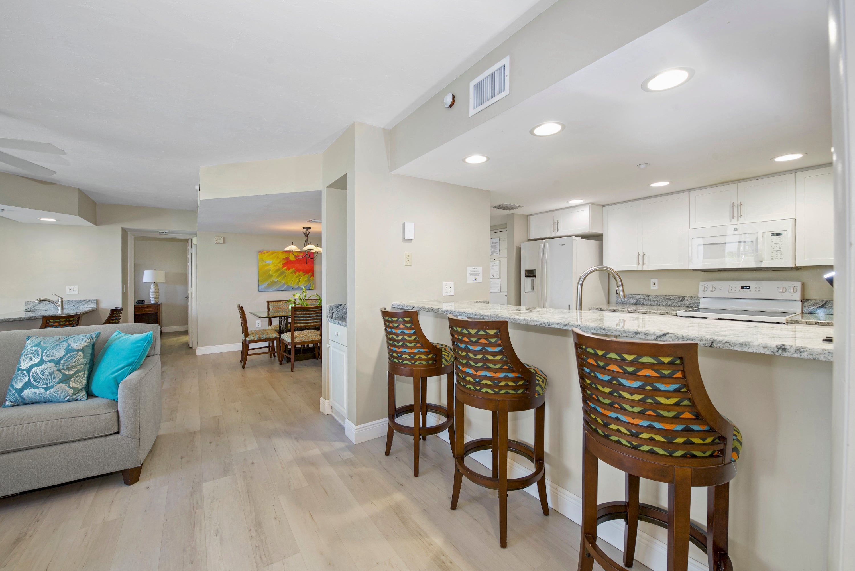 Come make lasting memories at Gullwing #203. This gorgeous 2-bedroom 2 bath condo offers a partially obstructed view of the Gulf from the screened lanai. A spacious open floor plan includes a living area with a large flat screen TV, built-in bar with seating for four, a dining table with seating for six, and a beautiful galley kitchen with breakfast bar. A wall of sliding glass doors allows light to pour into the space enhancing the new flooring and artwork. Relax in the primary suite on a king bed with access to the lanai and TV. The large, attached bath includes dual sinks, garden tub, and walk-in shower. On the opposite side of the condo is the guest bedroom with a queen bed, TV, and balcony access. Attached to the bedroom is the bathroom with walk-in shower. Come find out why Gullwing #203 will have you want to keep returning year after year.