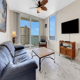 The open floor plan is perfect for entertaining guests, while the adjoining dining area provides additional space for dining in comfort. The master bedroom is a peaceful haven, featuring a king-sized bed with luxurious linens and expansive windows offering unparalleled views of the beach and water. The en-suite bathroom is elegant and spacious, with a large vanity, and shower/bath combo. For additional sleeping arrangements, the living room includes a sleeper sofa, allowing the condo to comfortably accommodate up to four guests. Whether you’re looking for a vacation getaway, a seasonal rental, or a year-round home, Lovers Key #806 offers the ultimate in beachside living.