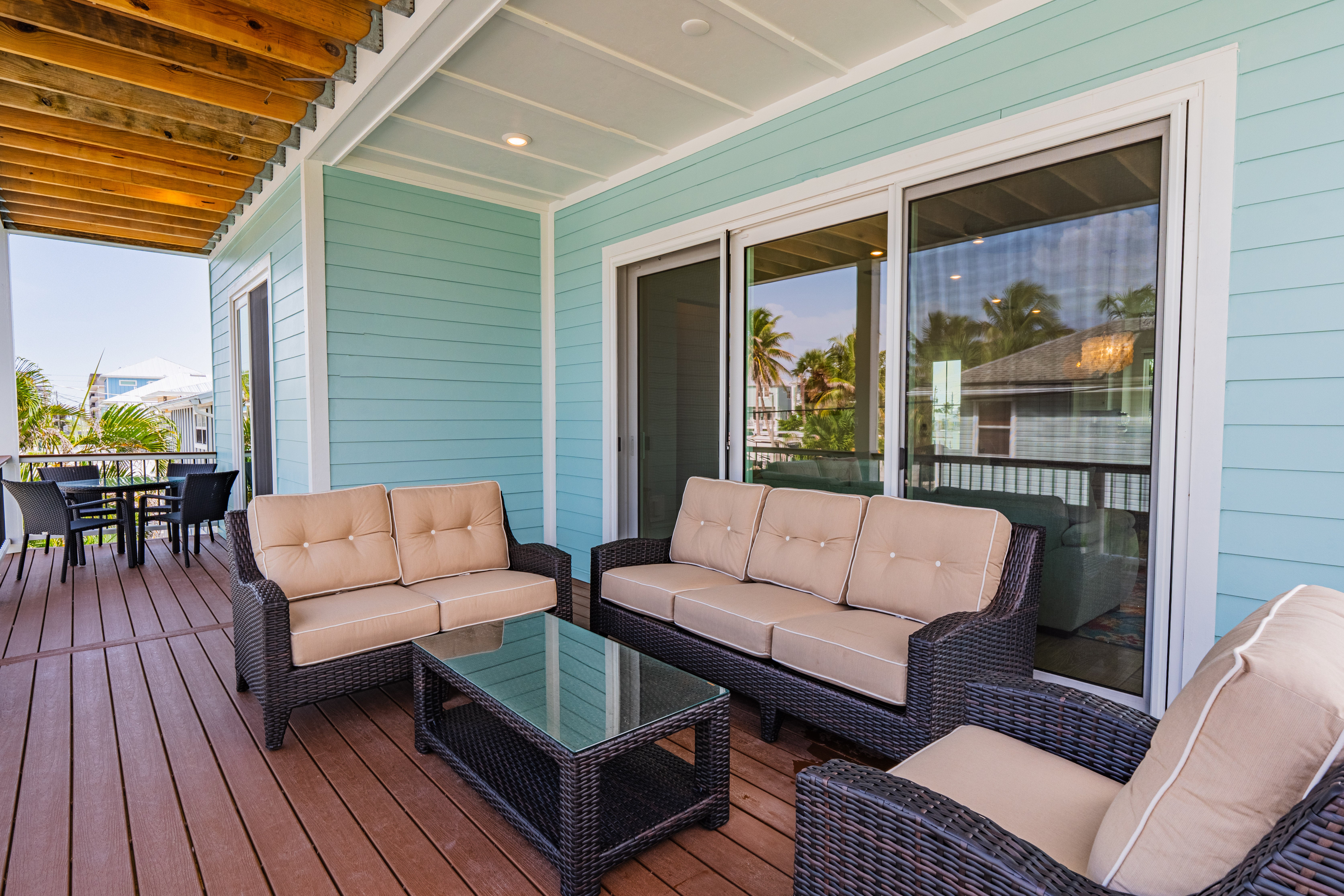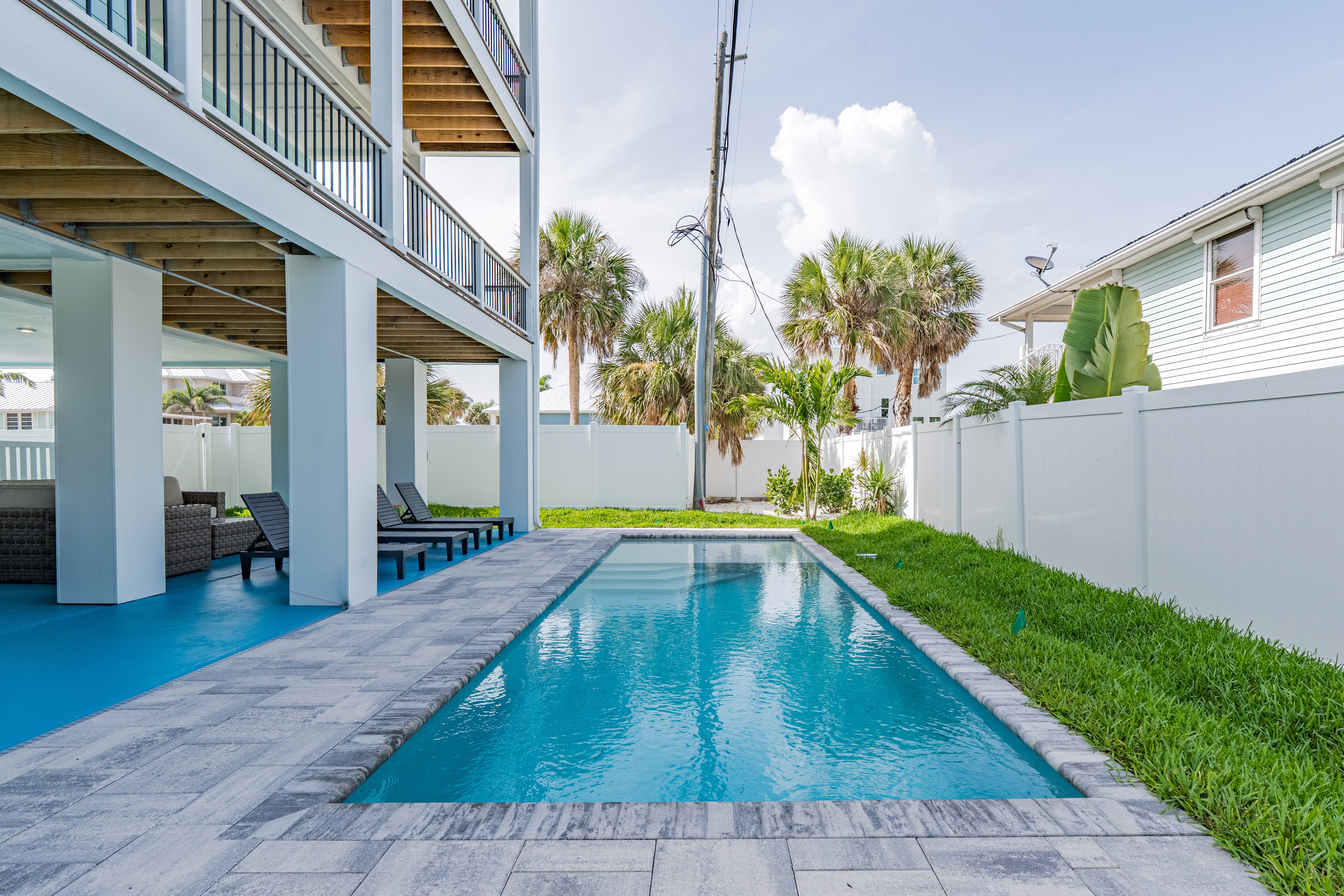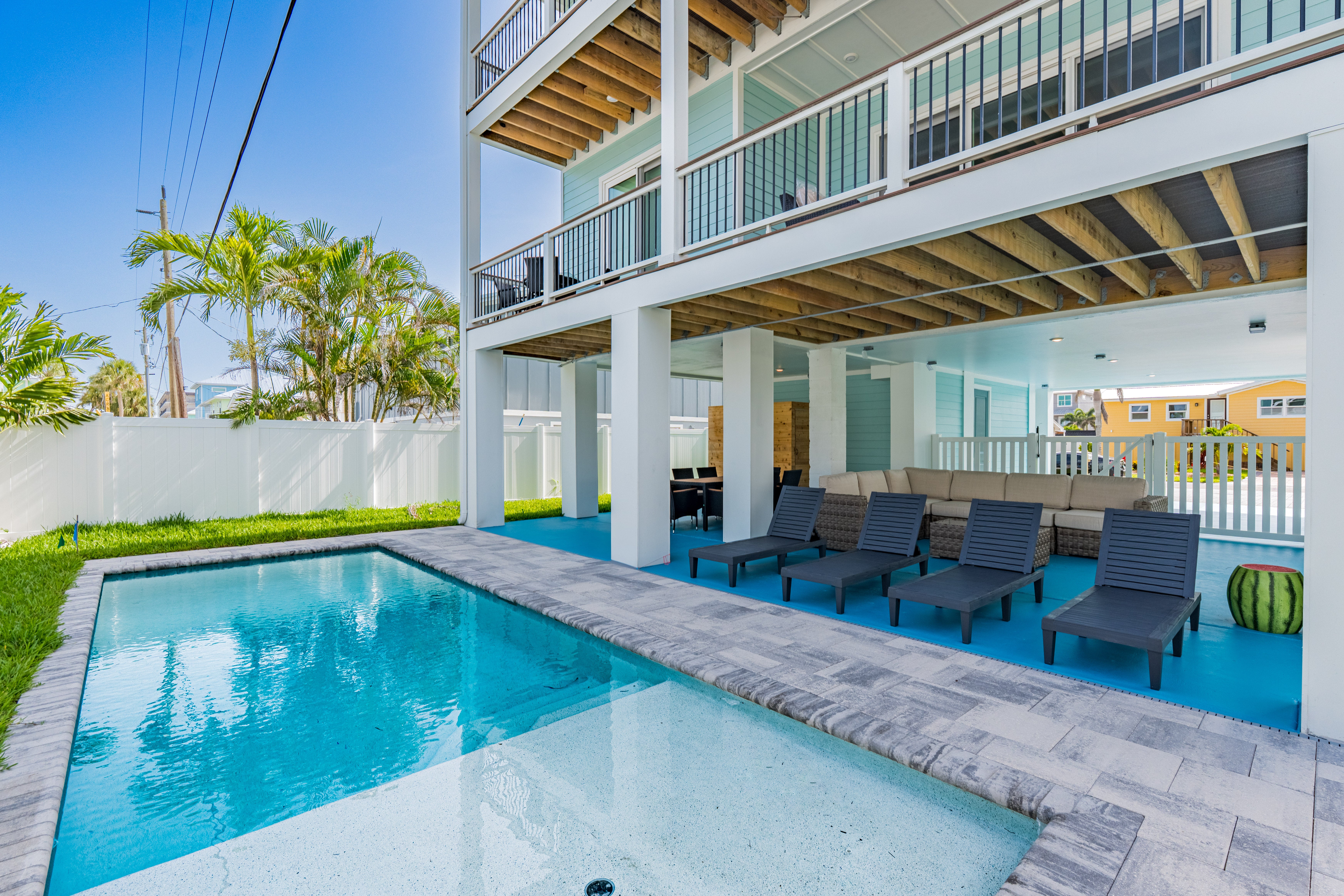 Step outside to your private tropical paradise—a gorgeous pool area with tons of seating, perfect for lounging in the sun, sipping a cocktail, or gathering with friends and family for poolside laughs. Prefer a quieter moment? Head up to the balcony, where you can sip your morning coffee or enjoy a sunset glass of wine with a gentle ocean breeze.