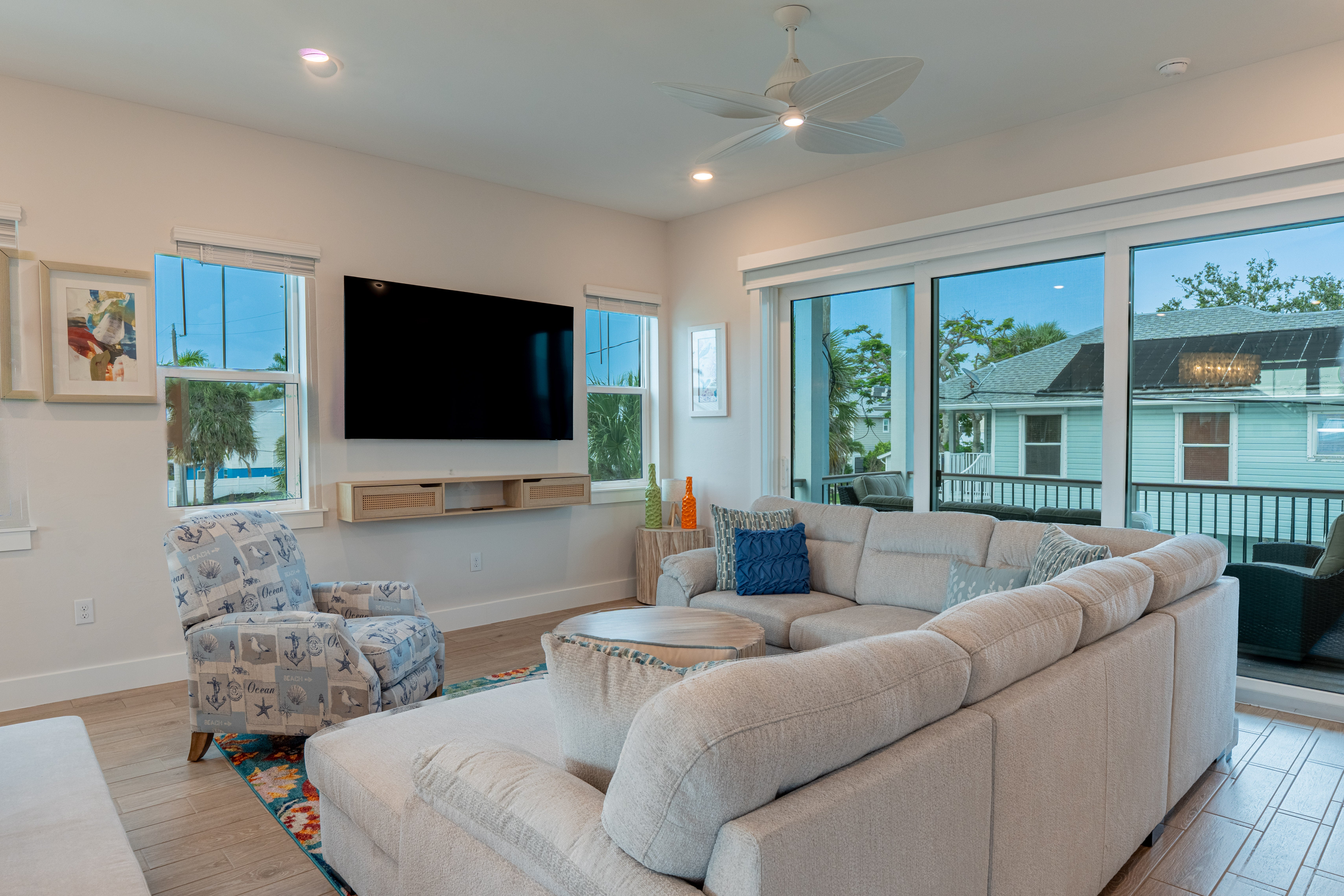 Inside, you'll find bright, airy spaces filled with modern coastal décor, plush furnishings, and plenty of room for everyone to spread out and unwind. Whether you're cooking a family meal in the sleek, fully equipped kitchen or kicking back in the spacious living area, you'll feel right at home.
