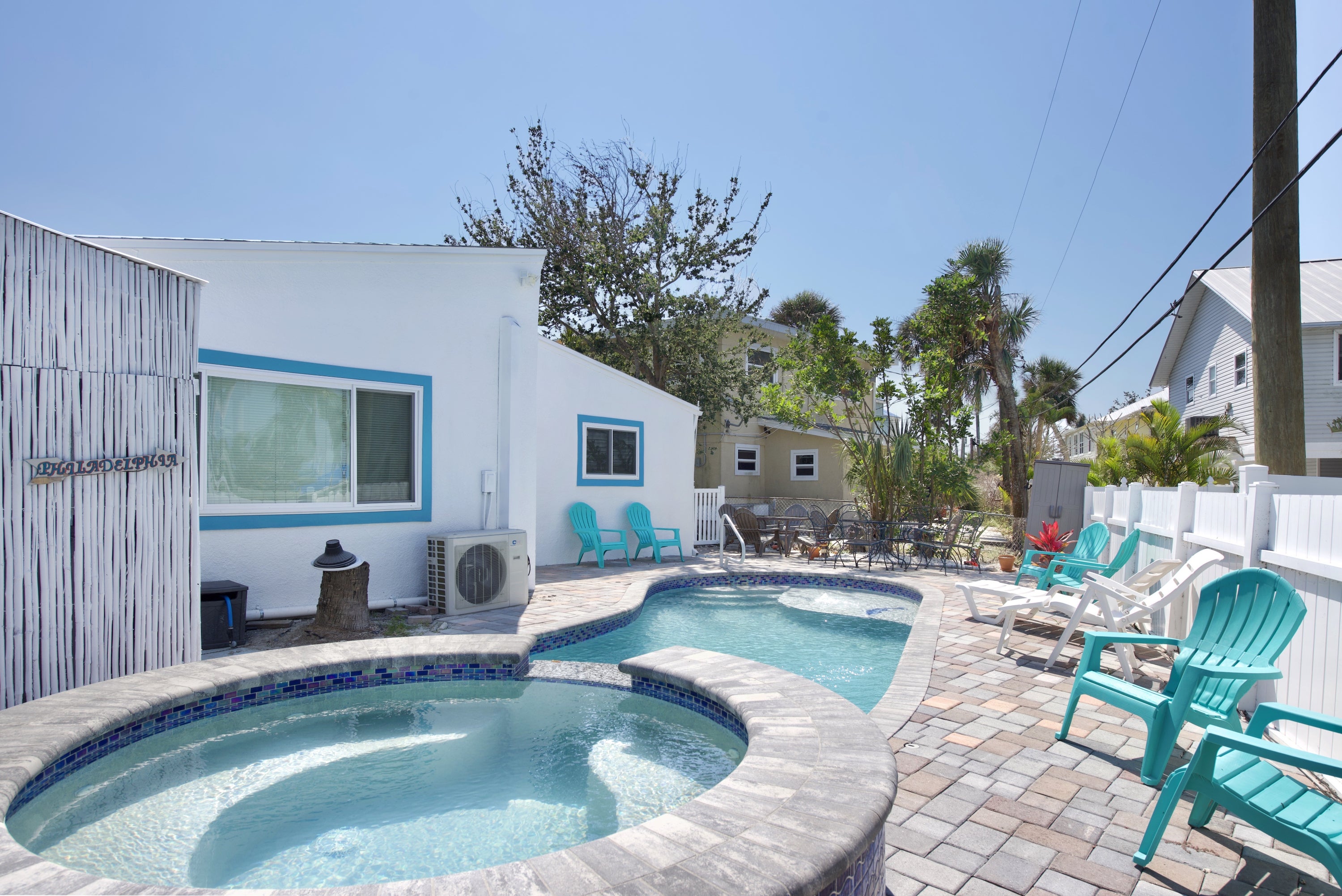 Mermaid Tales is a multi-family complex that features 6 separate villas. Villas are available to rent separately or as a group. This complex shares a heated pool with a spill over spa, corn hole, and horseshoes are available for added entertainment. There are 12 beach chairs available for guests that are on a “first come, first serve” basis and are not assigned to any specific unit. The short walk to the beach is only 530 yards away. Times Square is less than a mile from the complex. Guests can find entertainment, shopping, and dining all within the Times Square area.