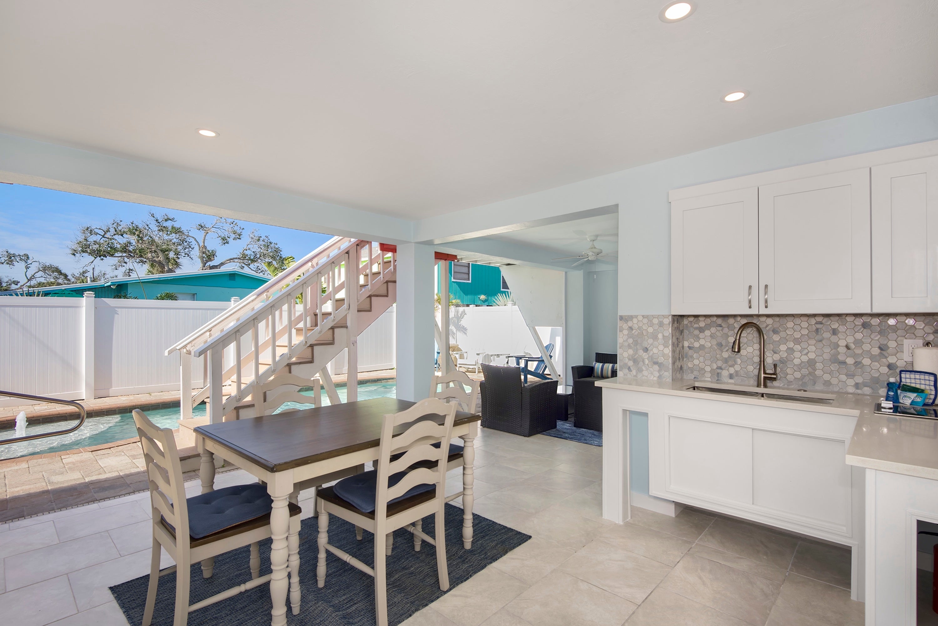"We stayed here with our adult kids and had a great experience. We were pleased with how well stocked the kitchen was and towels specifically for the pool. It was very clean and instructions for arrival and departure were easy and clear. Loved the outdoor living area. Would have liked some extra wash clothes. It was slightly inconvenient that everyone had to go thru a bedroom to get to the pool unless you exited out the front door and went around the side."