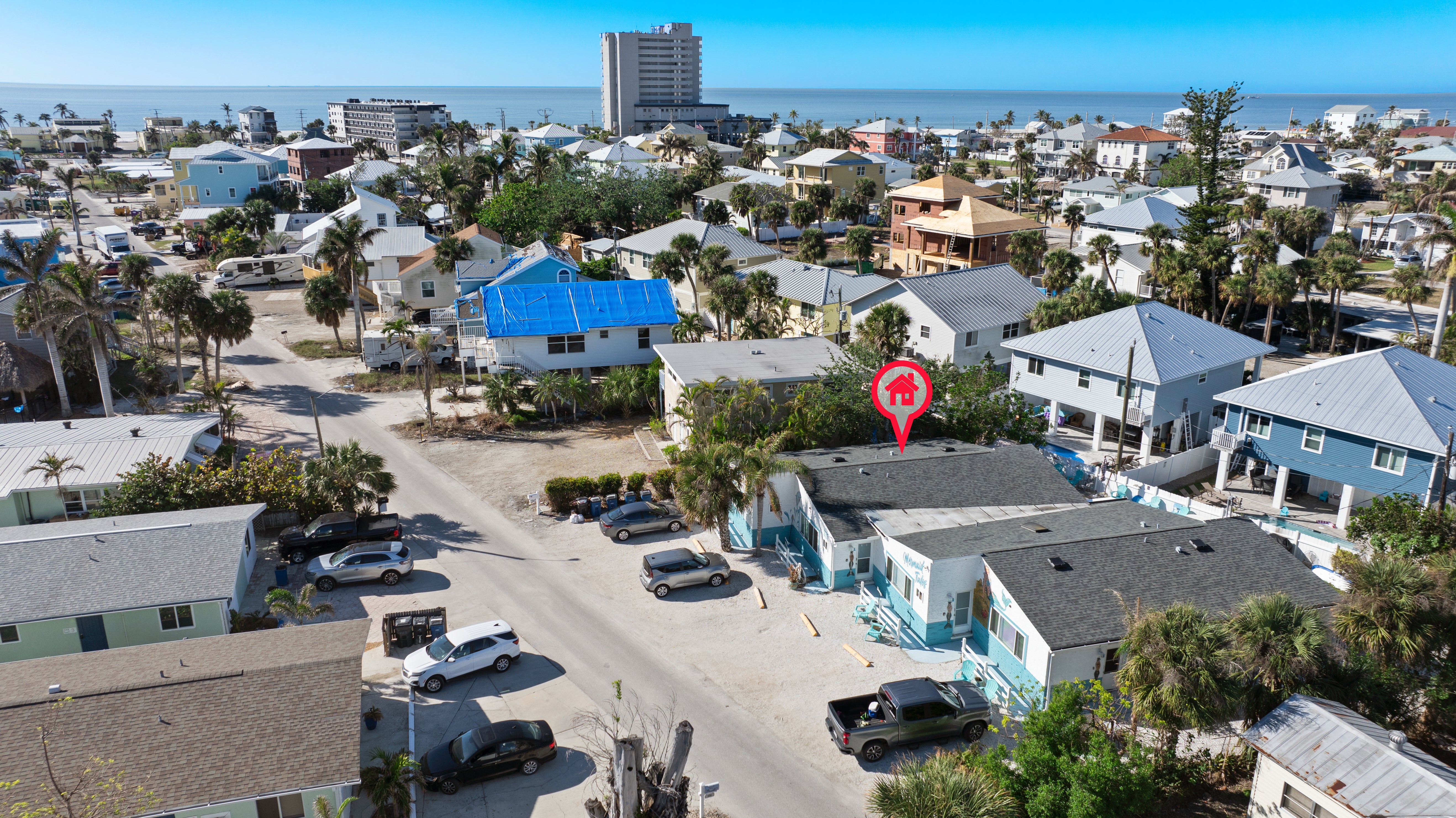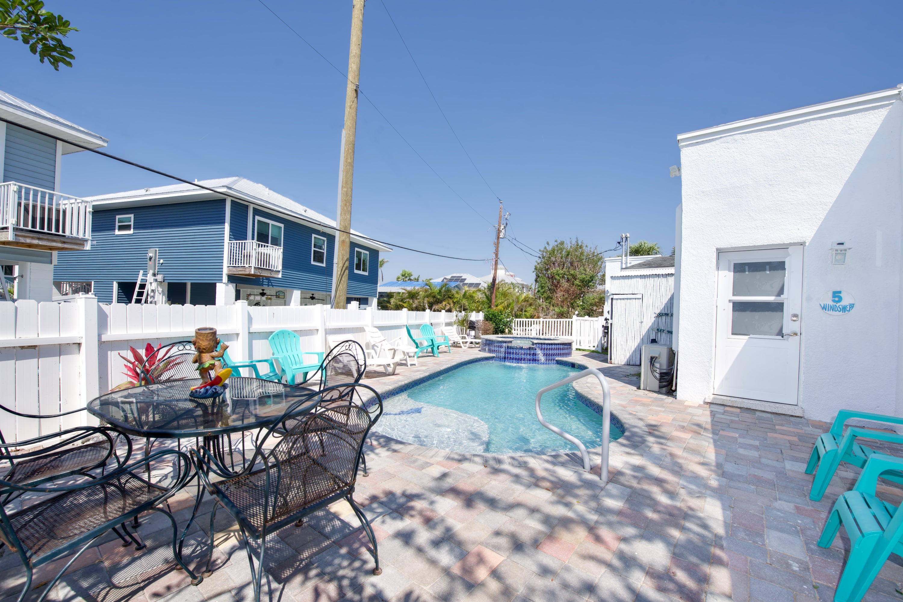 Mermaid Tales is a multi-family complex that features 6 separate villas. Villas are available to rent separately or as a group. This complex shares a heated pool with a spill over spa, corn hole, and horseshoes are available for added entertainment. There are 12 beach chairs available for guests that are on a “first come, first serve” basis and are not assigned to any specific unit. The short walk to the beach is only 530 yards away. Times Square is less than a mile from the complex. Guests can find entertainment, shopping, and dining all within the Times Square area.