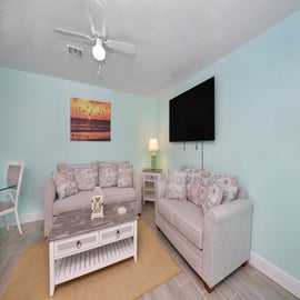 Welcome to Mermaid Tales #1- Coconut Cove. This beautiful 1 bedroom offers a queen bed, ensuite with walk-in shower, also a sleeper sofa in the living room. Calming coastal hues throughout assist in relaxation after a full day in the sun at the beach or around the pool. Curl up at the end of the day on the couch with a good movie. No need to dine out as there is a fully equipped kitchen available, or grab take out and eat around the table. Guests have access to the complex pool, shared washer and dryer, and other complex activities. Come make your favorite memories at Coconut Cove.