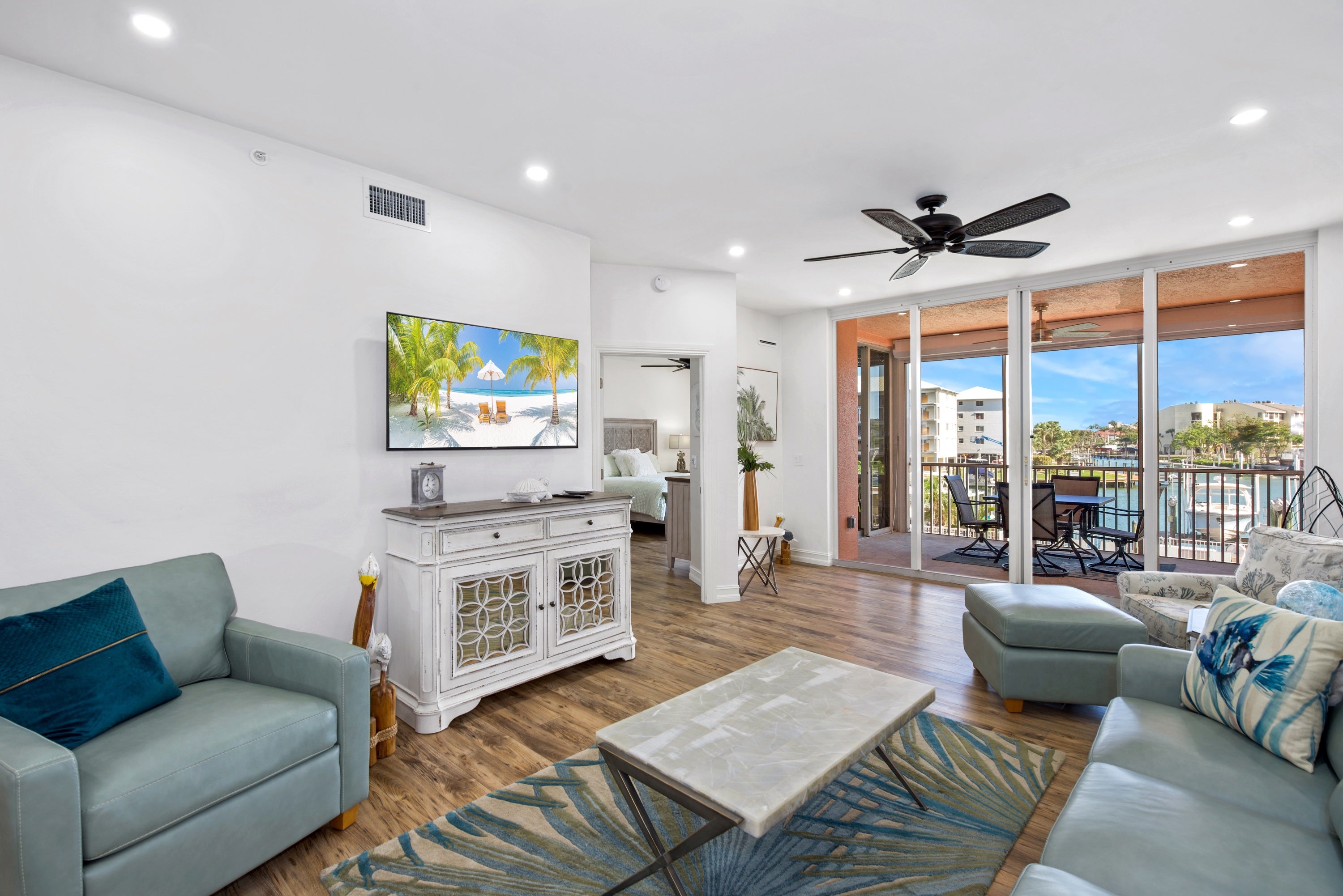 Welcome to Palm Harbor #202E, a beautifully renovated 2-bedroom, 2-bath condo that offers breathtaking views. Situated on the second floor with a south-facing exposure, this condo overlooks the pool, marina, and Gulf access basin, providing a stunning backdrop. From the moment you step inside, you'll be captivated by the expansive open-concept design and the serene water views that greet you. Designed with both style and functionality in mind, the kitchen is a true entertainer’s delight, featuring a coffee and wine bar area, upgraded appliances, a wine fridge, granite countertops, and raised-panel cabinets. It flows seamlessly into the spacious living and dining areas. Relax in the master bedroom, complete with a king-sized bed, TV, en suite bathroom, and direct access to the balcony. The guest bedroom offers a cozy queen-sized bed, ensuring a restful night’s sleep for all guests. Create unforgettable memories at Palm Harbor #202E, your perfect retreat by the water.