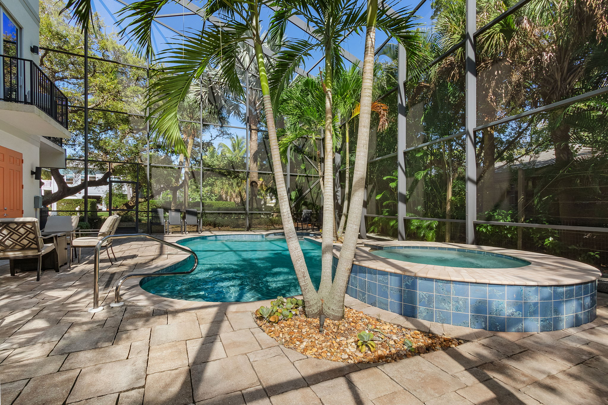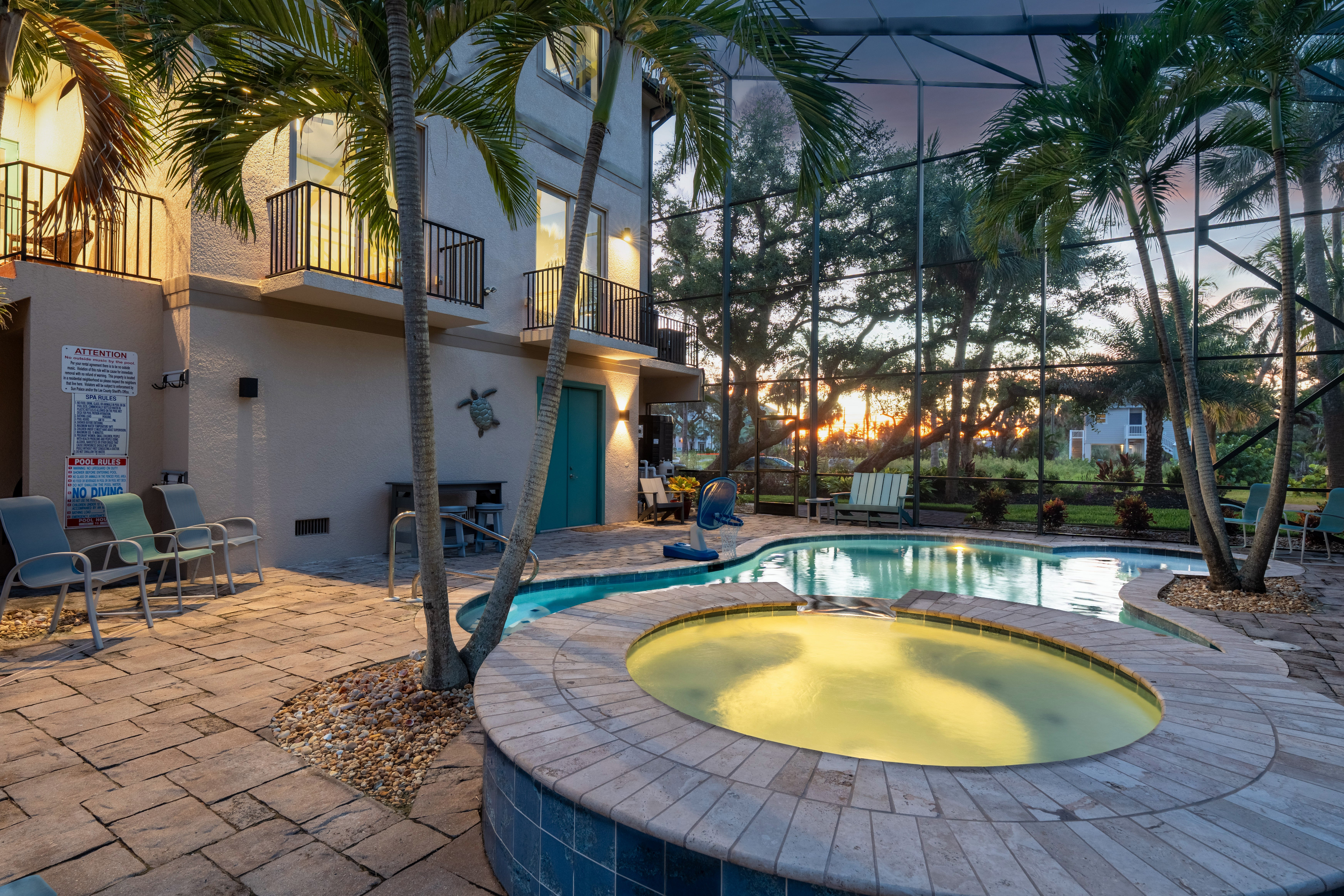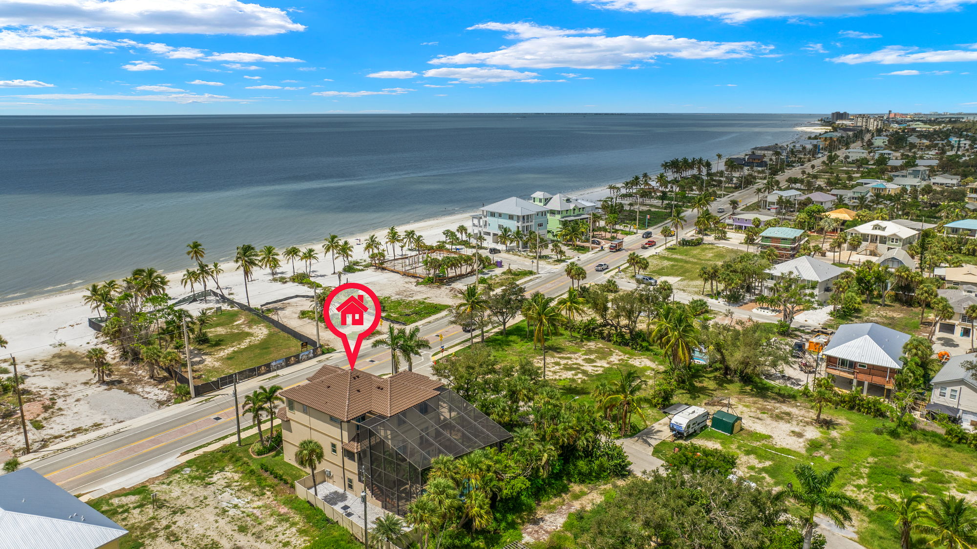 "We loved this home! Plenty of bedrooms and bathrooms for our group. The main kitchen and living room area were ideal for our meals and group activities. The location was right across the street from the beach so we were able to go back and forth easily to enjoy the beach. The pool and hot tub were wonderful. There was construction across the street but that is normal for Ft Myers beach right now. We did see a rat in the pool cage one night that surprised us. The beach umbrellas were on their last leg, but those were not promised. Overall we absolutely loved our stay and would highly recommend this beach house!"