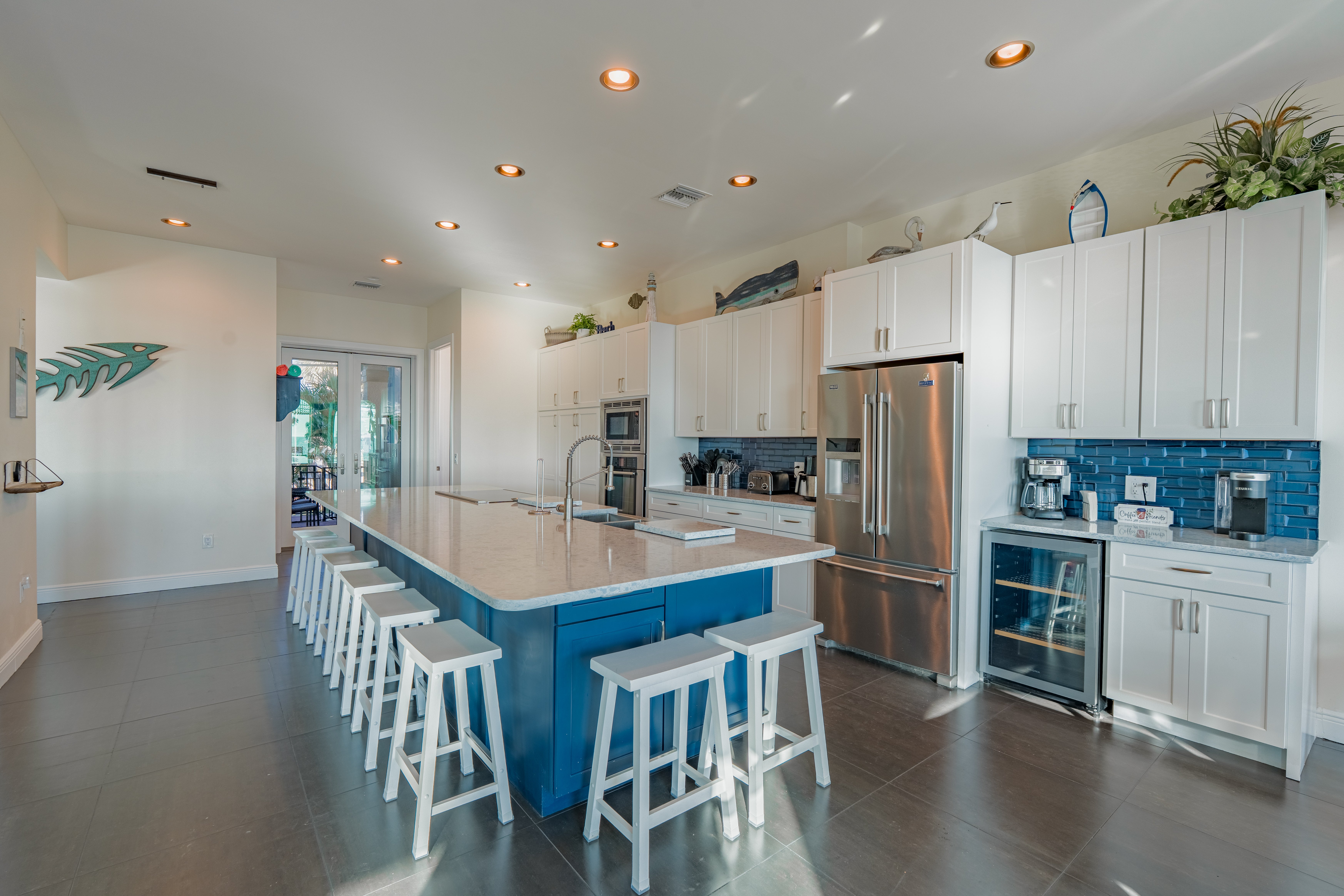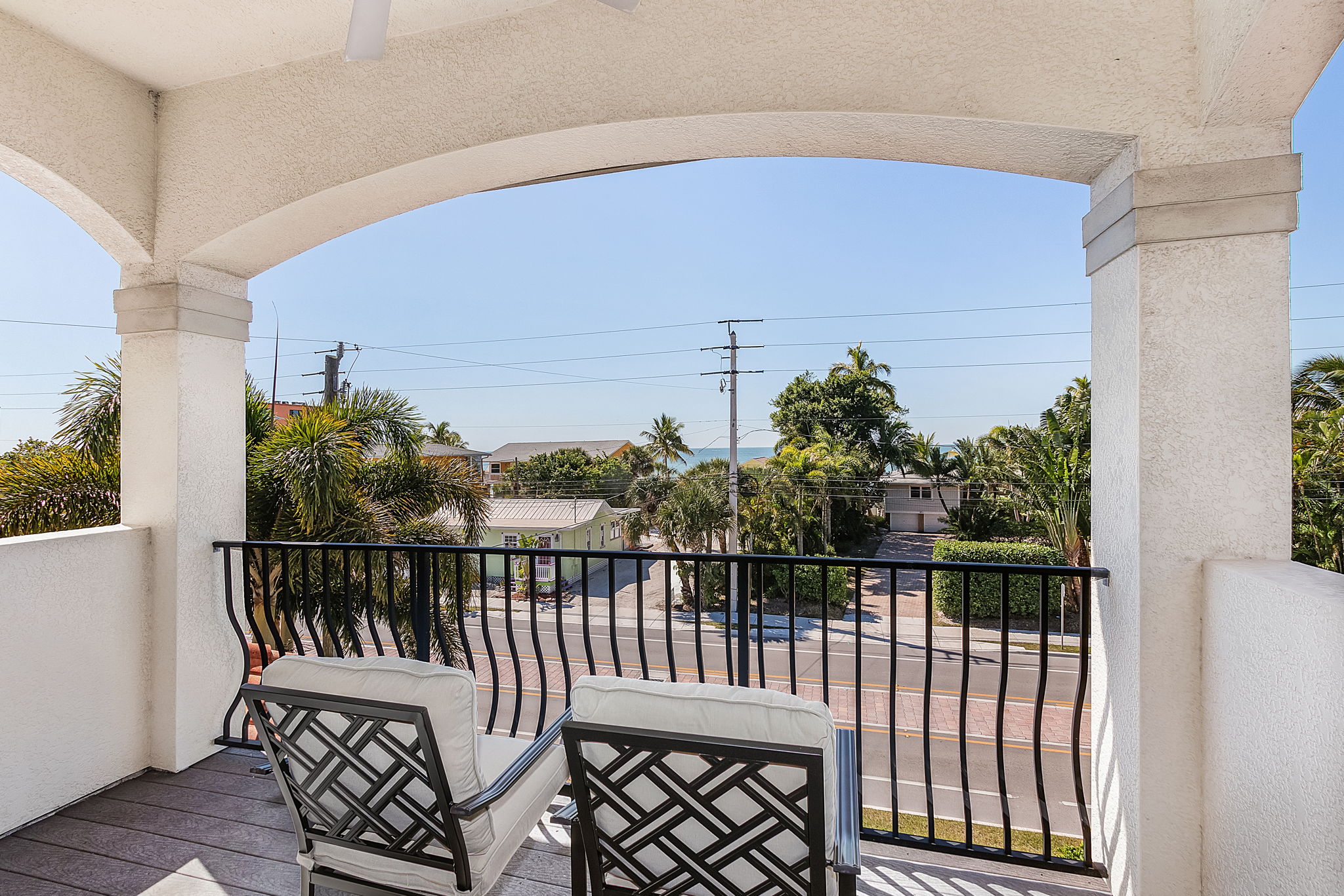 Whether you are planning a couple’s getaway with friends, a family vacation, a corporate retreat or a romantic escape, Sabal Palms is the perfect place to enjoy sophistication and luxury in a beautifully designed custom home. Located mid-island just across from the beach with a great Gulf view and fabulous 3 story screened enclosed 16' x 32’ heated pool this home does not disappoint. Relaxing is easy in the enormous open floor plan, including the main living area with lots of comfy seating, and a 85" TV. The fully equipped gourmet kitchen meets all your culinary needs, whether a chef comes to you, or one of you is the "Chef du Jour", large dining table seats 10, breakfast bar seats 8, and a covered terrace that is conducive to great conversation over after dinner cocktails with a spectacular sunset as your backdrop. A large Gas grill is just outside through the kitchen in its own covered portico, and there are stairs leading to the pool from there. Just off the living room you will find a half bath and down a short hallway is the second king bedroom and adjacent queen bedroom each with ensuite baths and a pool view from their own private decks. On the third floor a huge king master bedroom is on the third level boasting a high tray ceiling, elegant ensuite bath with glass enclosed walk-in shower and large multi showerhead, double sinks, 65" TV and a covered terrace with delightful Gulf views. Also on the third level are three more bedrooms each with an attached bathroom. The garage is available to guests and this first level has air hockey and foosball games for evening fun, when you need some shade or for that occasional rainy afternoon, lots of beach gear, a refrigerator and opens directly out to the pool. Reserve Sabal Palms for your best vacation yet.