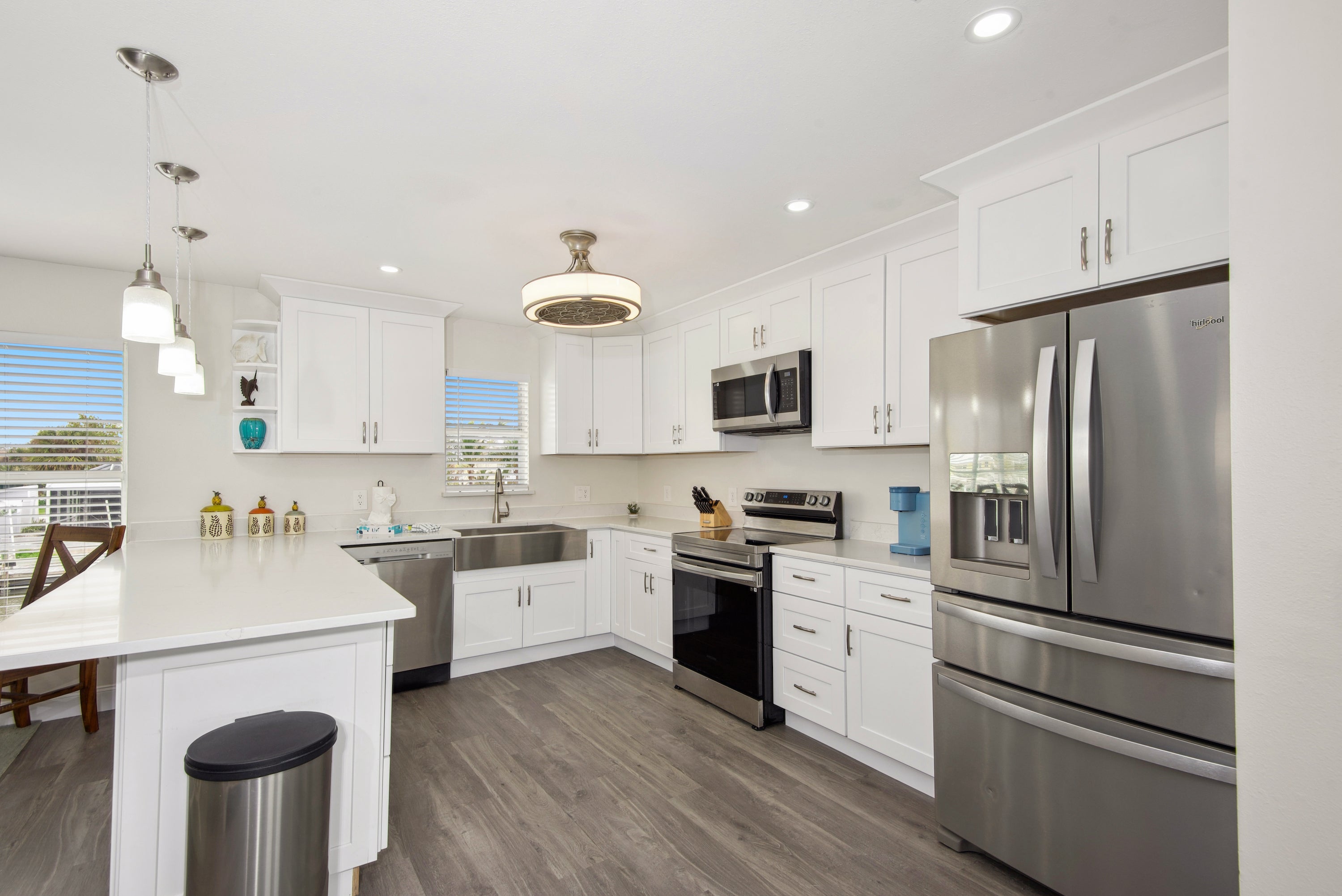 Welcome to your getaway at Santini House, a 7-bedroom, 7-bath duplex conveniently located on South Island on Fort Myers Beach. This spacious duplex offers enjoyable space for family or friends. The backyard living area boasts a large tiki hut to gather under, along with a new saltwater pool featuring a sun shelf and stone paver deck. Enjoy watching the kids swim in the pool while you relax in this amazing backyard—your favorite hangout spot. Whip up a delicious meal in the fully equipped kitchen with plenty of counter space. Downstairs, there's a master king bedroom with an attached walk-in shower bathroom, complete with a washer and dryer. The first guest bedroom has a queen bed and an attached walk-in shower bathroom. The second guest bedroom offers two queen beds with an attached bathroom.