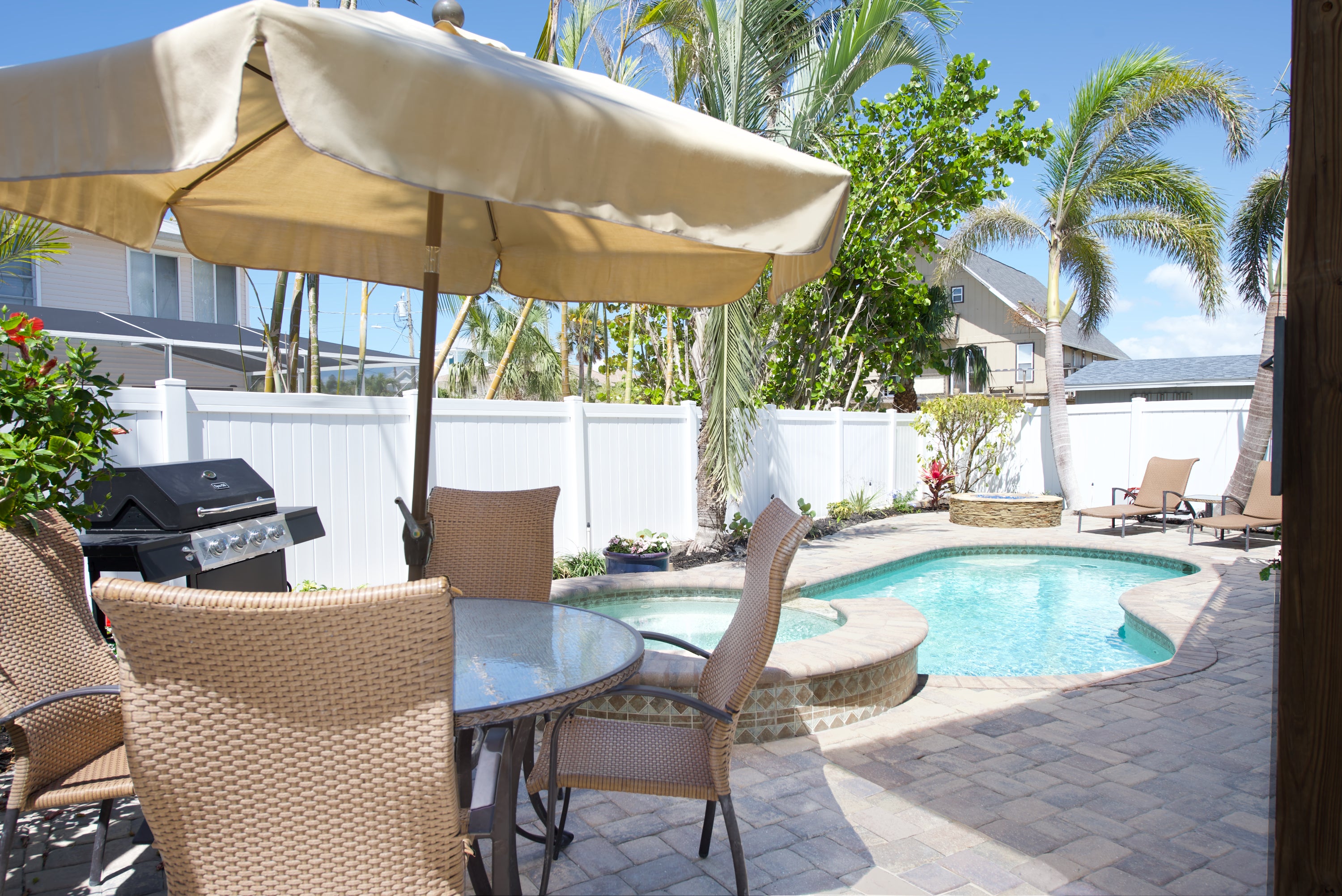 "Good location. Nice property. - We enjoyed the stay. Short walk to the beach and a nice walk to restaurants. Pool area was nice and being fenced made it easy for our dog to roam around. House was nice and well maintained. Sun Palace was very responsive to our questions and requests. "
