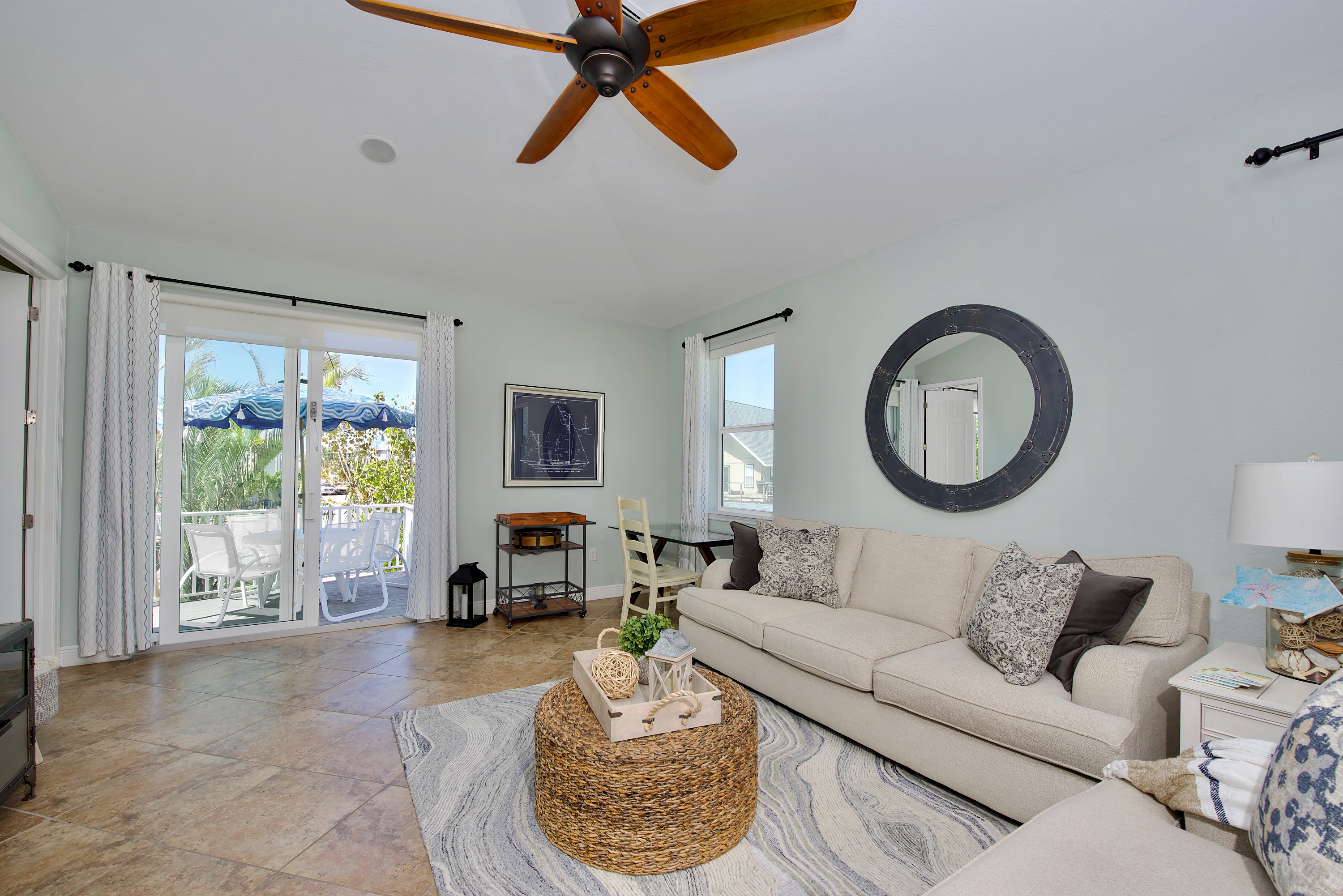 Get ready to relax both indoors and out at Sea La Vie. This beautiful North end home offers vaulted ceilings, open floor plan, and 3 bedrooms. Whip up a delectable meal in the kitchen with stainless-steel appliances, granite countertops, and breakfast bar. The beautiful living room is decorated in calming coastal hues while offering comfortable seating and lots of natural light. The living room offers sliding glass doors onto the back deck which offers a gas grill and outdoor dining table overlooking a tropical landscape and beautiful pool with spill over spa. Unwind in the primary bedroom with a king bed, balcony access, and ensuite with walk-in shower. There is a queen guest bedroom and a bunk room with two twin-over-twin bunks. The guest bathroom also offers a walk-in shower. An added bonus if you have to do a little work while on vacation, the owners have added a little office space for you to touch base with the office, if you have to, or help your students get a little homework done. With great views of the Back Bay and a community boat / kayak launch just 2 doors down, you can explore the water as well as our famous white sugar sandy beach just a 5-minute walk away and an easy stroll to our downtown area. Come relax at Sea La Vie on your next vacation.