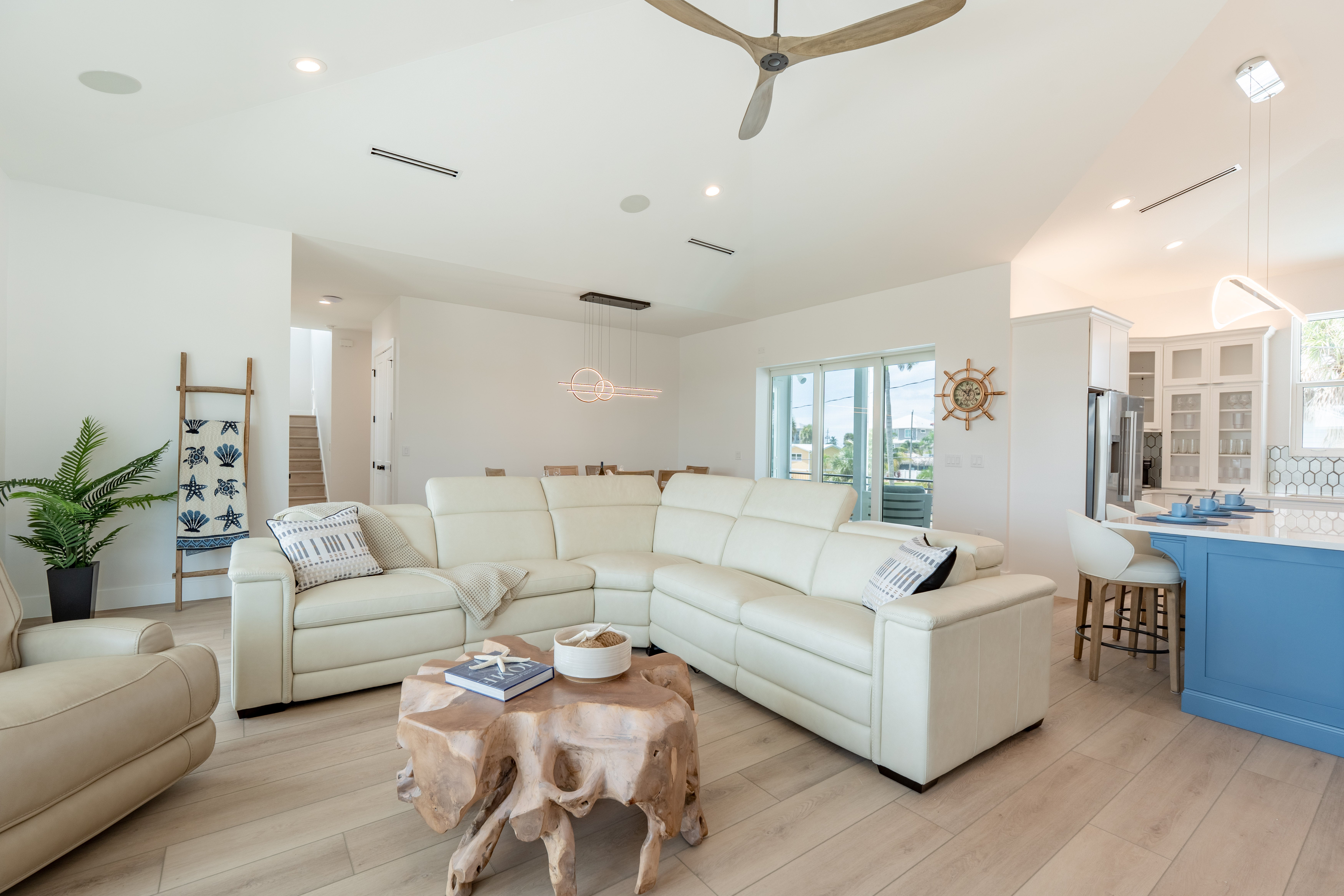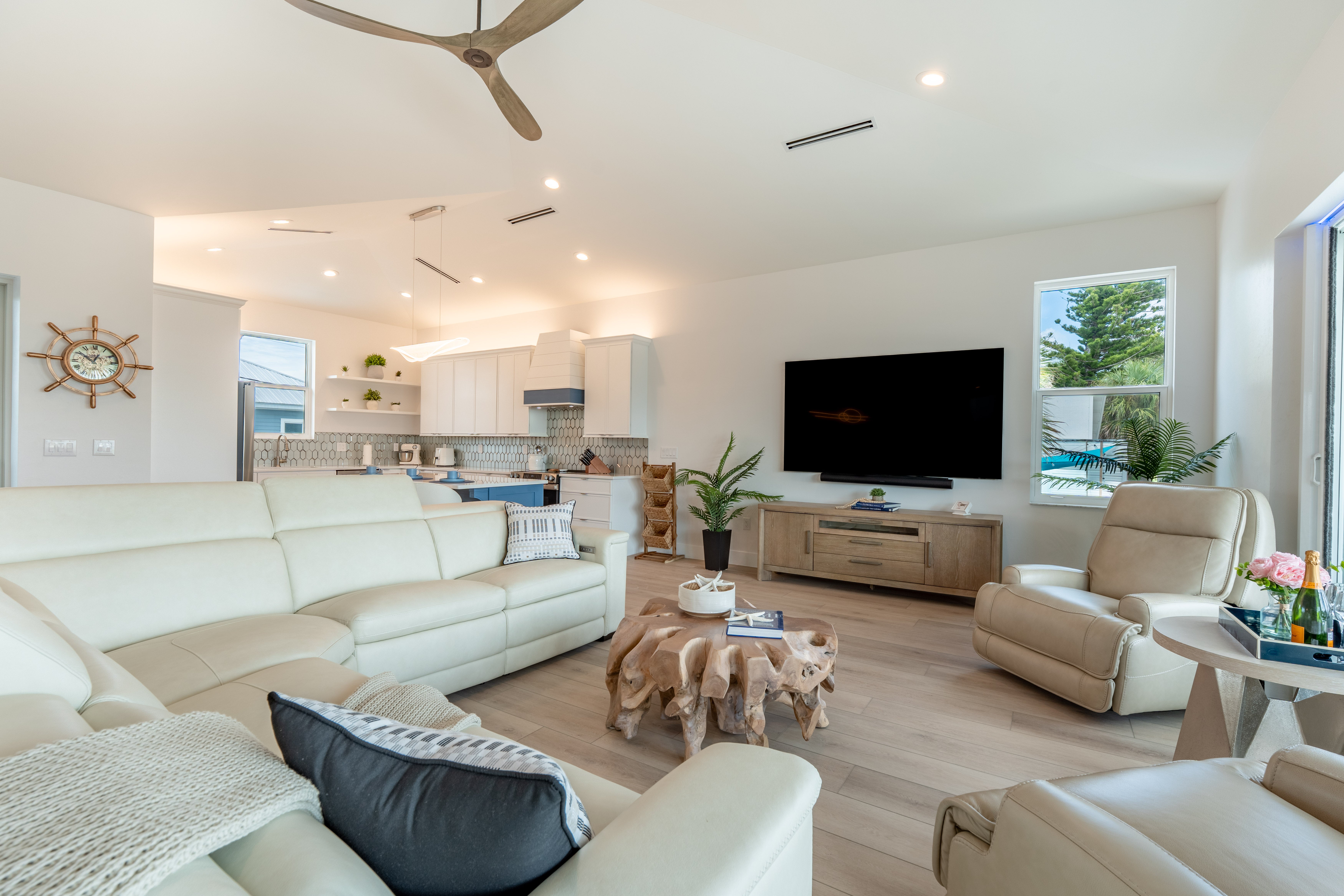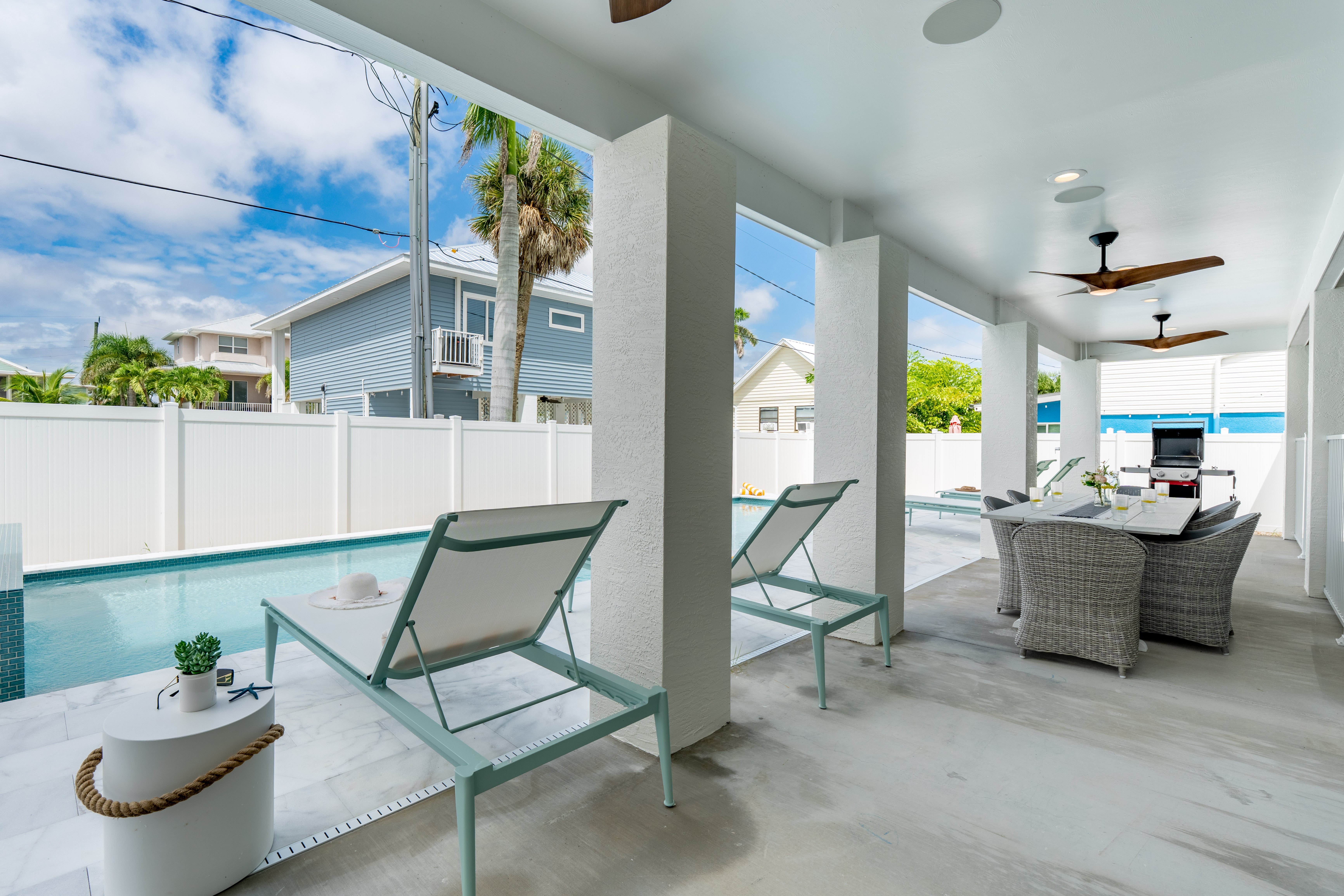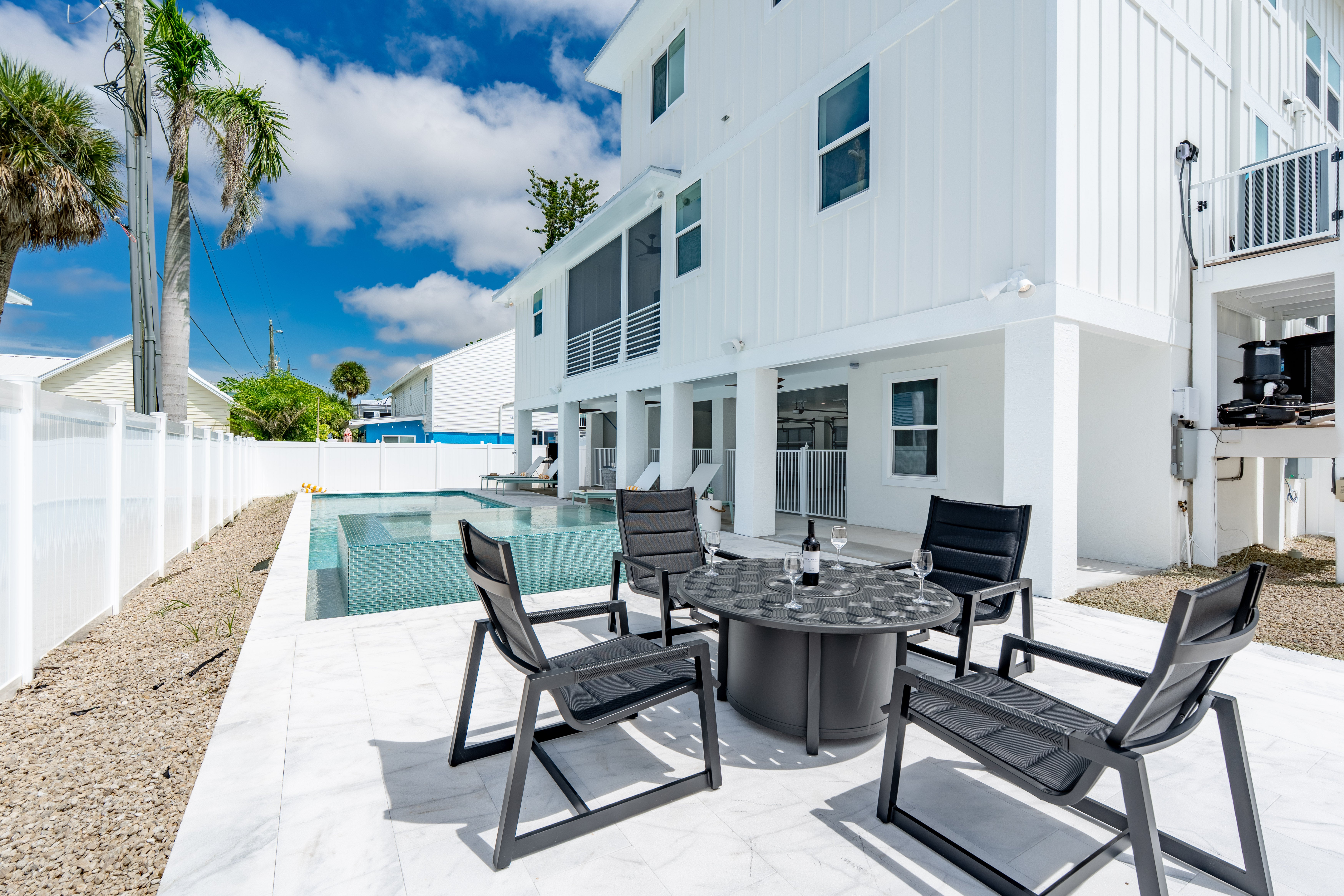 Welcome to Sun Kissed Villa, your flawless coastal sanctuary on Fort Myers Beach. This brand-new luxury villa was designed for connection, serenity, and renewal. Accommodating up to eight guests, it features four exquisite bedrooms—one king and three queens—each with a Tempur-Pedic mattress to ensure deep, restorative sleep, along with four elegant bathrooms (three full, one half) offering spa-inspired comfort. The open living area invites you to unwind on zero-gravity sofas or gather in the chef’s kitchen, fully equipped with Viking stainless-steel appliances, a quartz backsplash, and everything you need to create memorable meals. A Sonos sound system fills the air with your favorite music, while thoughtful touches like zero-gravity loungers and complimentary Wi-Fi make every moment effortless.