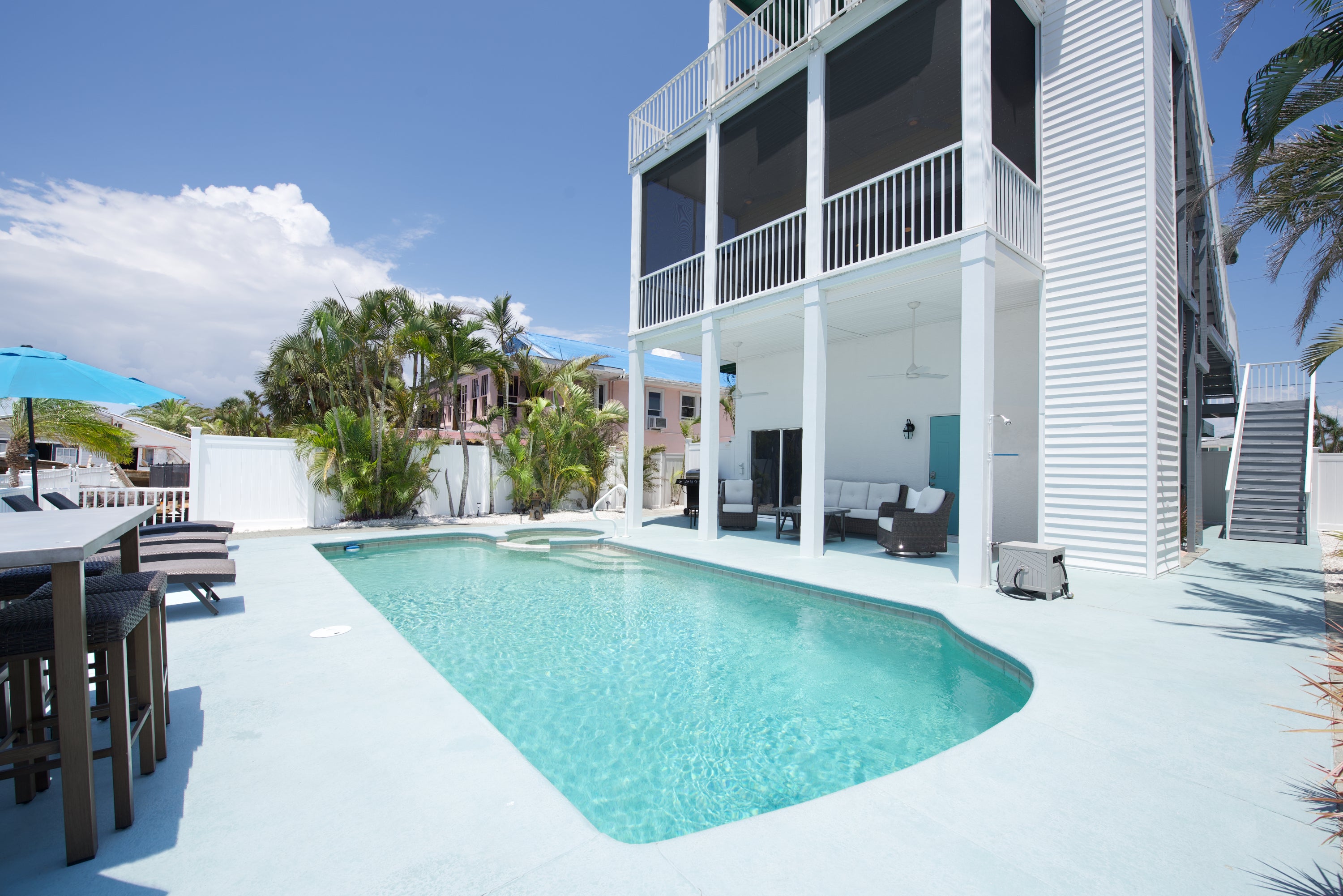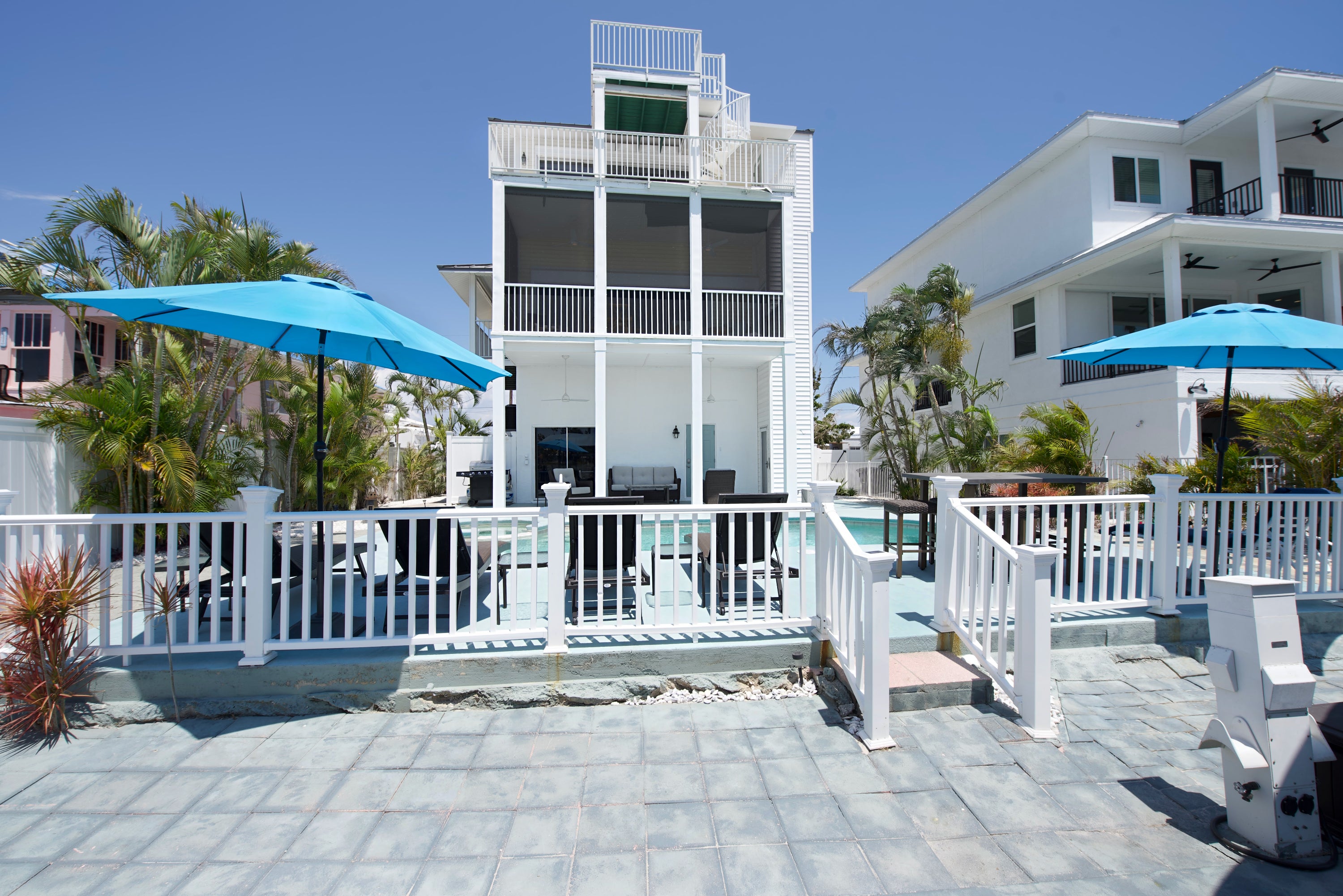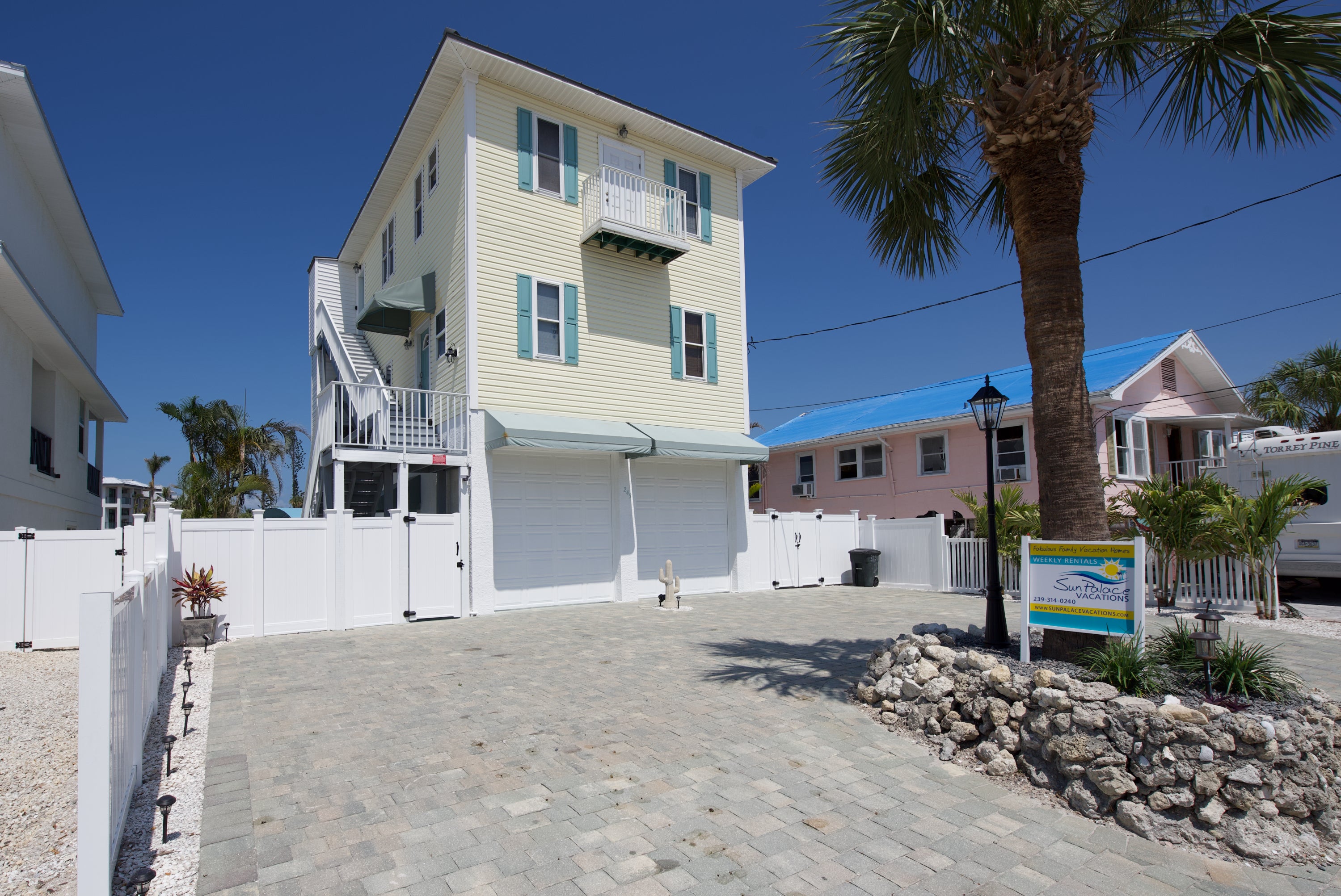 Welcome to Sunny Canal. This beautiful three-bedroom canal front home is located on the North end of Fort Myers Beach and is a quick walk to the beach. Walking into the living area guests are greeted with a wall of sliding glass doors filtering the area with natural light. A cozy living area features two sofa sleepers, flat screen TV, and picturesque views of the canal. Whip up a delicious dinner in the evenings in the fully equipped kitchen. Open the sliding glass doors and choose to eat at the inside dining table, the outdoor table on the lanai, or both. The lanai is screened for extra comfort. The main level also includes a queen bedroom, full bathroom, and laundry. Up the spiral staircase to the third floor guests will find another queen bedroom, full bathroom, and the primary suite. The primary suite offers a king bed, large en suite, and a private balcony. Perfect location for your morning coffee. The balcony includes another spiral staircase to a small rooftop deck. Venturing to the ground floor there is a large pool, spill over spa, plenty of outdoor seating, and a bar with TV. Bring or rent kayaks and paddleboards to launch off the dock to make the most of the location. Sunny Canal is the perfect vacation home for the outdoor enthusiast.