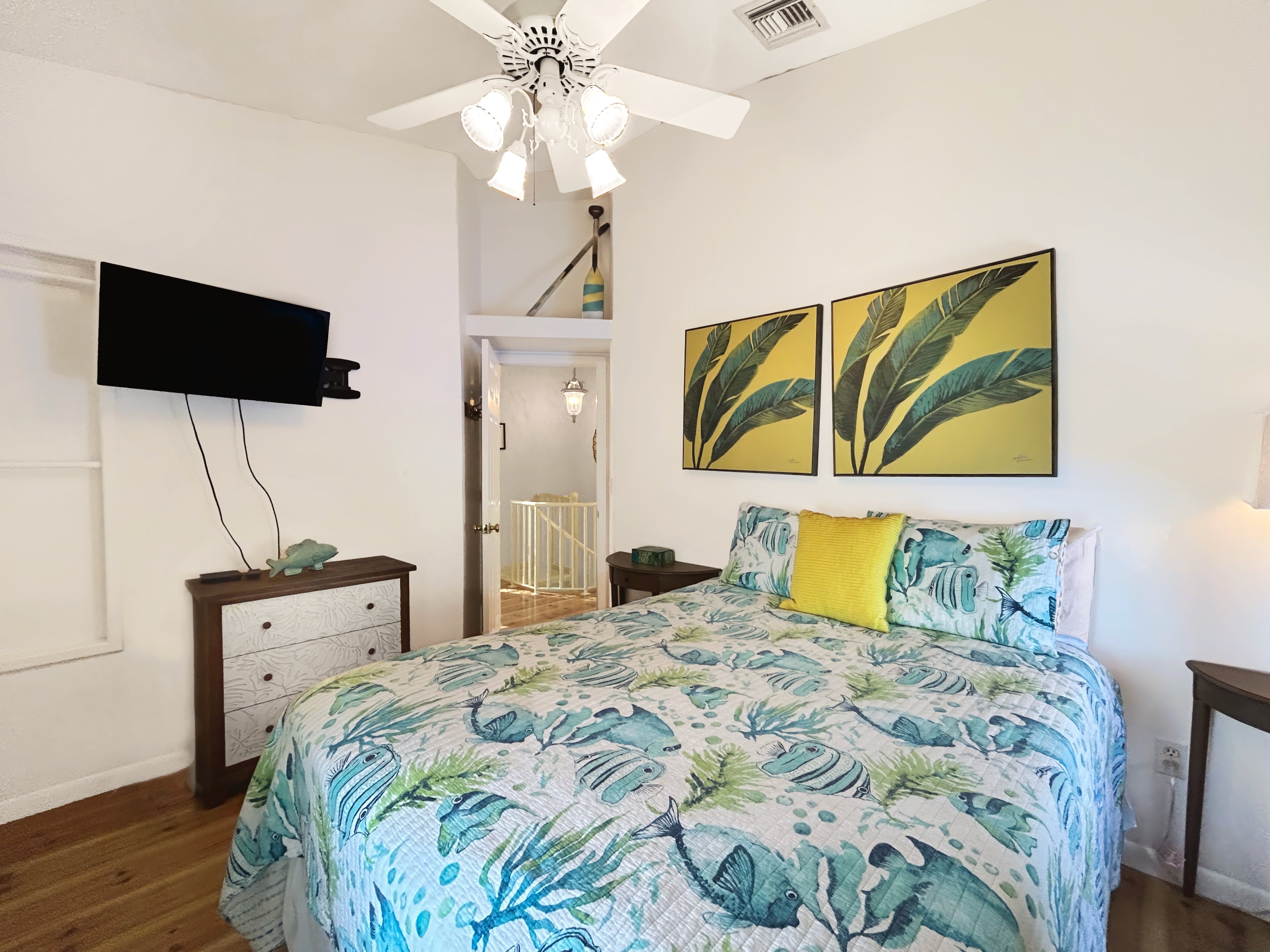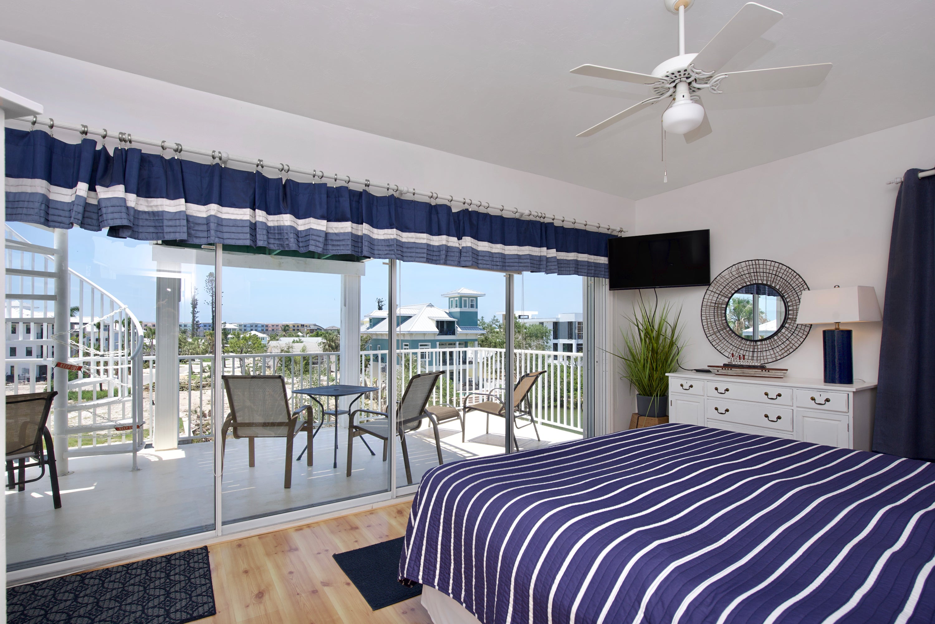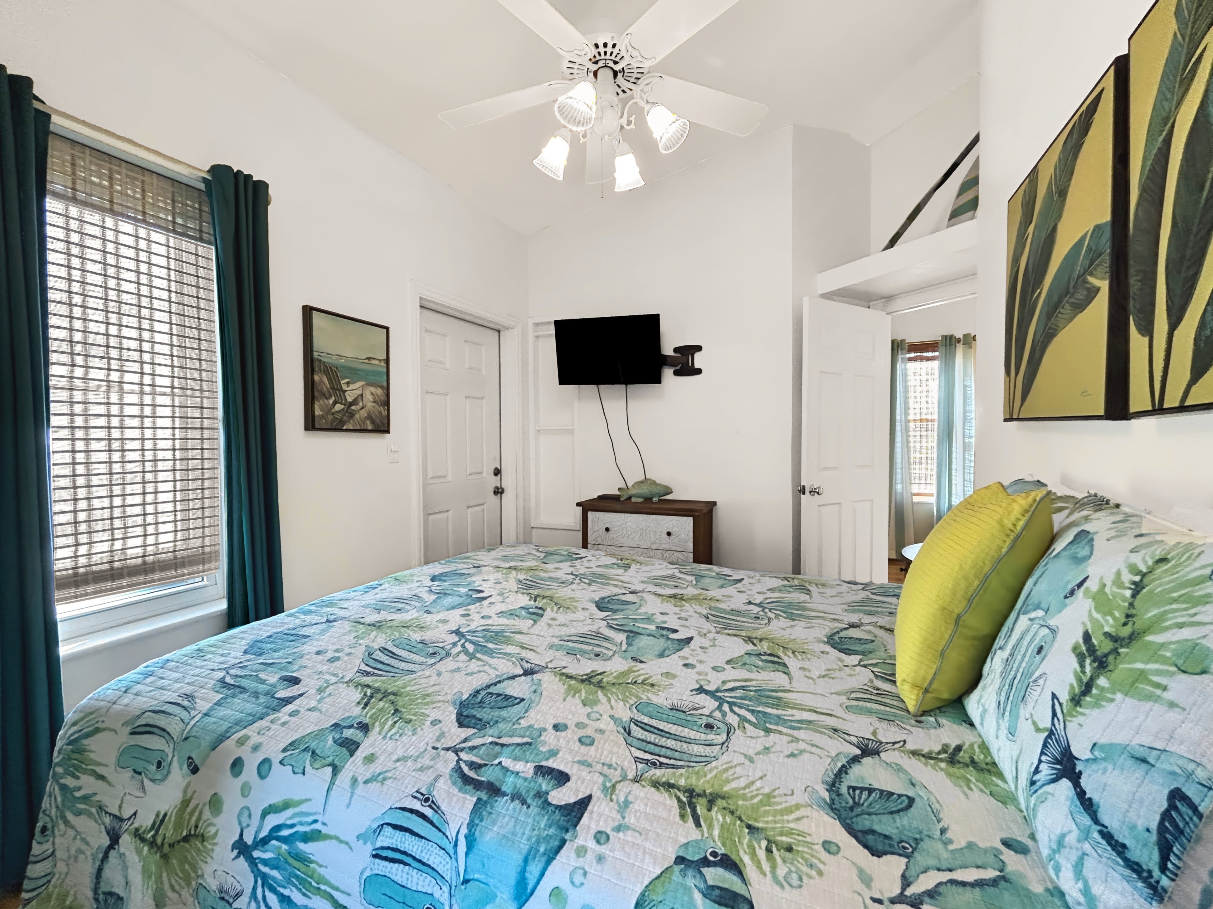 King bed with TV and ceiling fan overlooking canal with balcony.