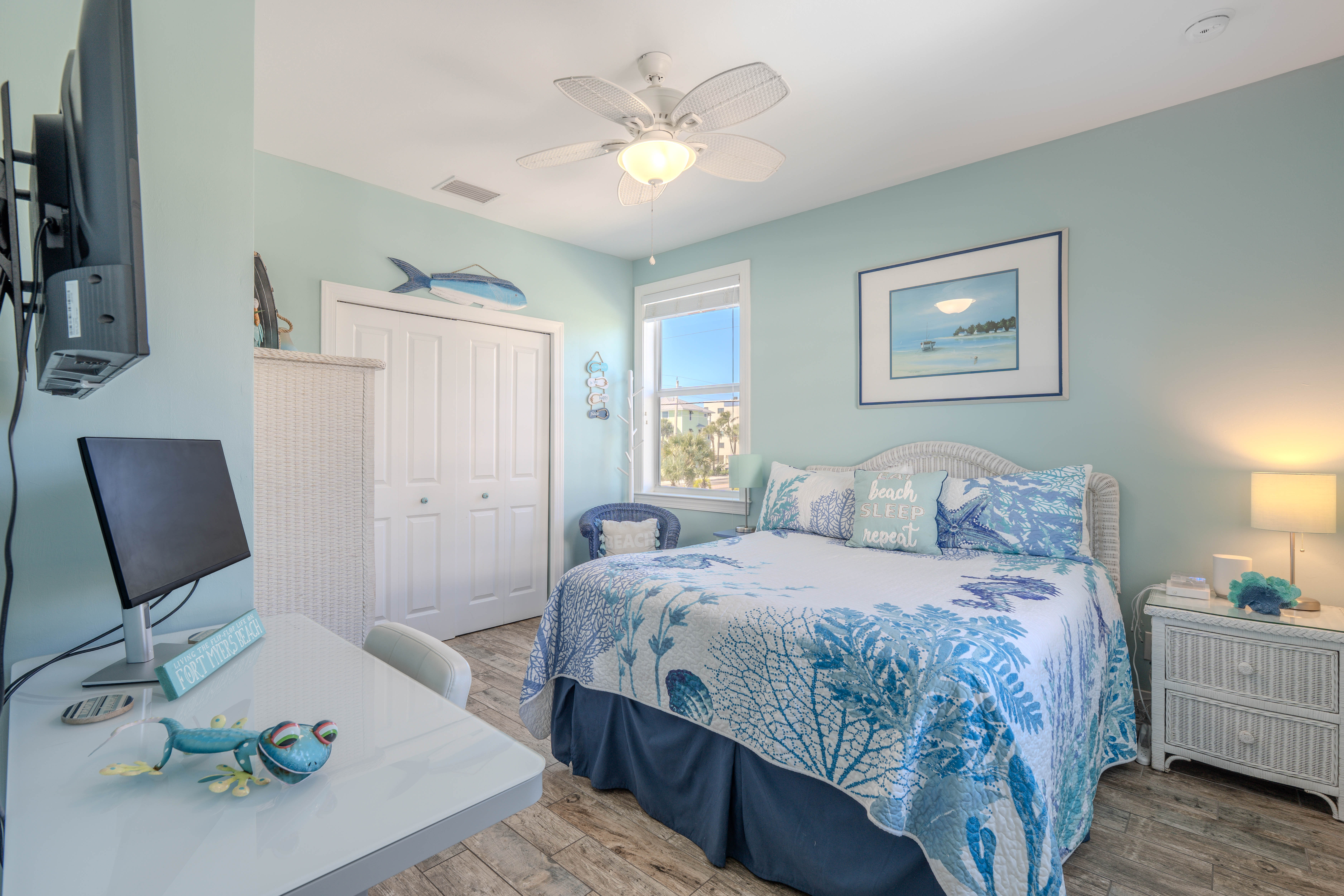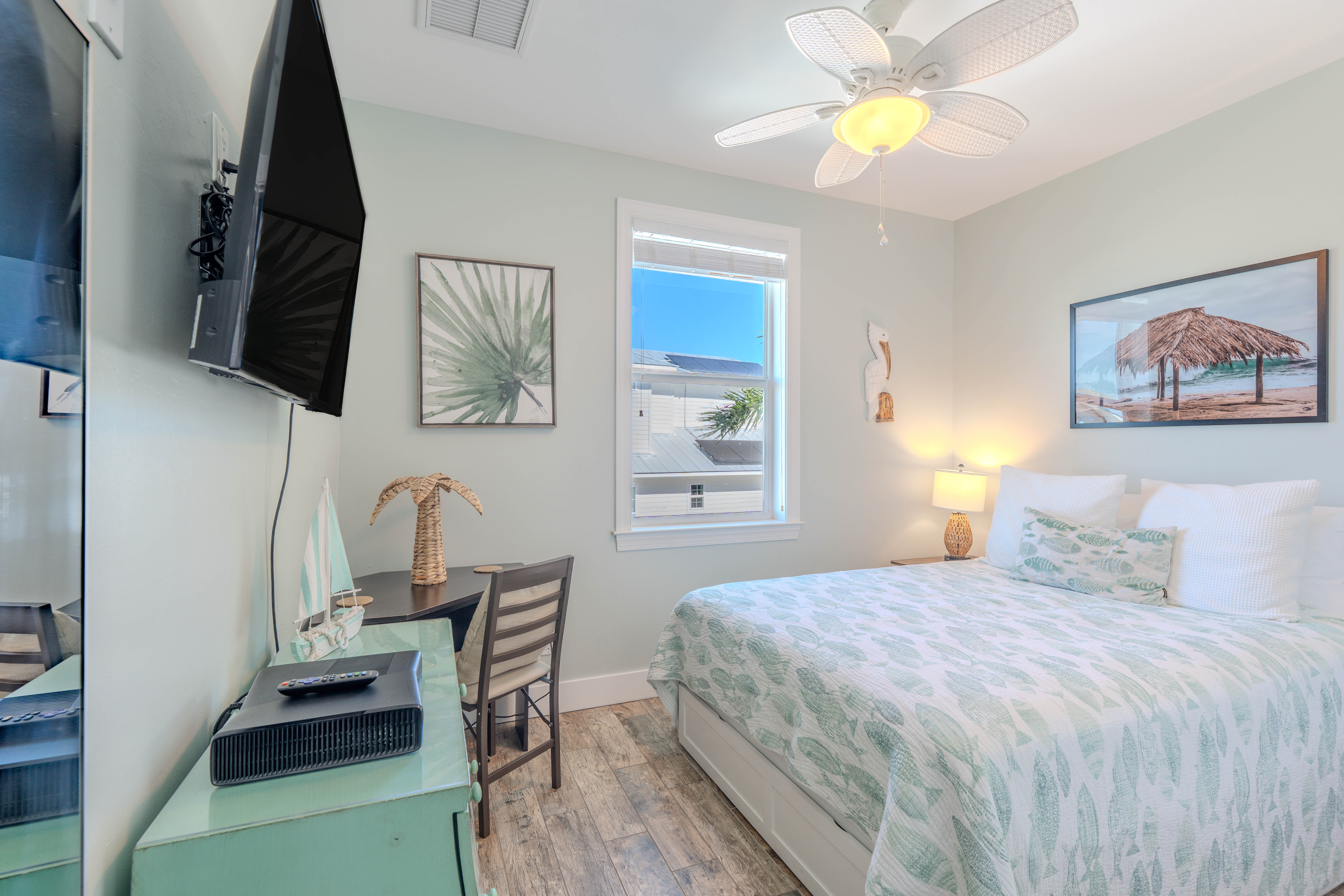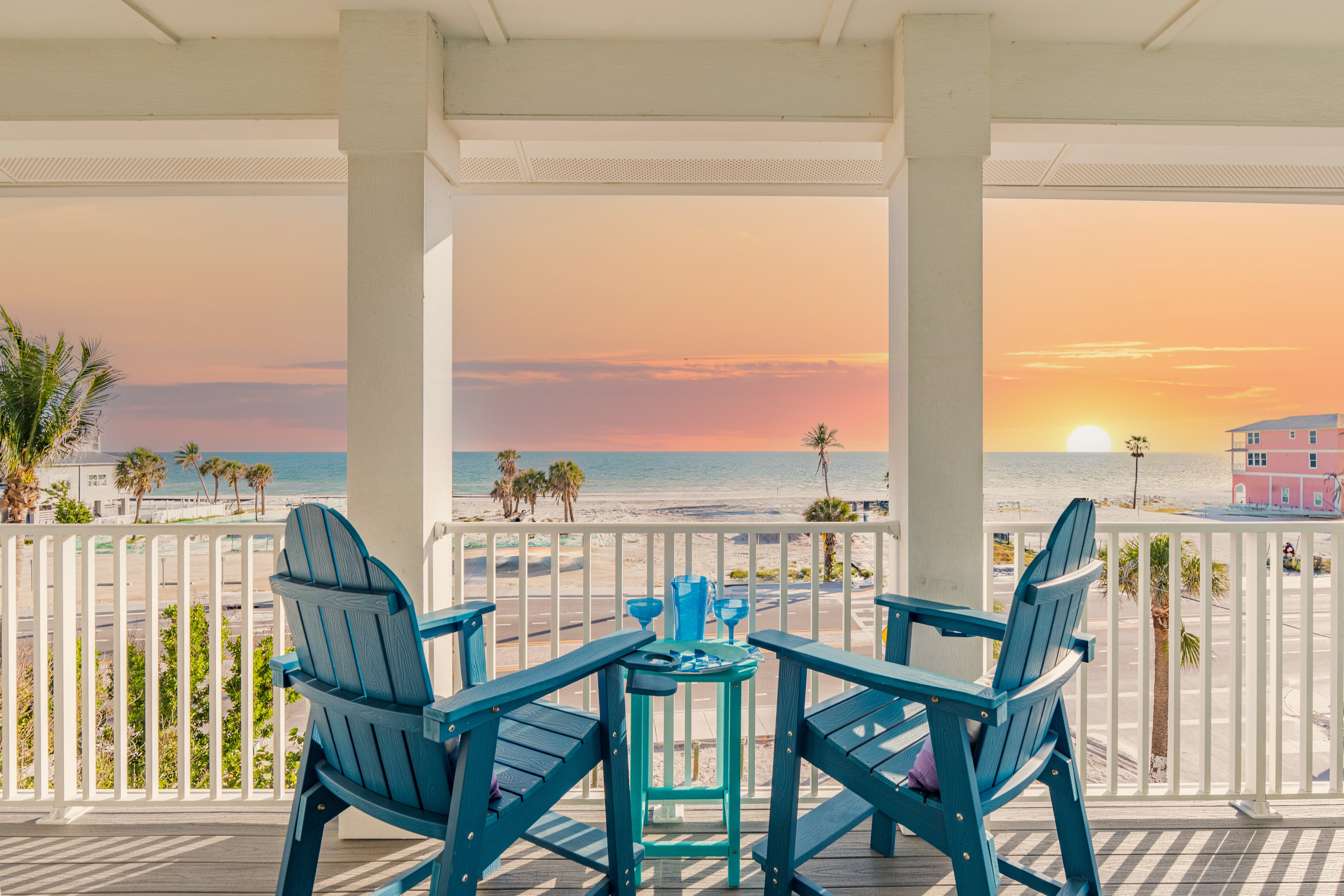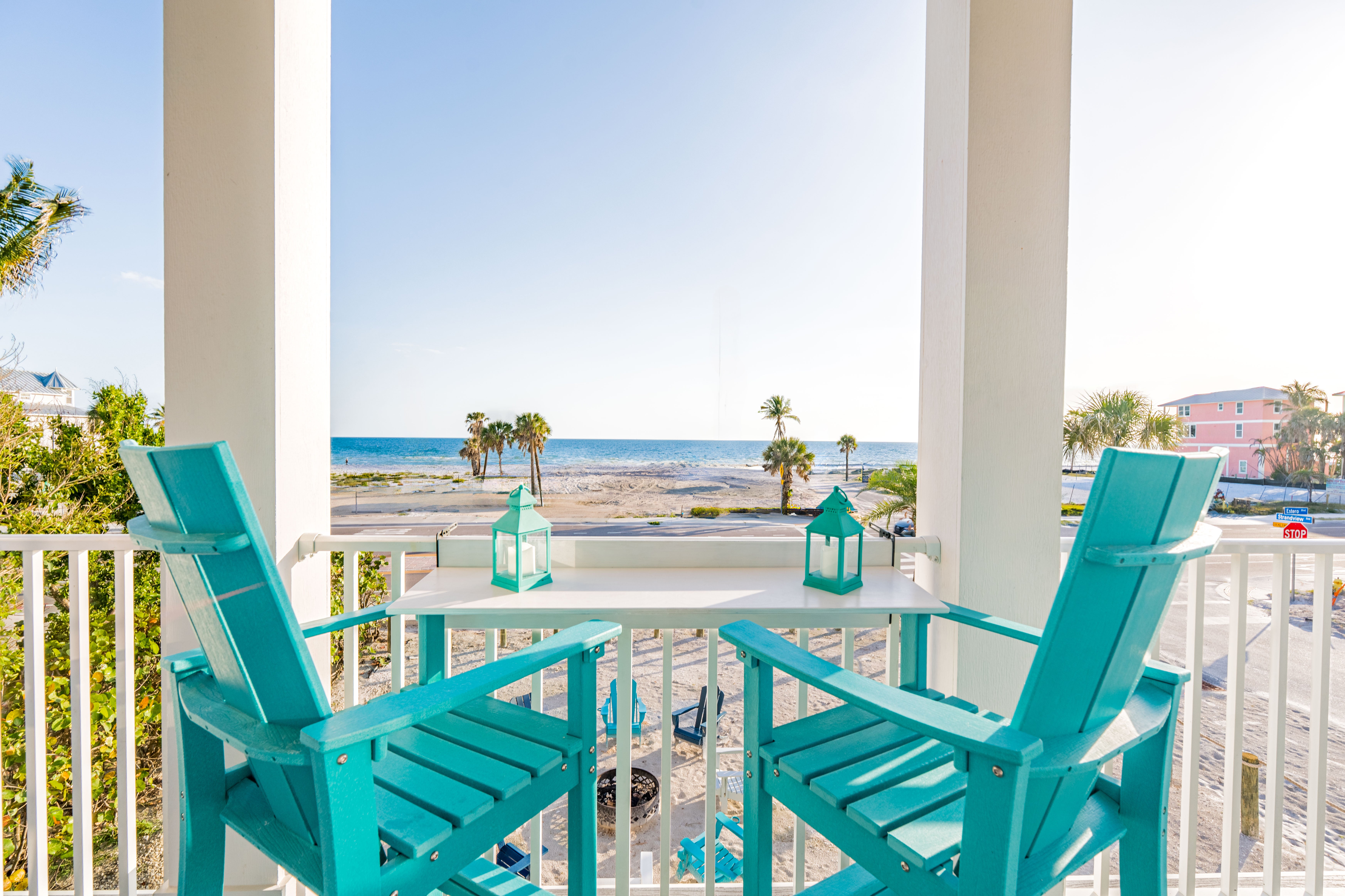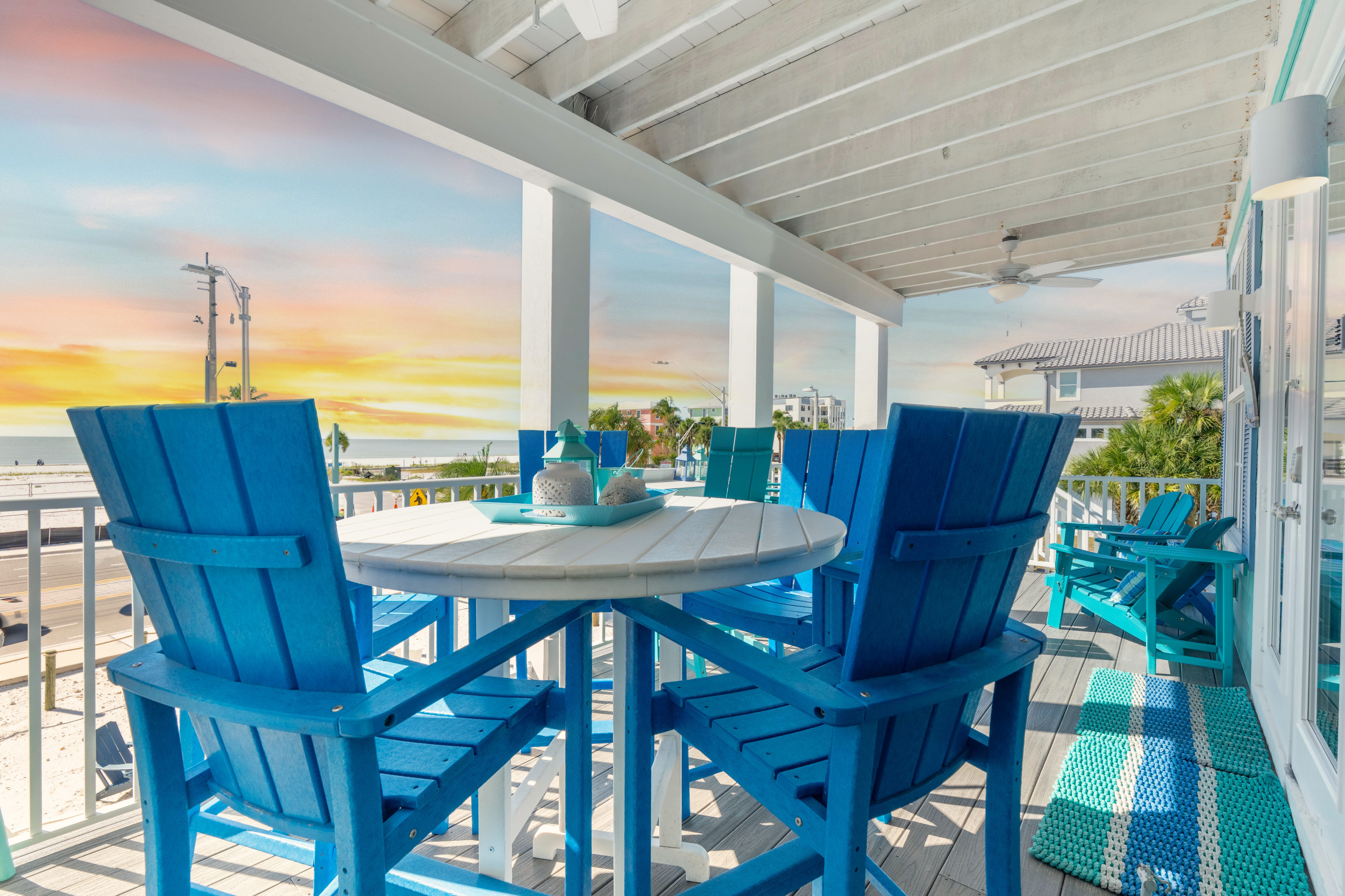 Retreat to the upstairs balcony for a moment of tranquility with a captivating book, or revel in the master bedroom's full-length balcony boasting sweeping Gulf panoramas. The master bedroom indulges with a king bed, ample storage, a complimentary coffee bar and a full en-suite bathroom, shower only. Two guest bedrooms, a shared bathroom, and a convenient laundry room complete the second floor. And for our guests who love to be productive, two of the rooms in this unit boast workstations/desks! Outside, start your day soaking up the sun with a relaxing day by the pool and spa! As the sun descends, spend your time gathering on cushioned seating around the fire table or under the stars, accompanied by the soothing sound of waves sitting around the fire pit that invites unforgettable evenings. (Guests provide the wood for burning!). Parking for 3 cars is provided. Please do not park on the shells.