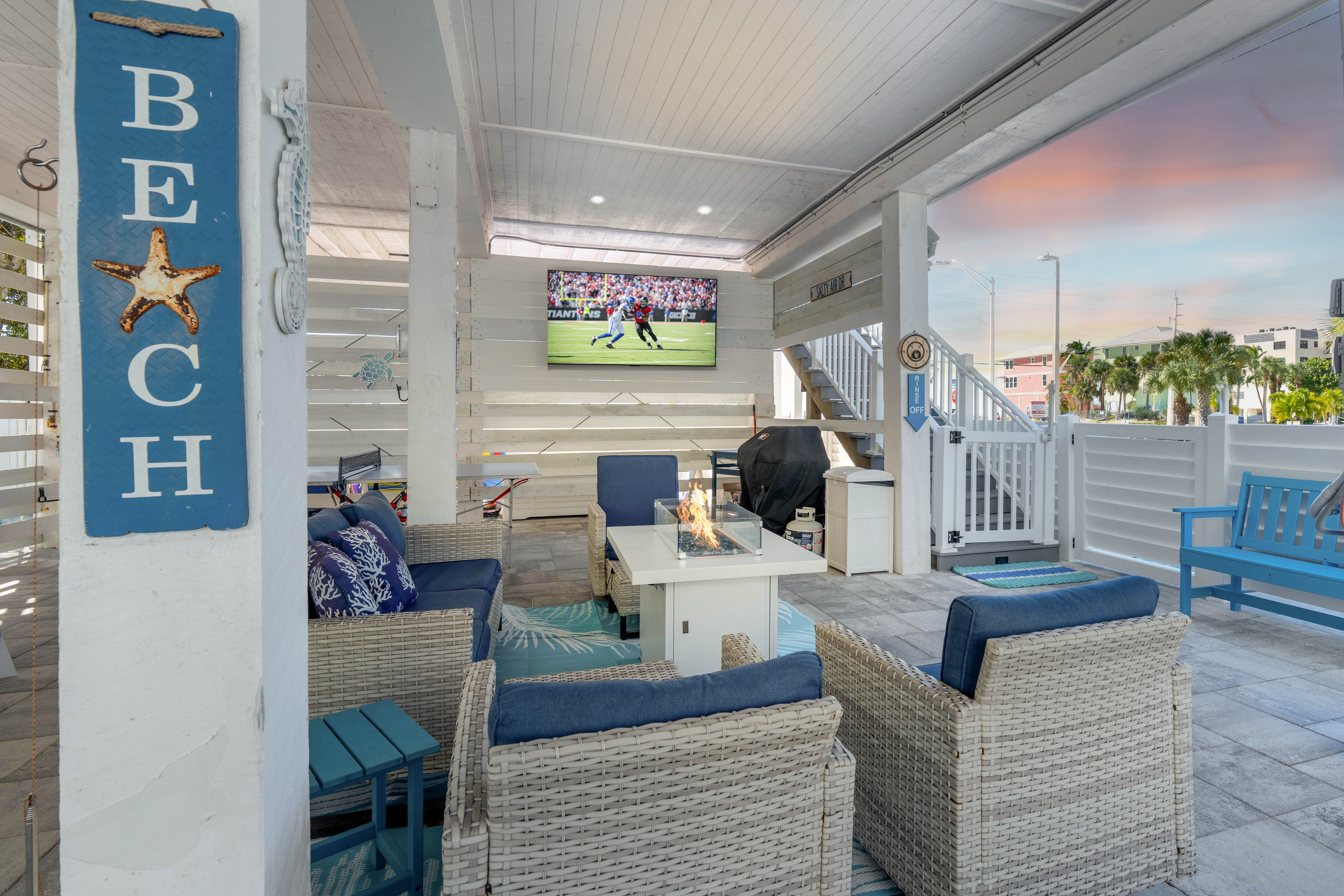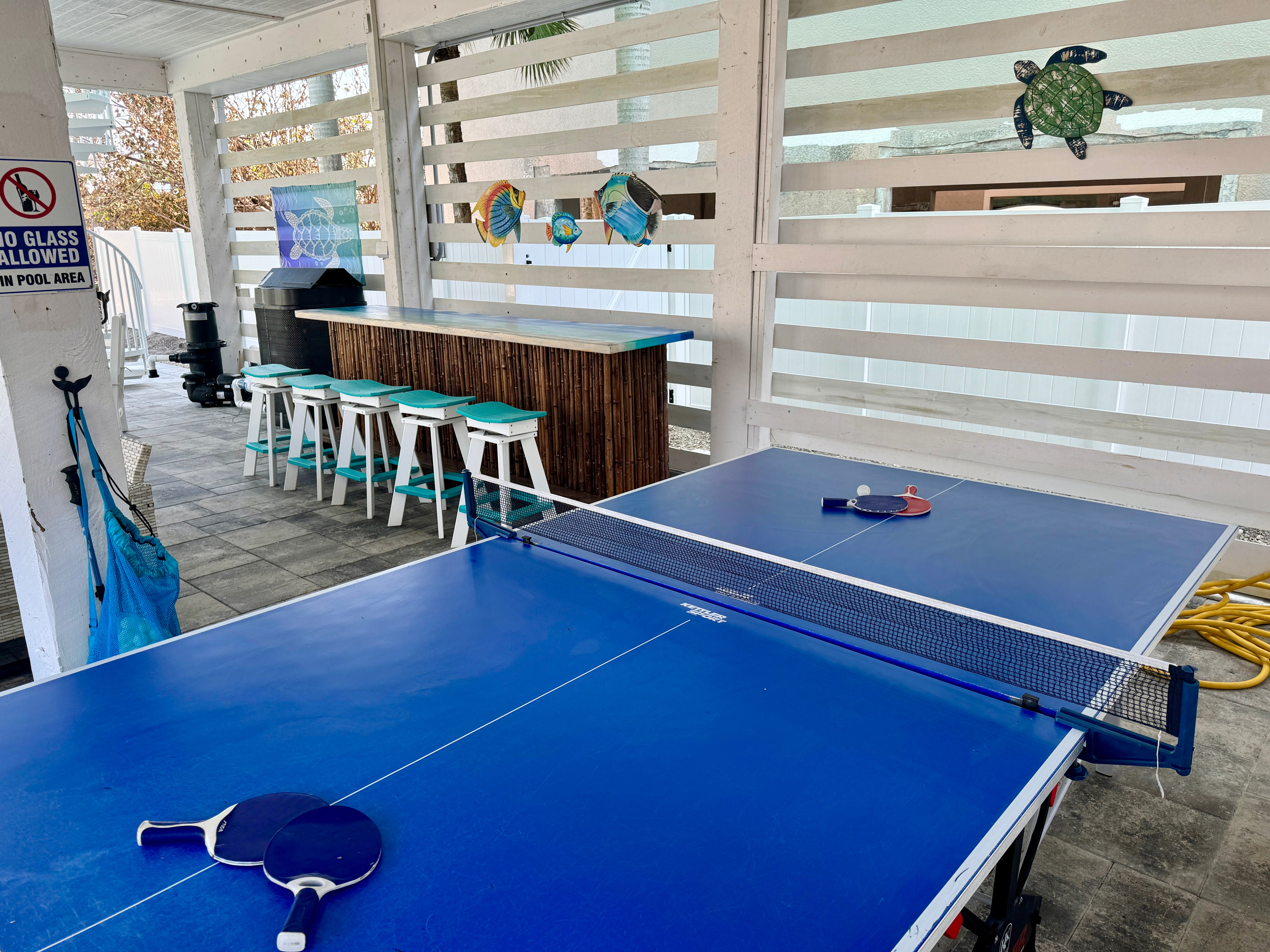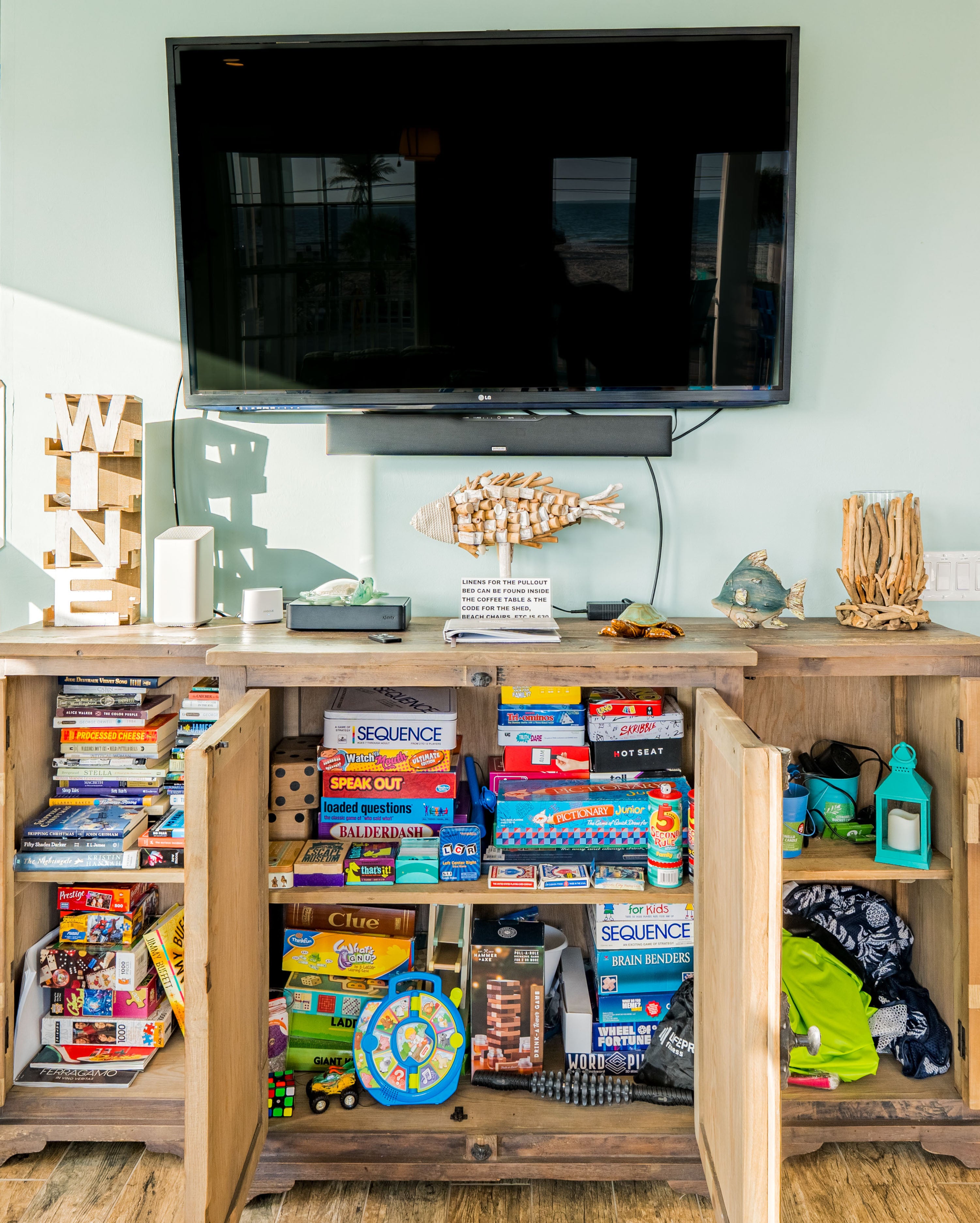 * Complimentary Beach Gear: Chairs, Wagon, Beach Towels, Kids' Beach Toys, and Cooler * Outdoor Entertainment: Outdoor Bar, Grill, Covered Fire Table with Outdoor Seating, 85" screen TV and Fire Pit with Seating * Outdoor Games: Ping Pong Table, Cornhole, Washer Game, Tiki Toss * Kitchen and Beverage Amenities: Host Provided Coffee Starter Pack of Keurig Cups and Tea, Margaritaville Blender, and Coolers Provided for Guest Use * Kids' Amenities: A Deluxe Pack-and-Play with Linens, Booster Dining Seat, and Potty Seat * Indoor Entertainment: Xbox 360 (bring your games), Books and Games are Available