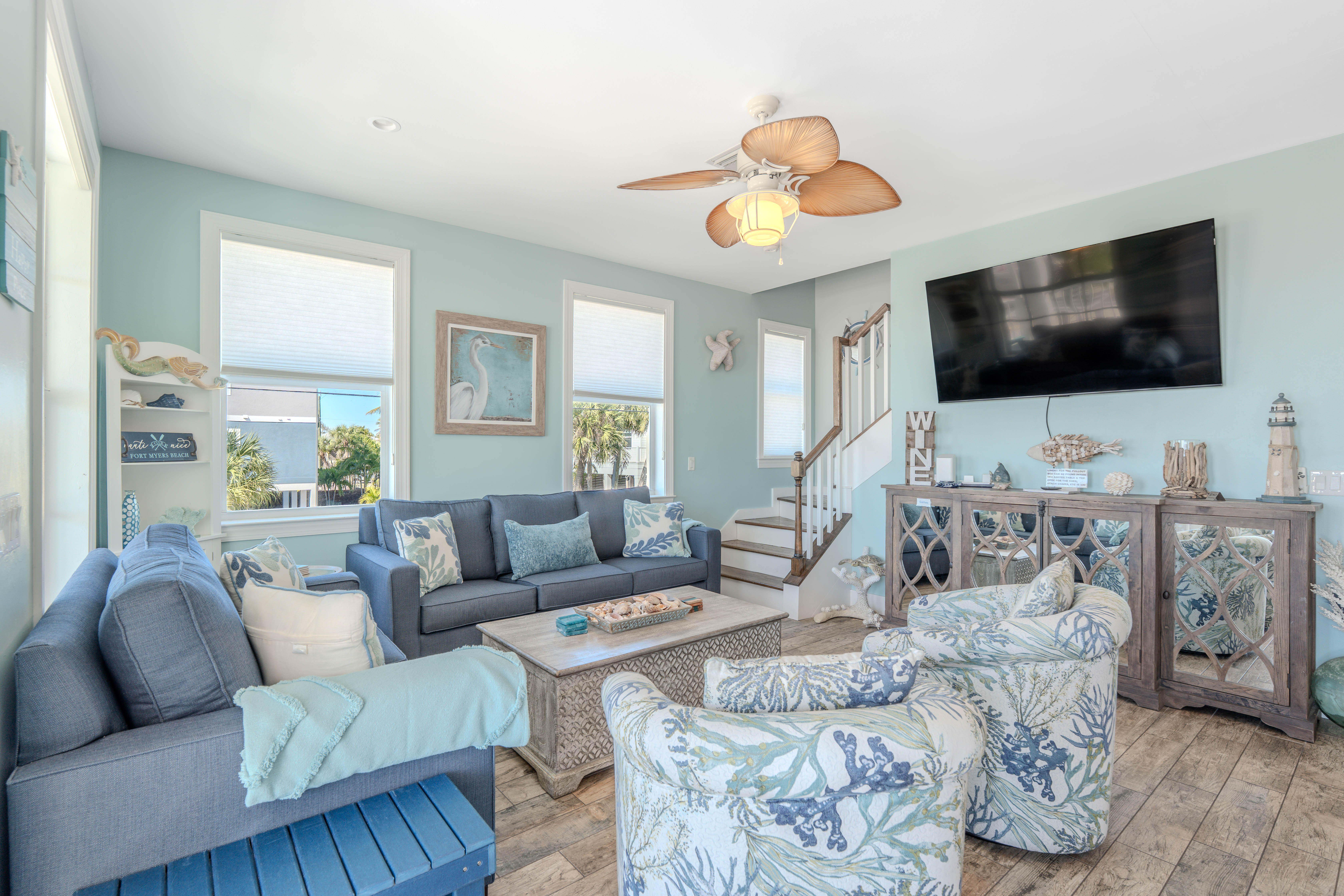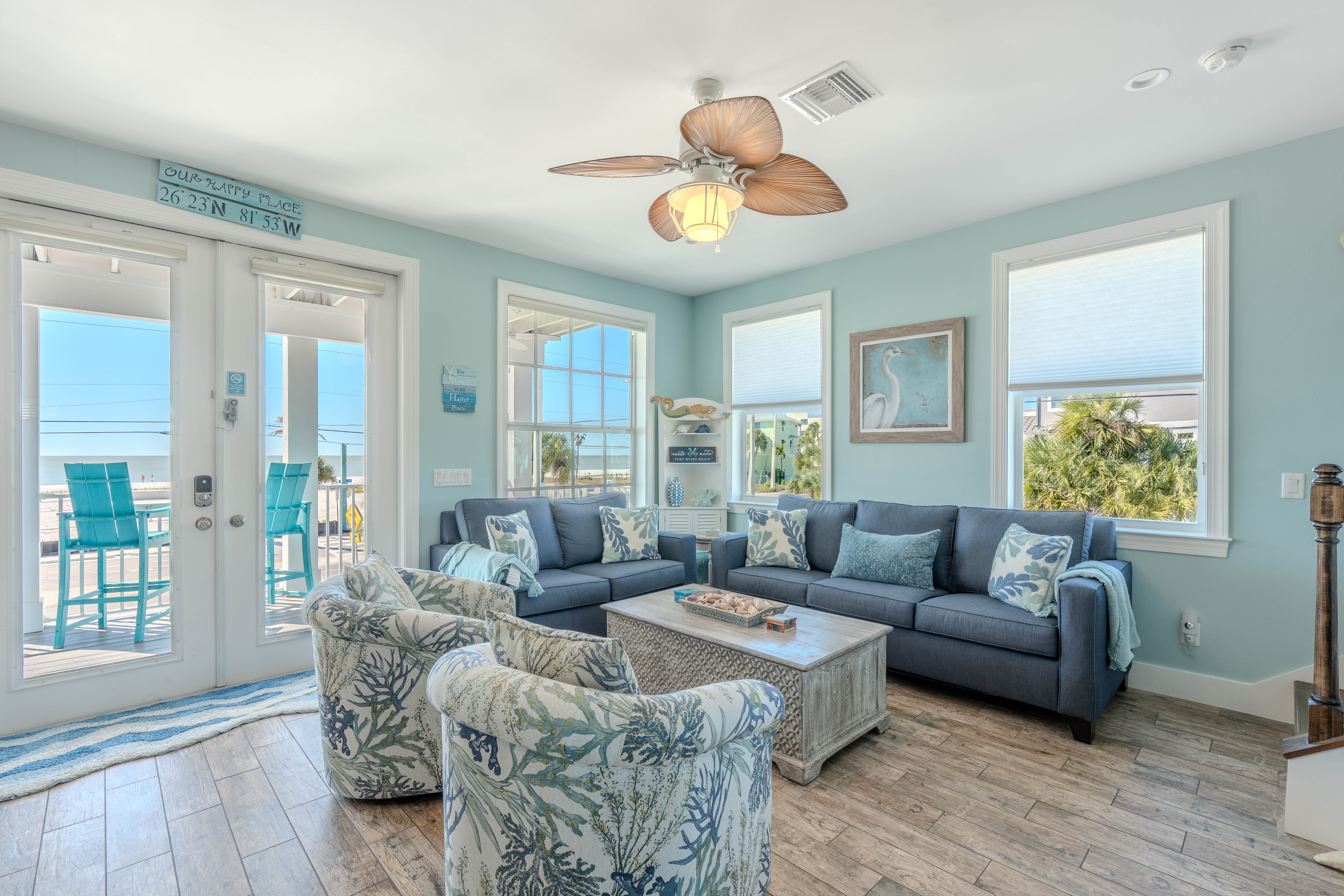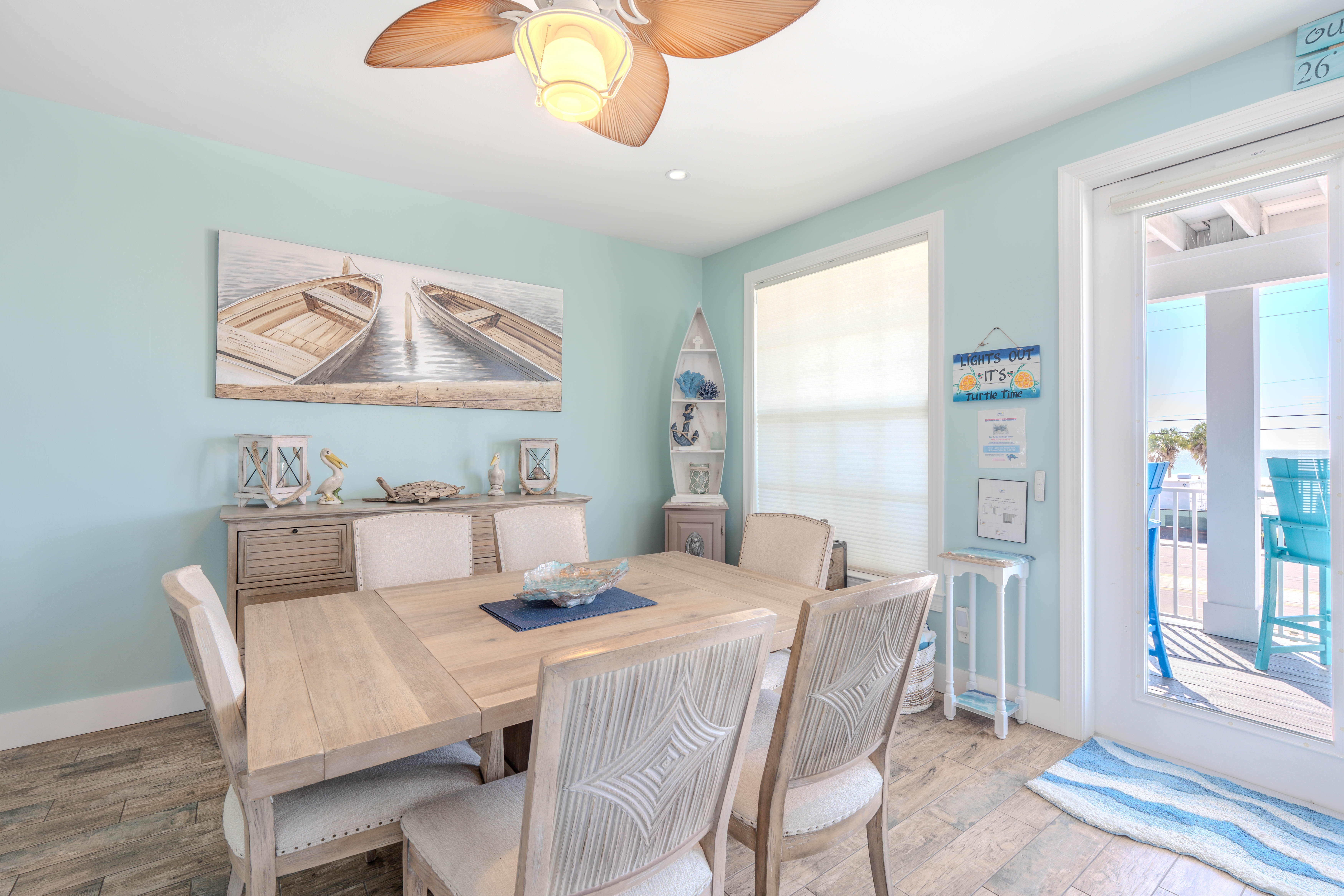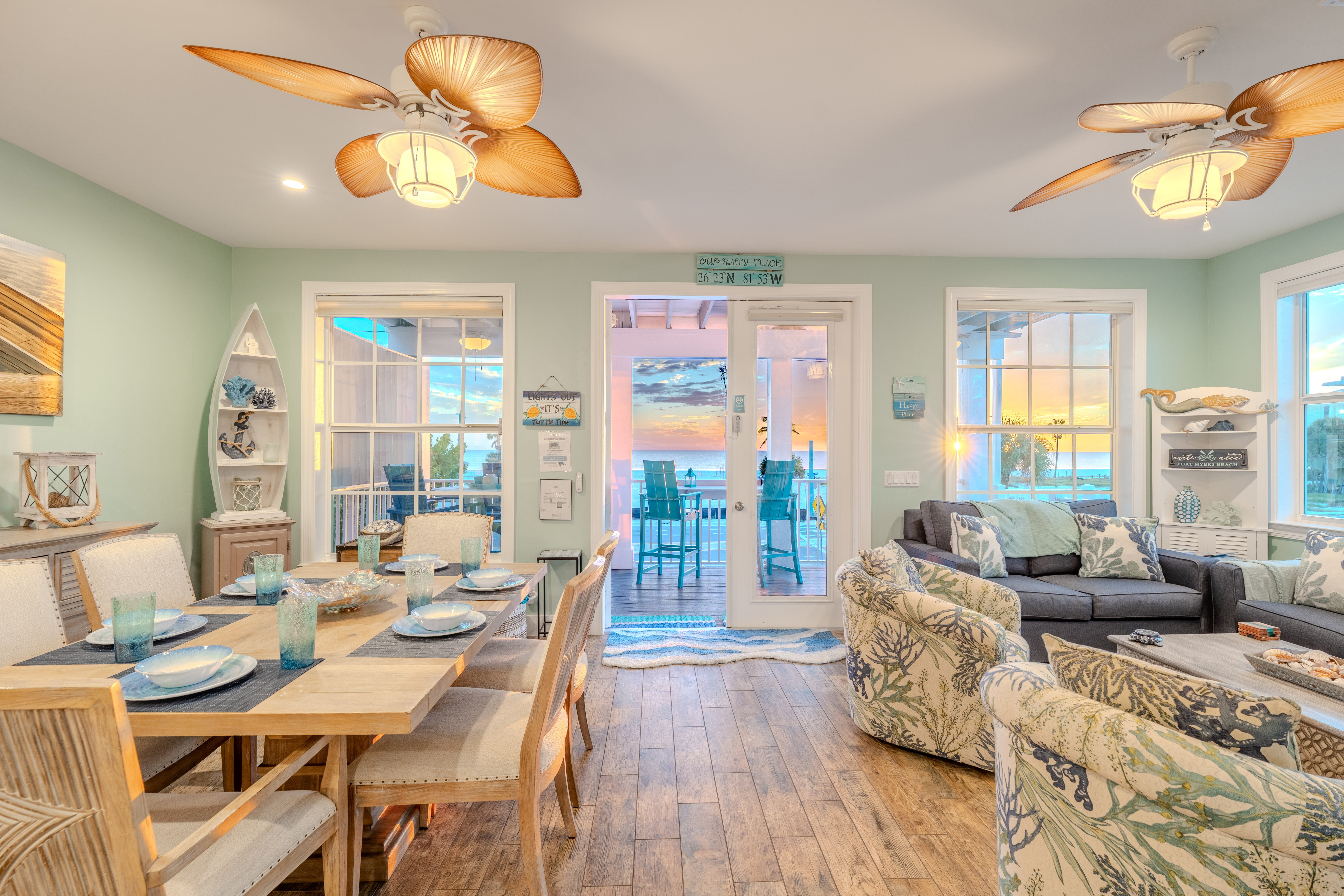 Ascend the stairs to the front balcony, offering unparalleled gulf-front vistas and mesmerizing sunsets. Inside, an open-concept living room, dining area, and updated kitchen beckon, complete with a Margaritaville blender, Keurig, Insta Pot and other culinary essentials. Seating 6, extendable to 8, the dining room facilitates intimate meals or lively family game nights. Adjacent, the family room offers extra sleeping space on a pull-out queen sofa, accompanied by an array of games for cherished family bonding. This floor also has a full bathroom, including a shower/tub combo.