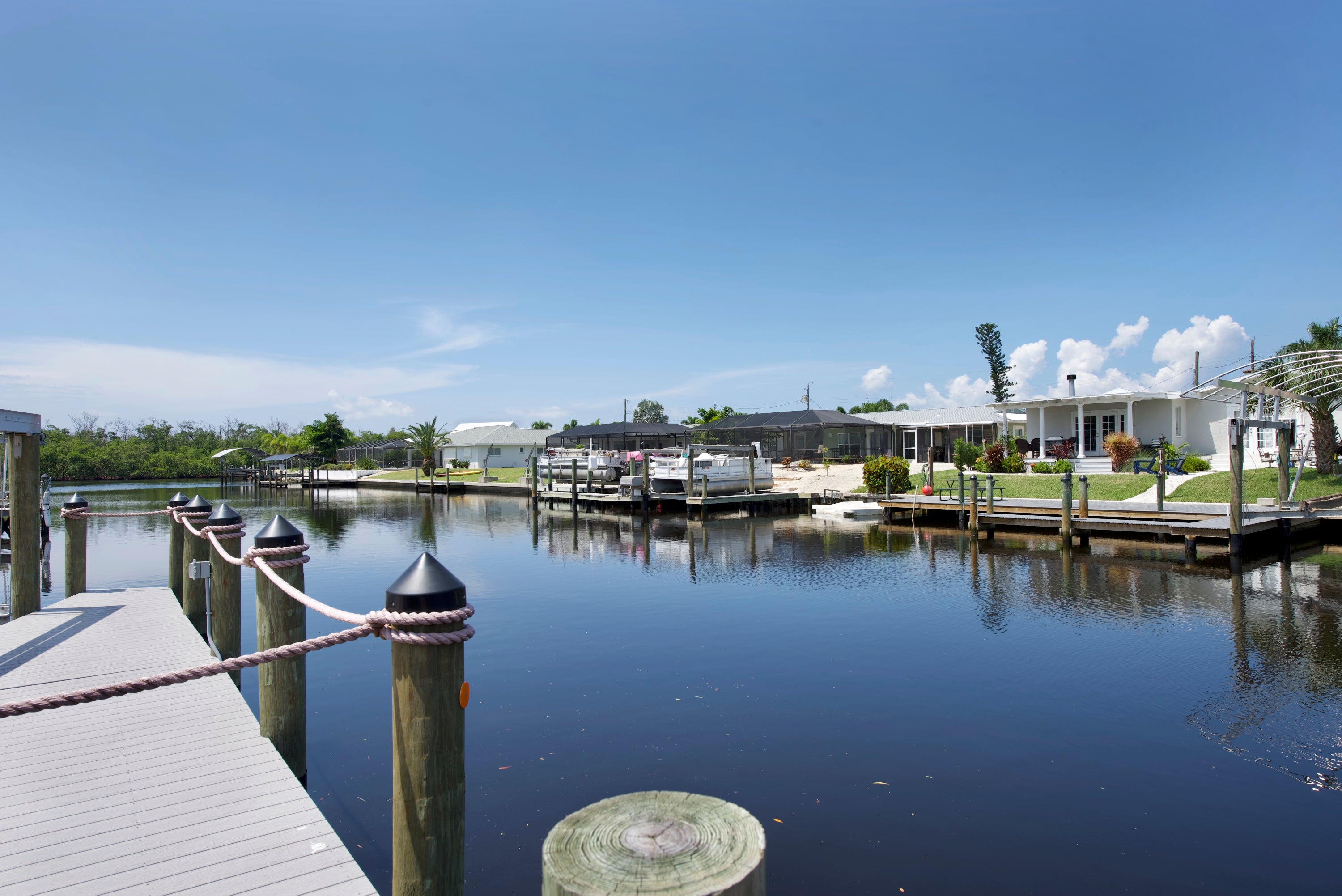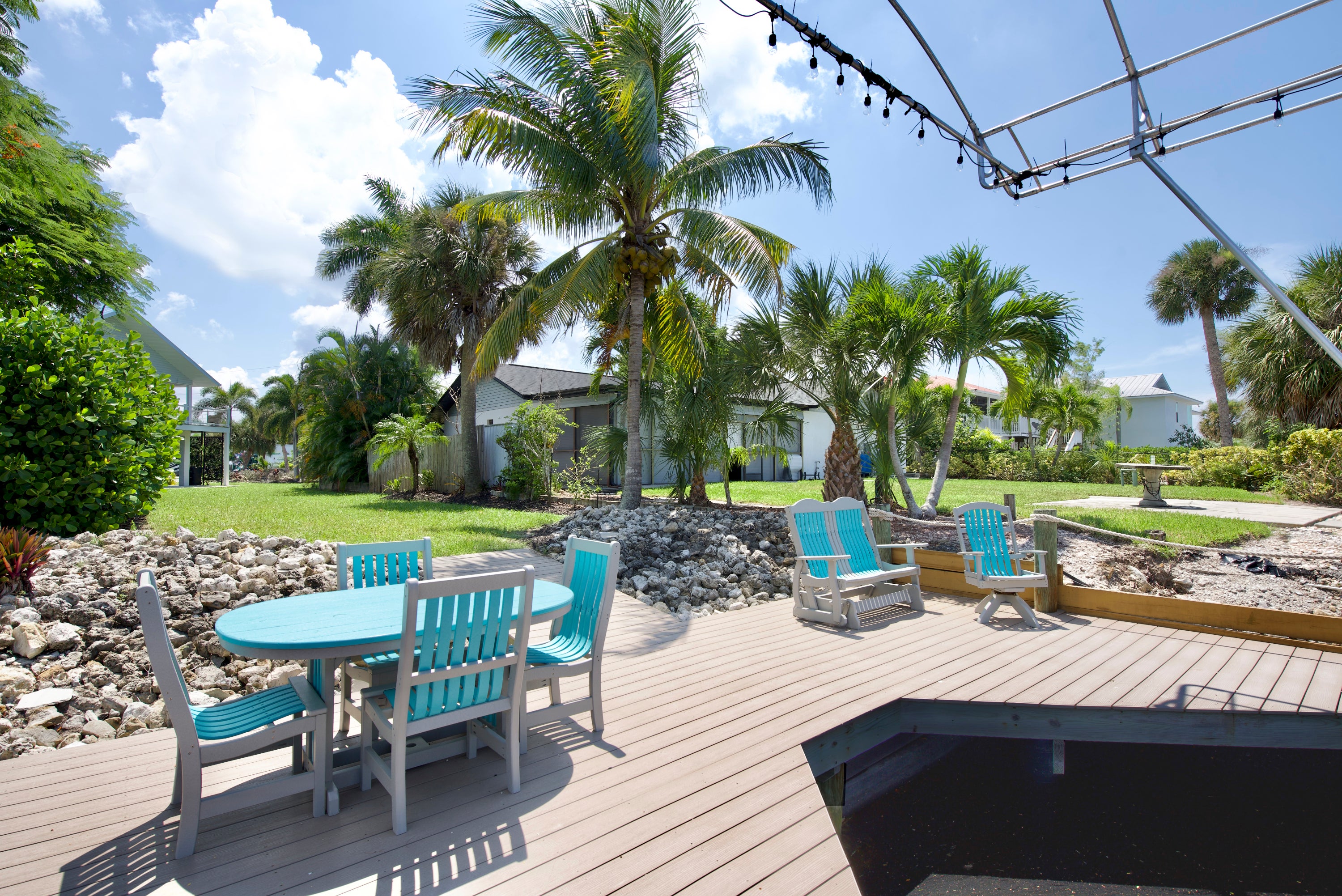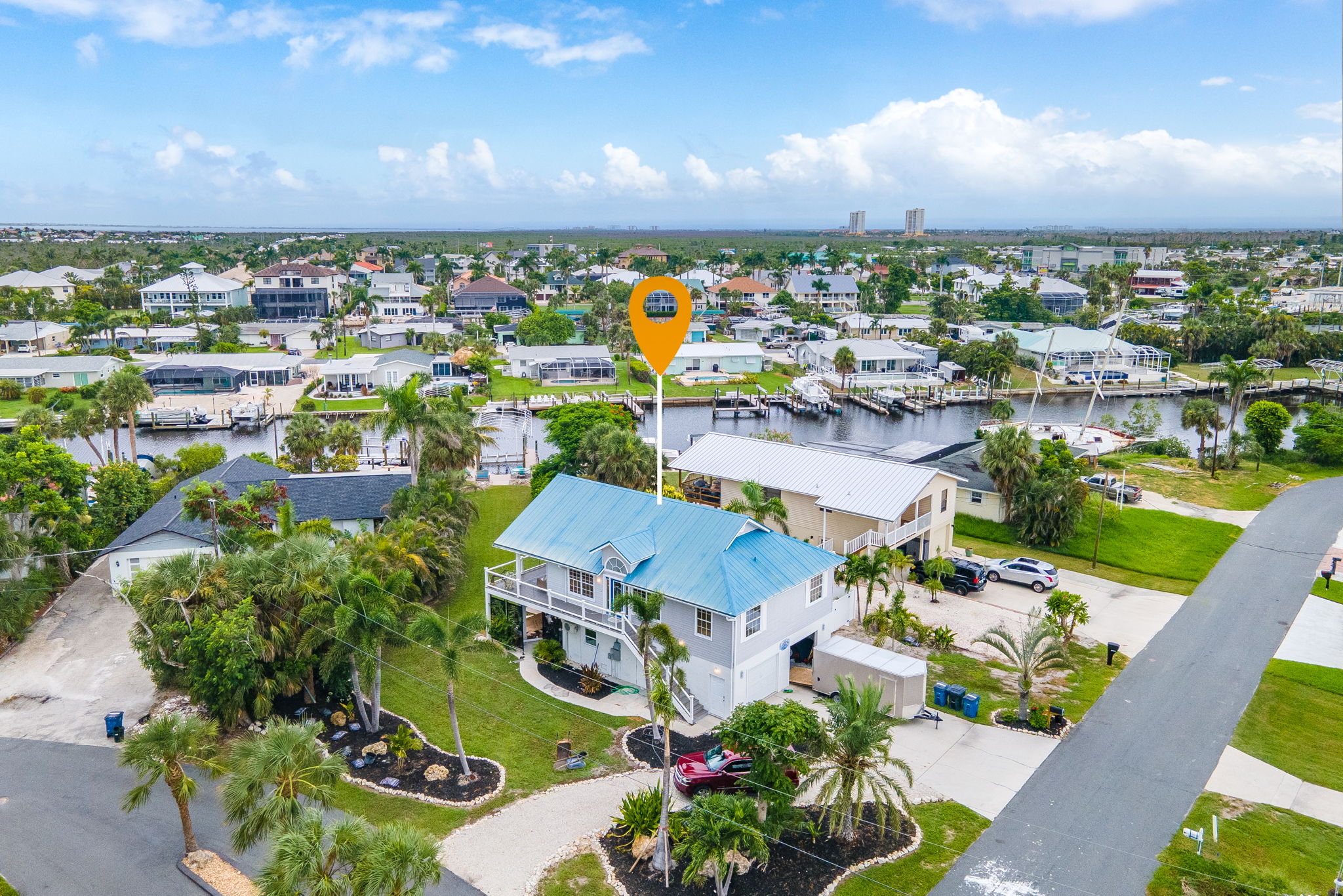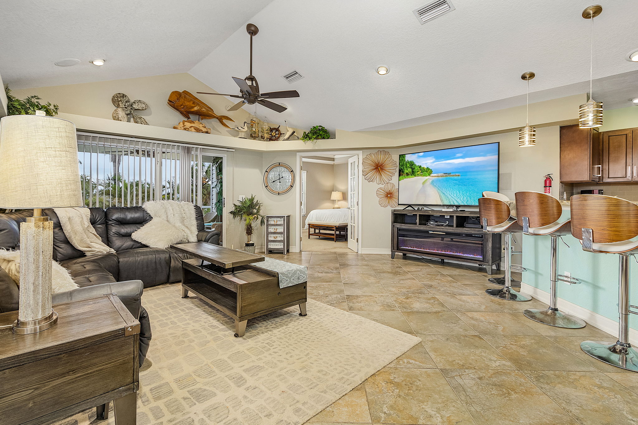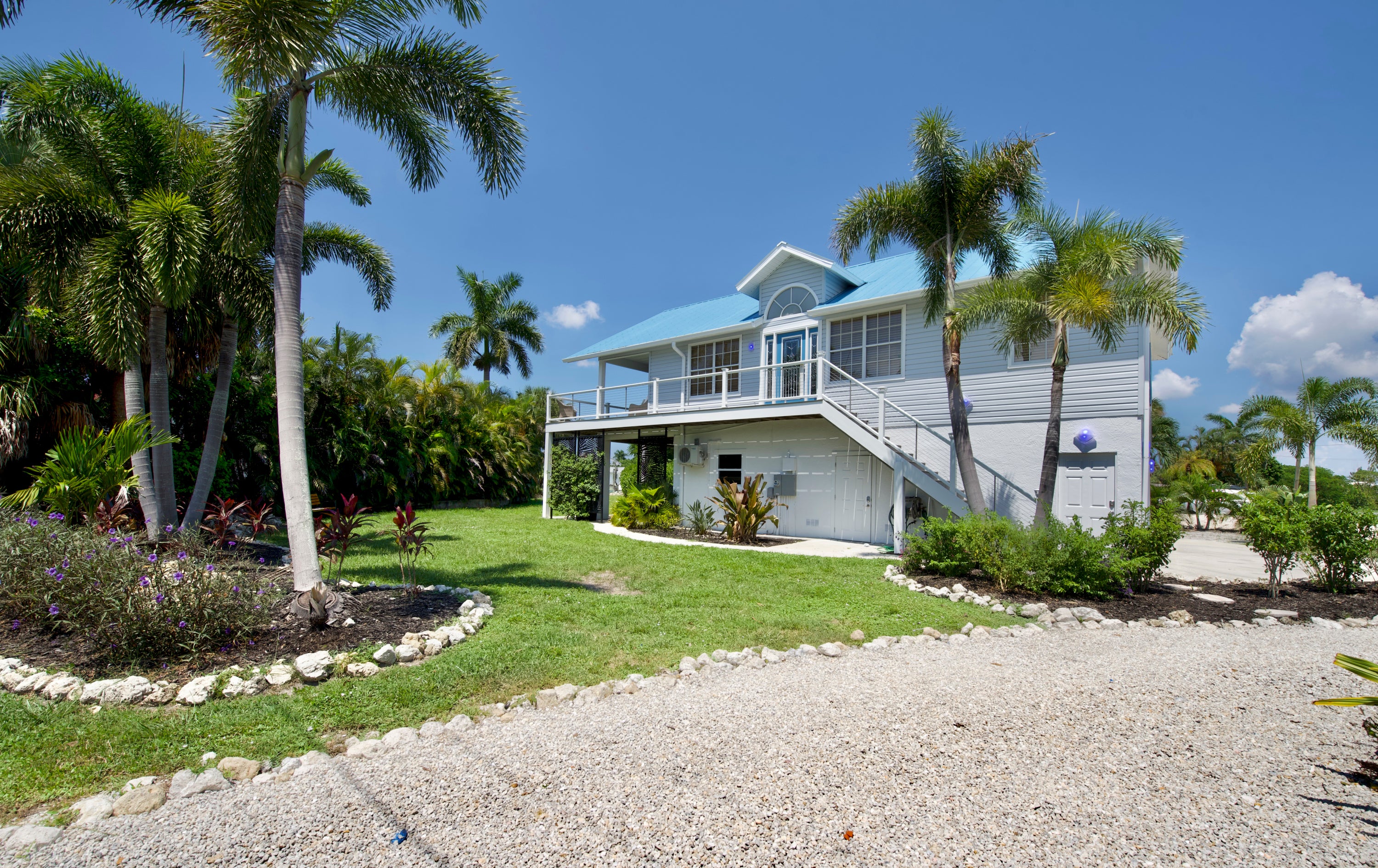Welcome to The Sanctuary! This beautiful three-bedroom home sits across the bridge from Fort Myers Beach and is located on a canal to provide a perfect opportunity to explore the area from the water. Just bring your small boat or kayak and tie it up to the dock at the back of the house! The dock provides outdoor seating while viewing the Florida "locals" that may swim or fly past. An open floor plan with vaulted ceilings and plenty of natural light welcomes you indoors. The living room features a large leather sectional with a recliner and a giant flat screen TV. Sliding glass doors lead to a covered balcony that overlooks the yard and canal. Comfortable furnishings and grill will make you want to stay forever. Off of the living room, there is the primary bedroom with a king bed, tray ceilings, balcony access, and an attached bath. The primary bathroom has dual sinks and a spacious walk-in shower with two shower heads. Additional guests will find a queen guest bedroom, a bunk room with a custom murphy bed style bed, and a sofa sleeper. This home sleeps up to 7 guests comfortably. Come visit The Sanctuary and live like a local!