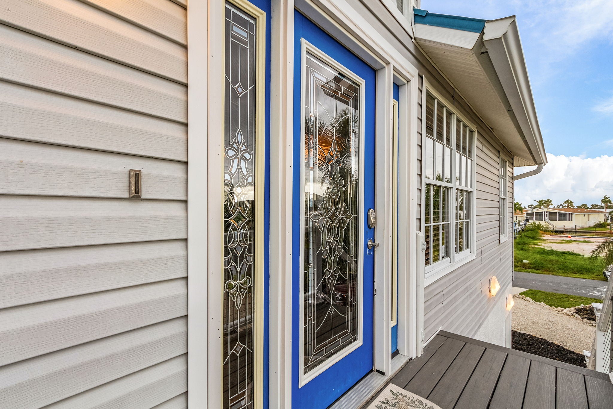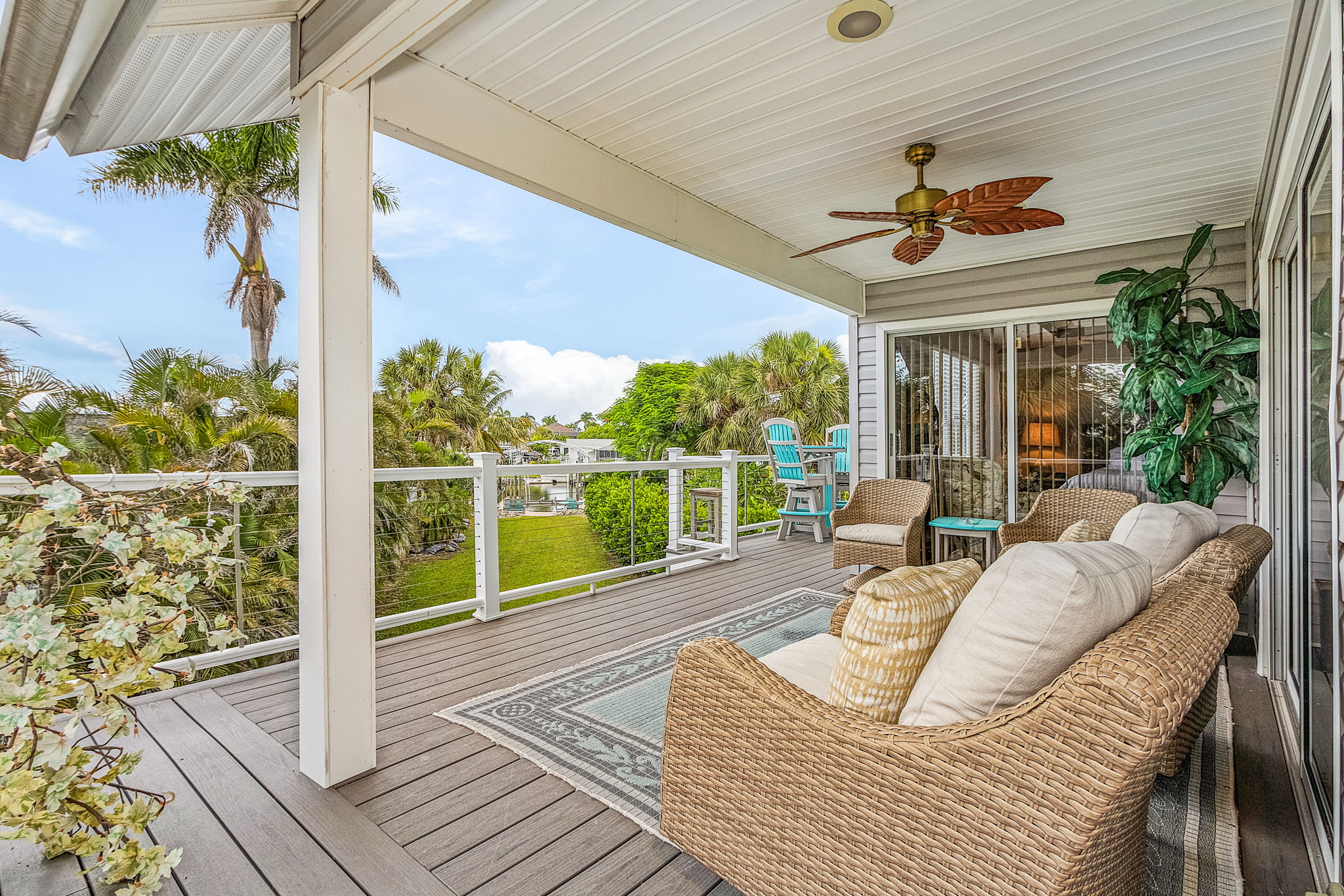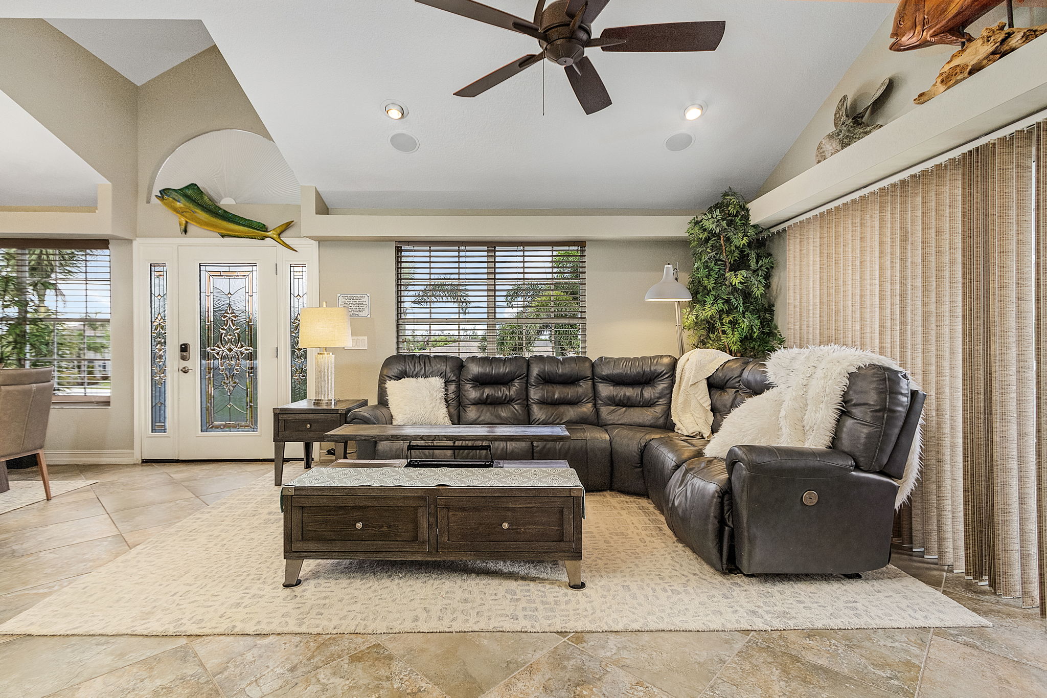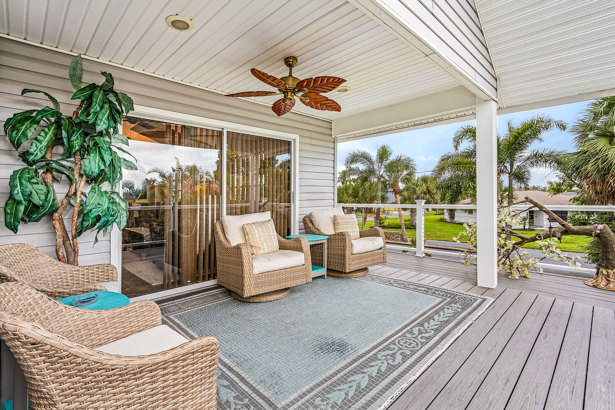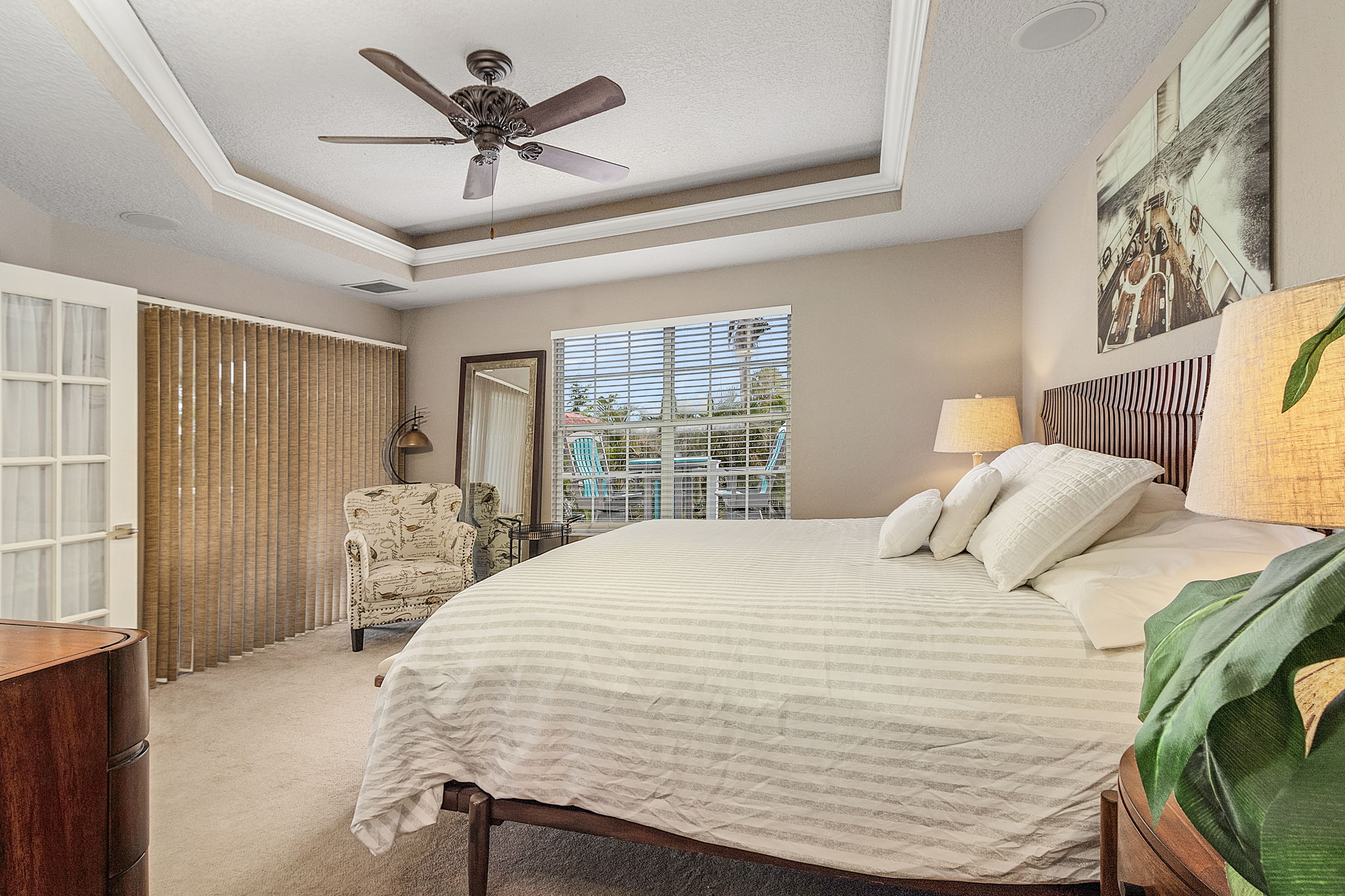 Welcome to The Sanctuary! This beautiful three-bedroom home sits across the bridge from Fort Myers Beach and is located on a canal to provide a perfect opportunity to explore the area from the water. Just bring your small boat or kayak and tie it up to the dock at the back of the house! The dock provides outdoor seating while viewing the Florida "locals" that may swim or fly past. An open floor plan with vaulted ceilings and plenty of natural light welcomes you indoors. The living room features a large leather sectional with a recliner and a giant flat screen TV. Sliding glass doors lead to a covered balcony that overlooks the yard and canal. Comfortable furnishings and grill will make you want to stay forever. Off of the living room, there is the primary bedroom with a king bed, tray ceilings, balcony access, and an attached bath. The primary bathroom has dual sinks and a spacious walk-in shower with two shower heads. Additional guests will find a queen guest bedroom, a bunk room with a custom murphy bed style bed, and a sofa sleeper. This home sleeps up to 7 guests comfortably. Come visit The Sanctuary and live like a local!
