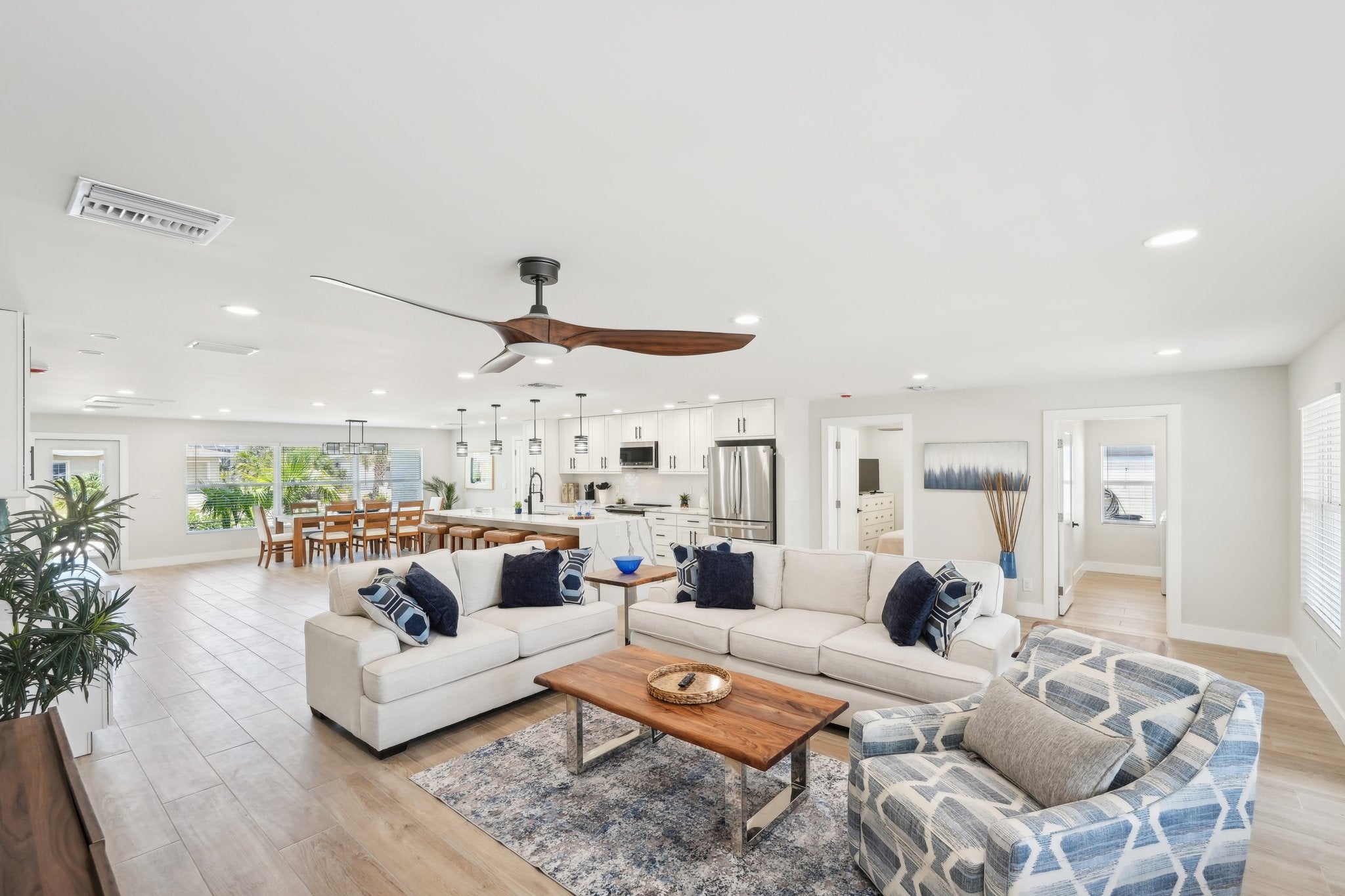 Welcome to your perfect waterfront escape! This beautifully remodeled 4-bedroom, 3-bathroom pool home is tucked away in the highly desirable Siesta Isles neighborhood and offers the ultimate blend of comfort, style, and coastal charm. With abundant airy, open living space, you’ll feel right at home the moment you walk through the door. The interior is decked out with designer finishes — porcelain wood-look tile, custom-tiled bathrooms, a sleek built-in bar with a wine fridge, and modern lighting throughout.