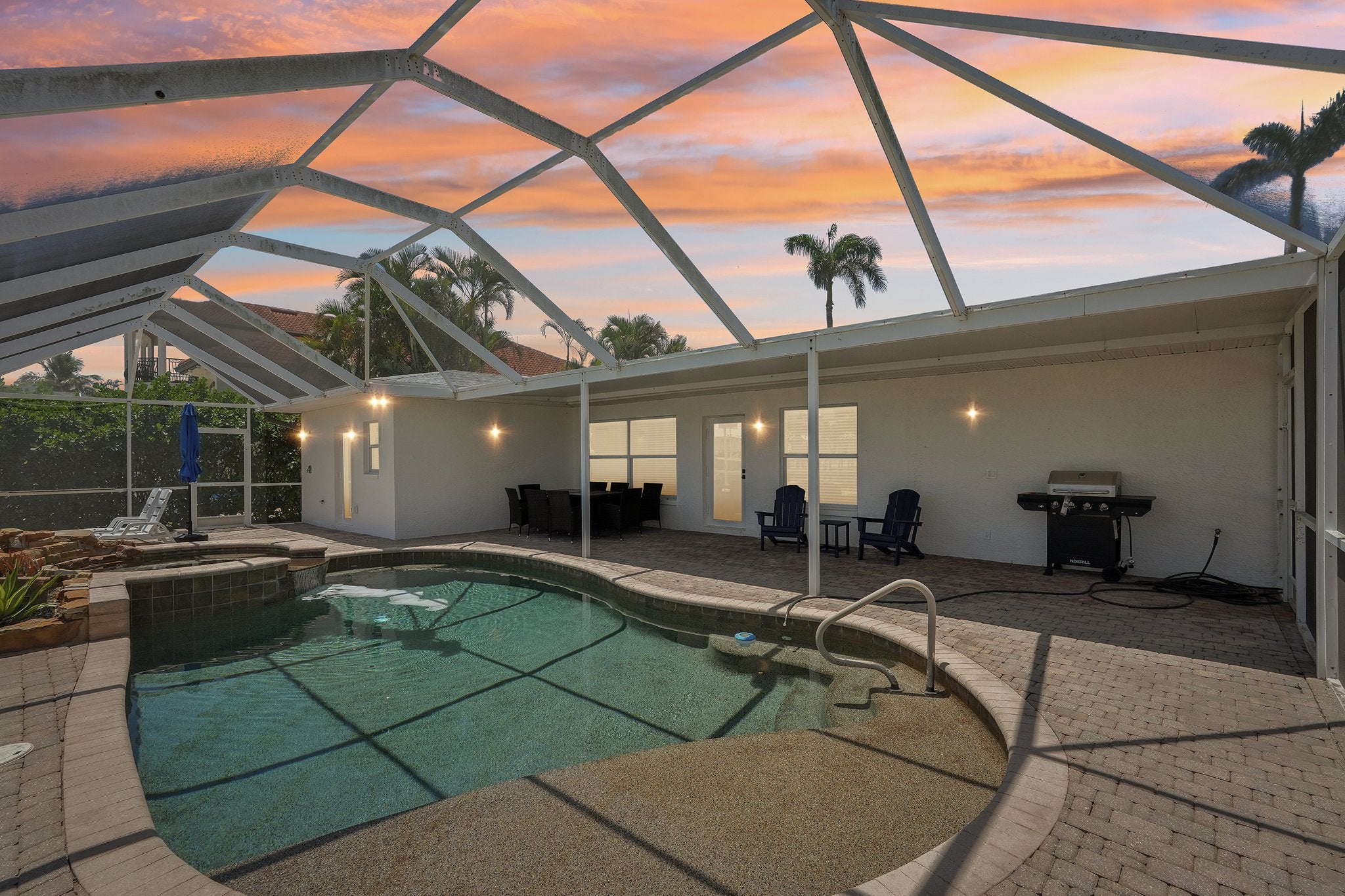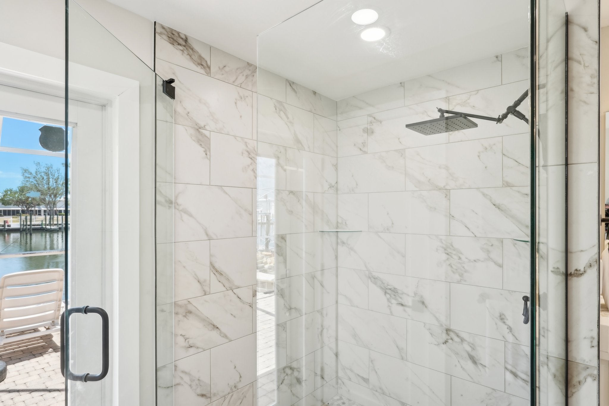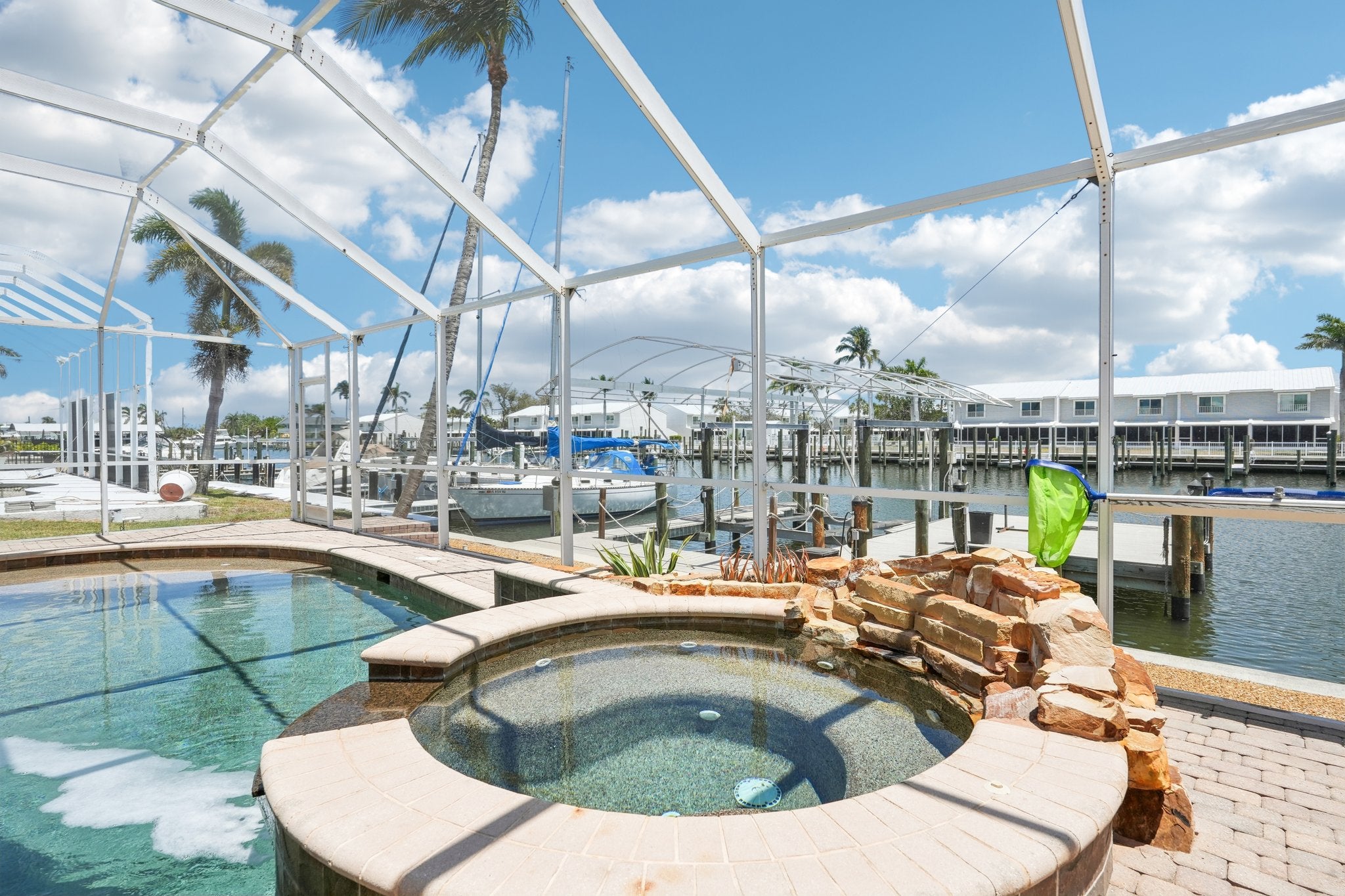 Love to cook? The gourmet kitchen is a showstopper, featuring quartz waterfall countertops, white shaker cabinets, a massive center island, and all the space you need to whip up something delicious while still being part of the conversation. Step outside and enjoy your own private backyard oasis. Lounge in the pool or soak in the hot tub while watching dolphins and manatees cruise by. With 75 feet of deep waterfront and your own private dock, you’ll have easy access to the Gulf in minutes — whether you’re into boating, sailing, or just sunset cruising.