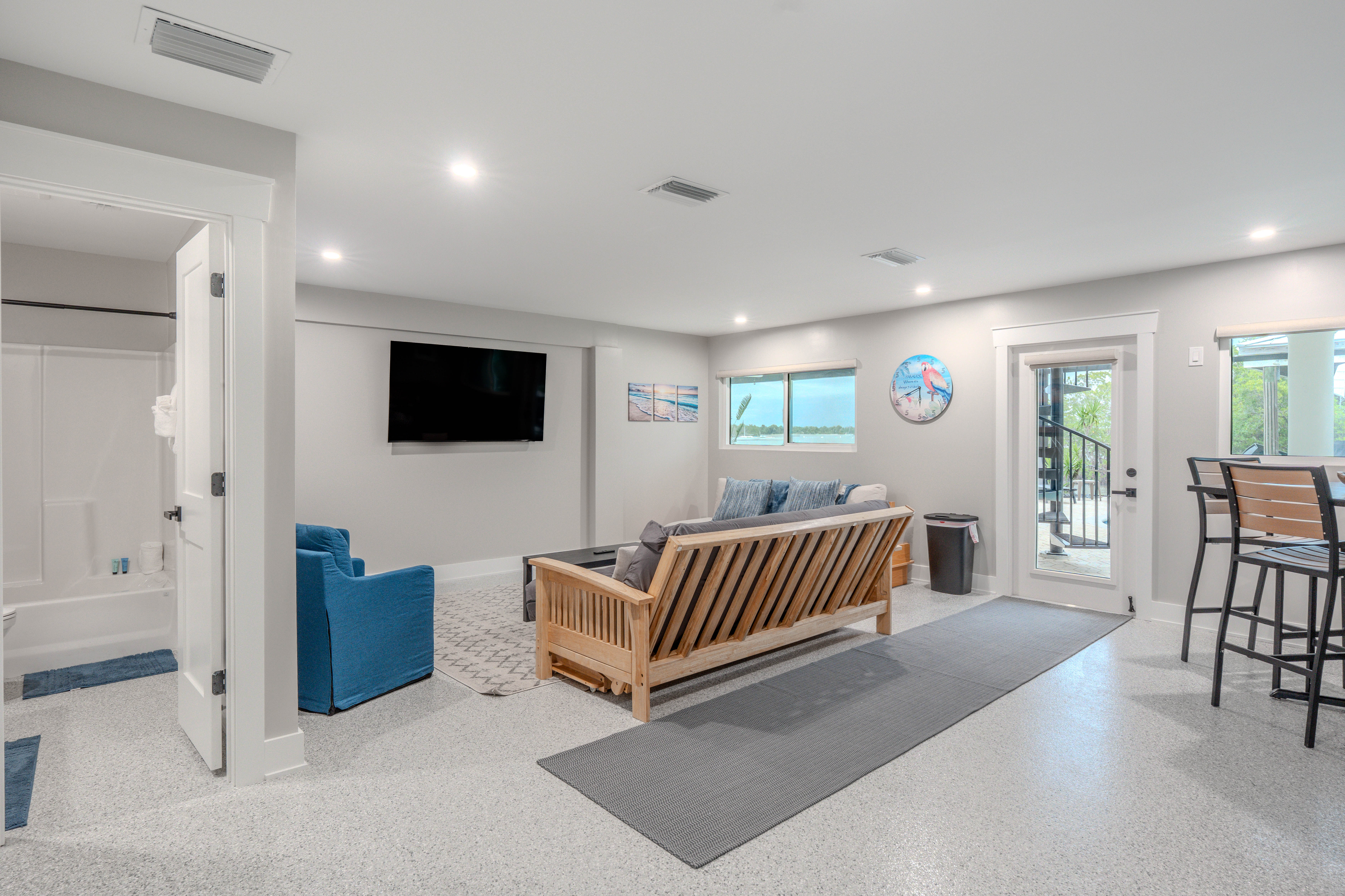 Inside, the home features a bright, open-concept living area designed for comfort, along with three spacious bedrooms and three beautifully appointed bathrooms. The home also includes a ground-level living room with a TV and additional sleeping space, making it ideal for families or extra guests. Fresh linens, towels, and quality amenities are provided for a worry-free stay.