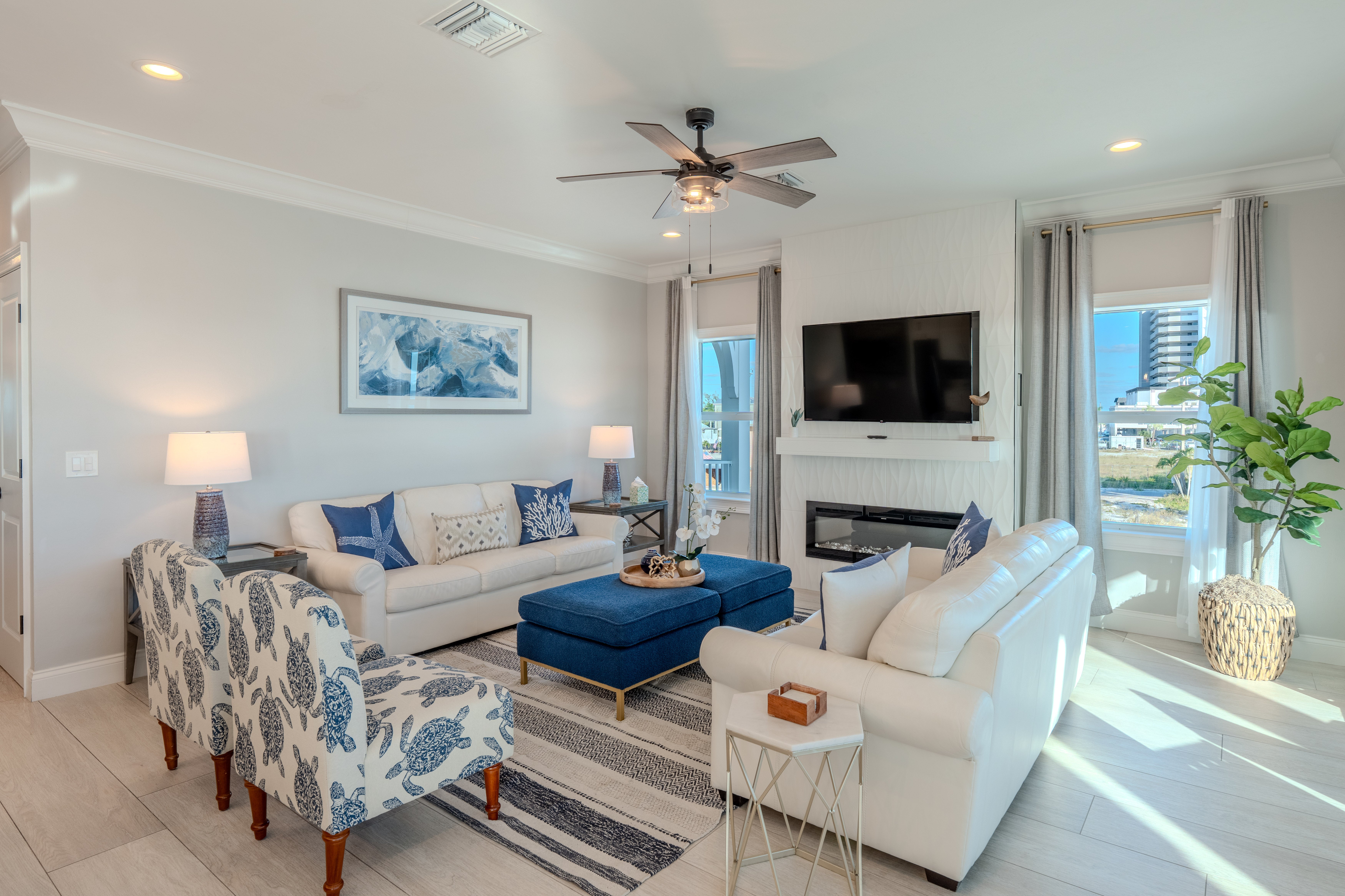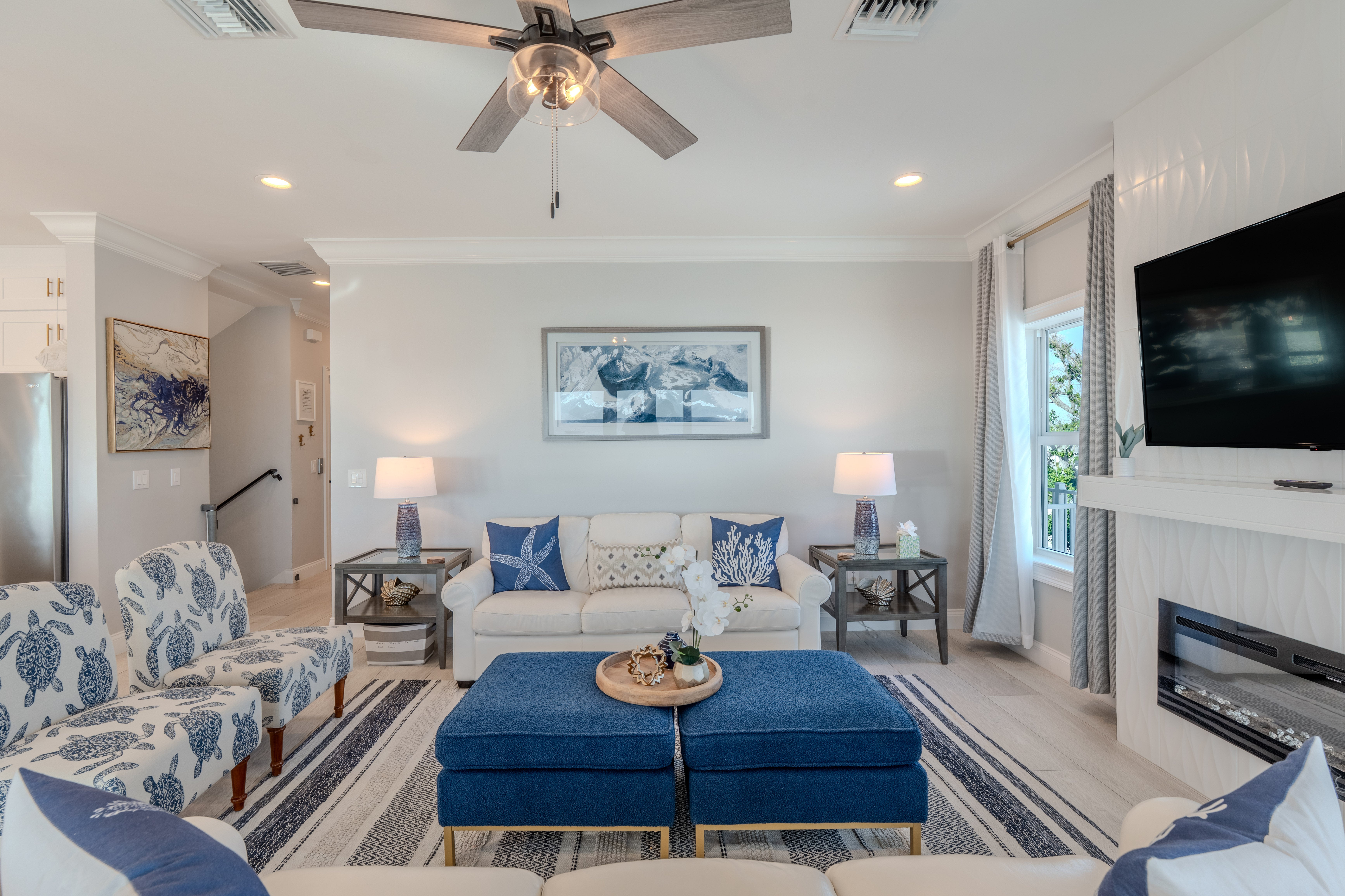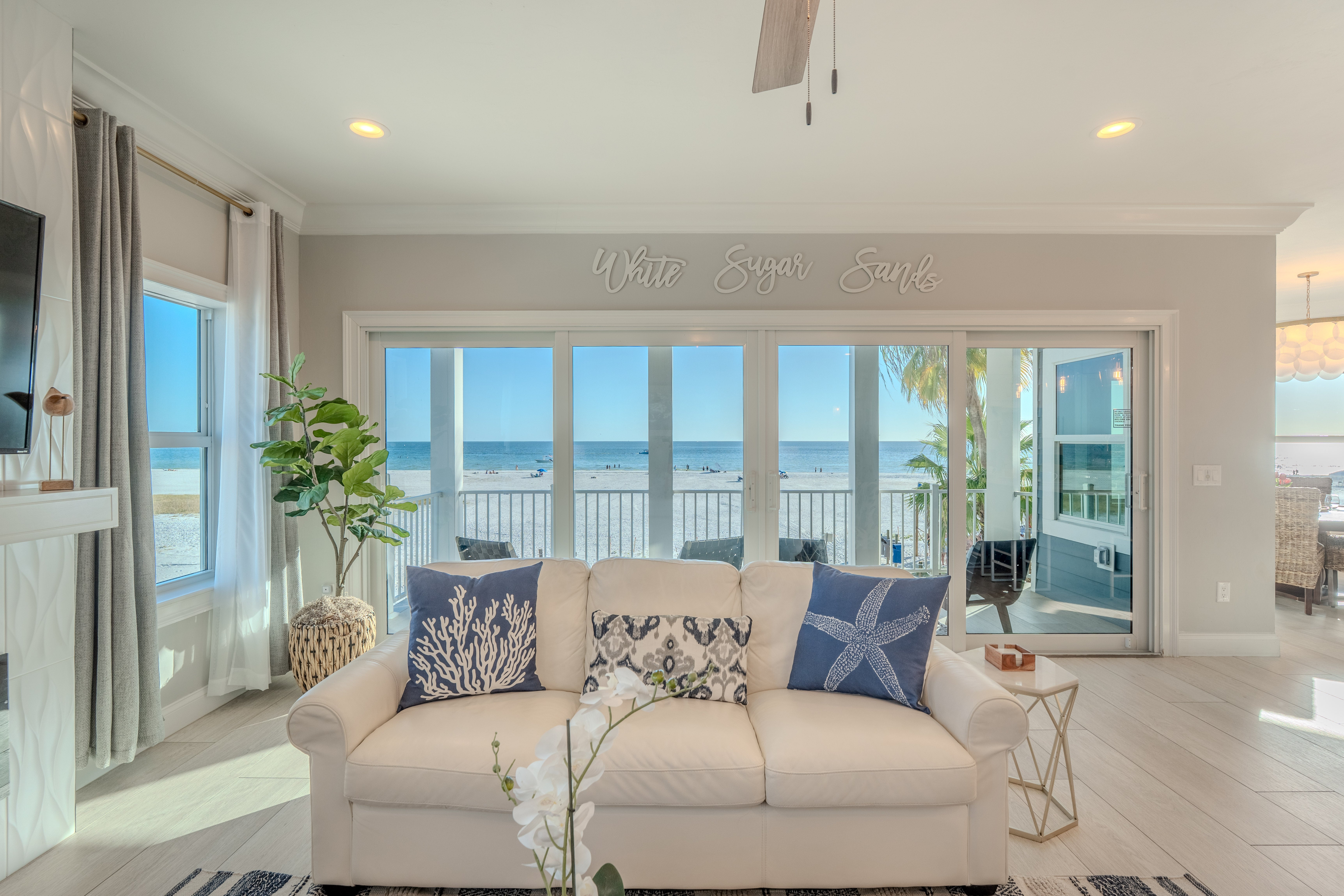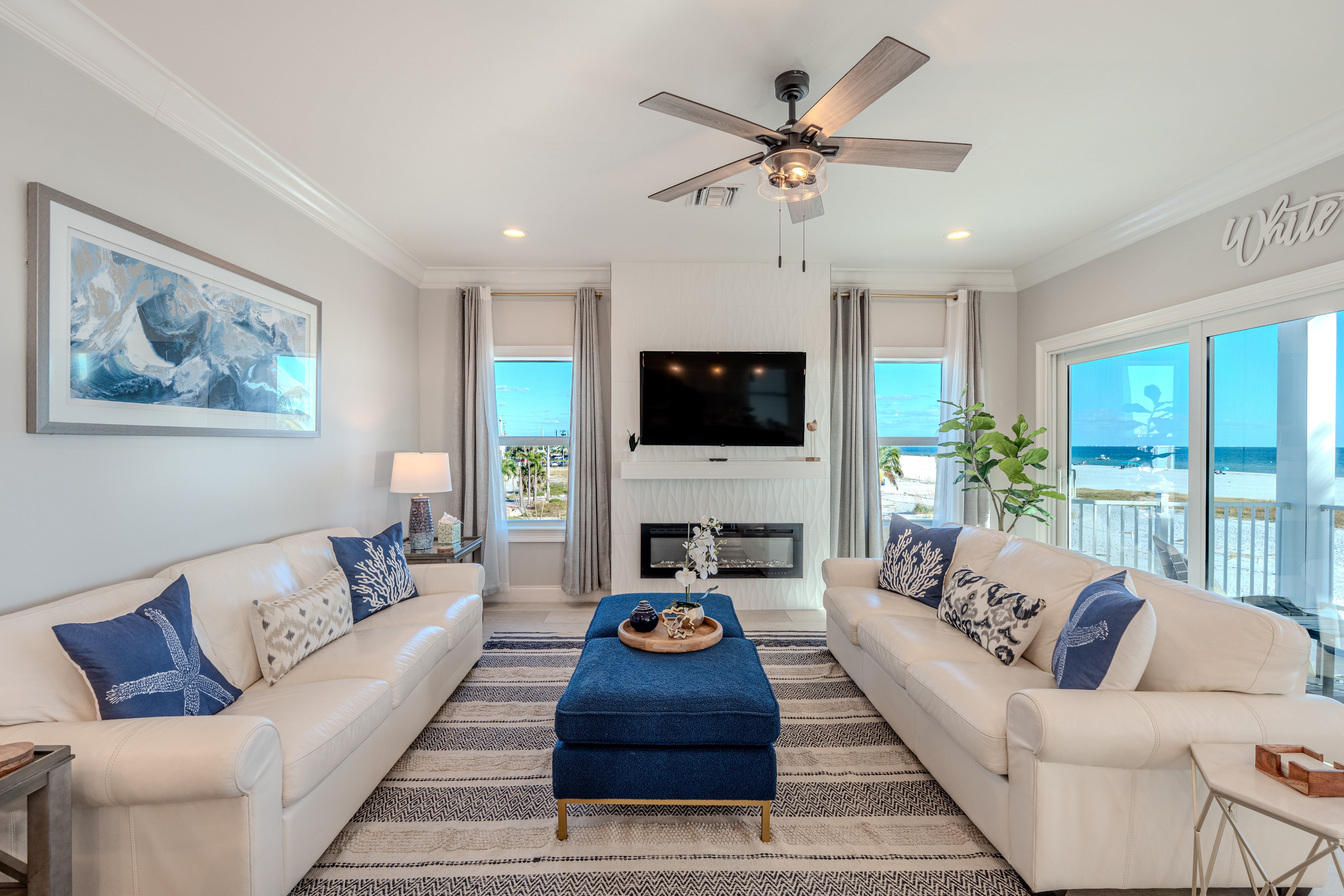 Fireplace 55' TV Ceiling Fan Balcony overlooking the beach