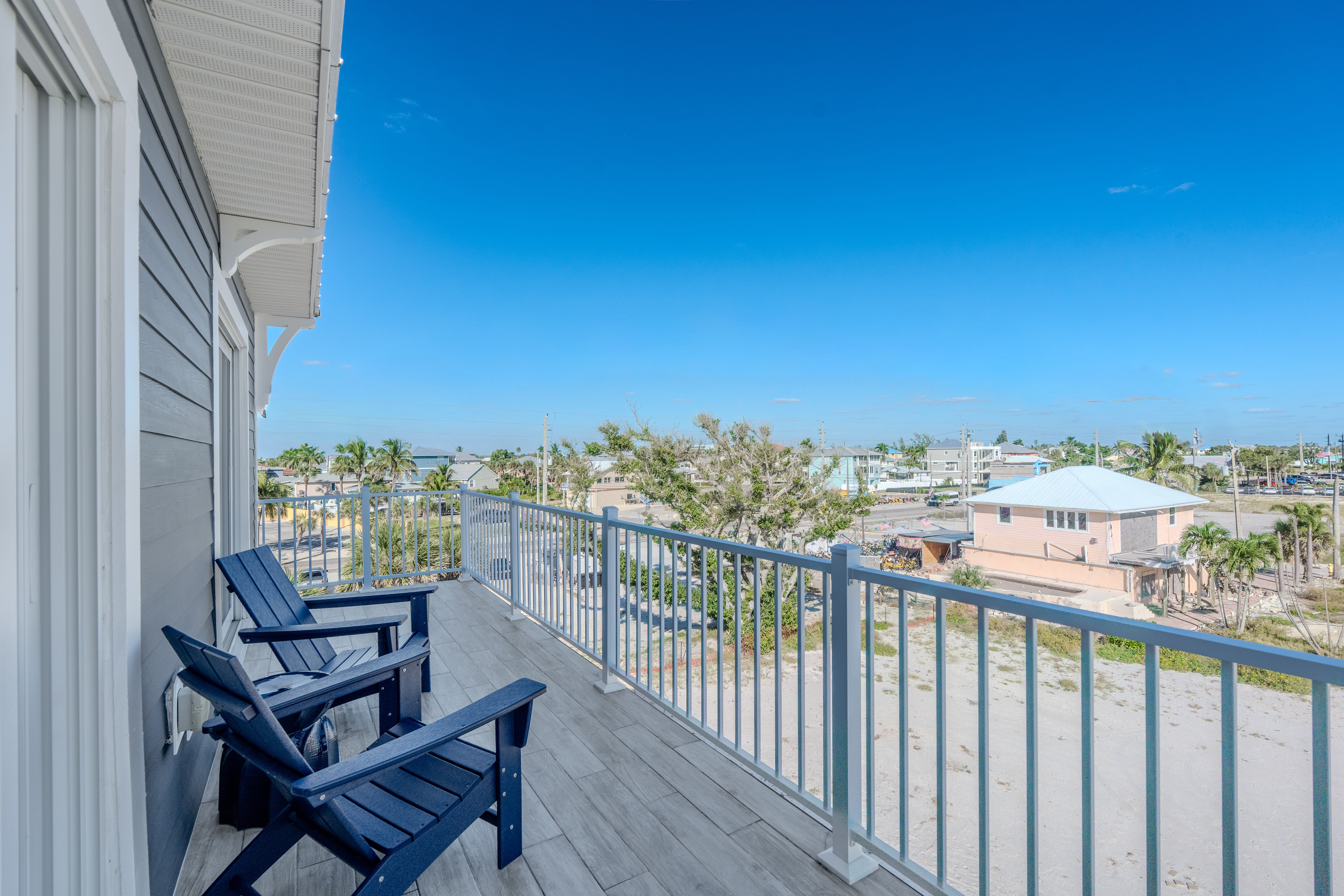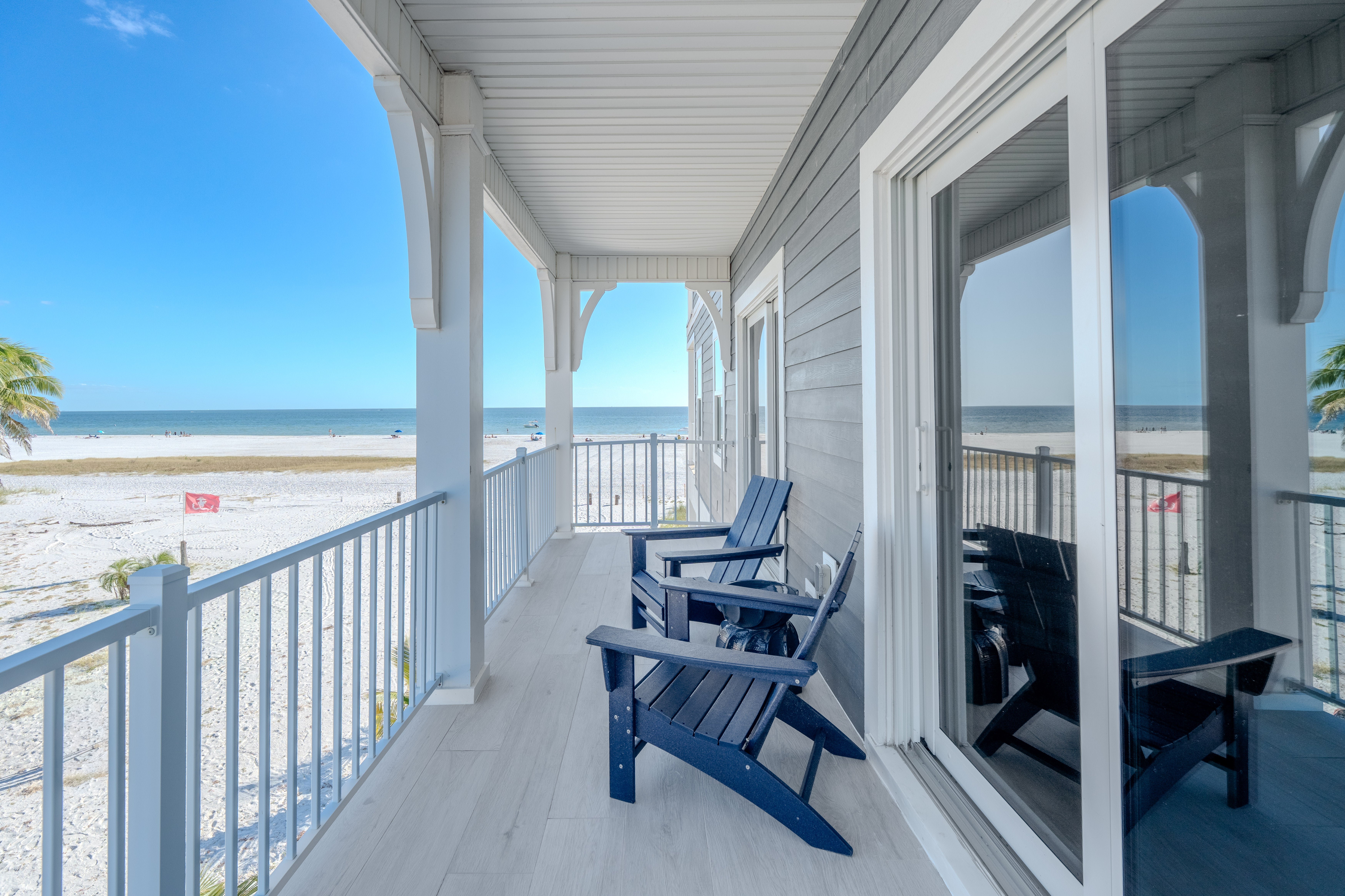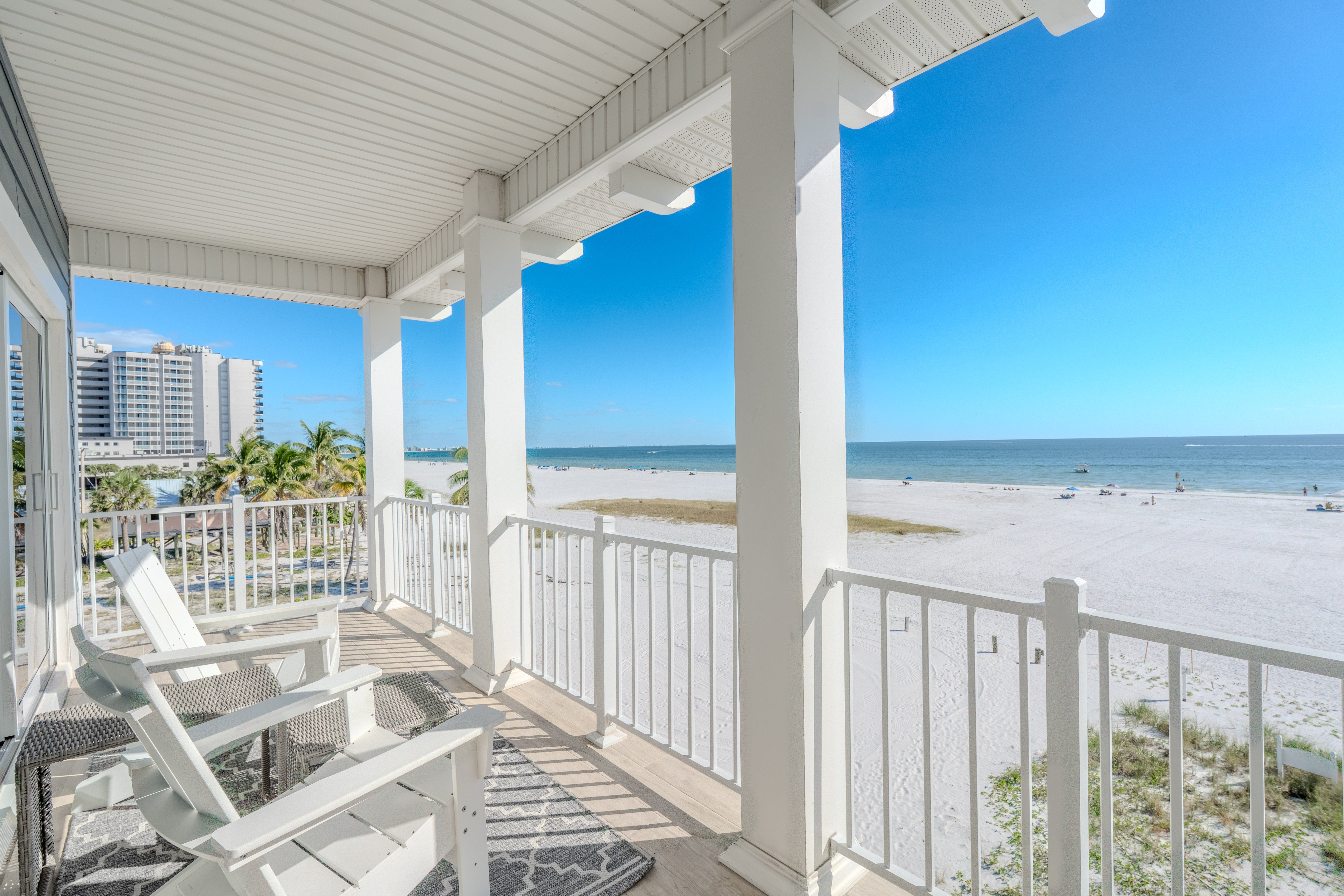 Welcome to the stunning White Sugar Sands located on the North end of Fort Myers Beach. Enjoy spectacular panoramic views of the Gulf of Mexico and incredible sunsets, a private heated swimming pool, and resort style outdoor furnishings from this beach front home. This spacious home features 5 bedrooms on 2 levels, four of them with an en suite and every one of them with a private balcony with Adirondack chairs offering breathtaking views. An elegant kitchen with great white with gold accents, granite counter tops, and stainless-steel appliances is the perfect place to whip up a scrumptious meal. Coastal décor throughout the home is warm and inviting, making this home perfect for a large family or a group of friends. Come stay in the lap of luxury for your next Fort Myers Beach vacation at White Sugar Sands.