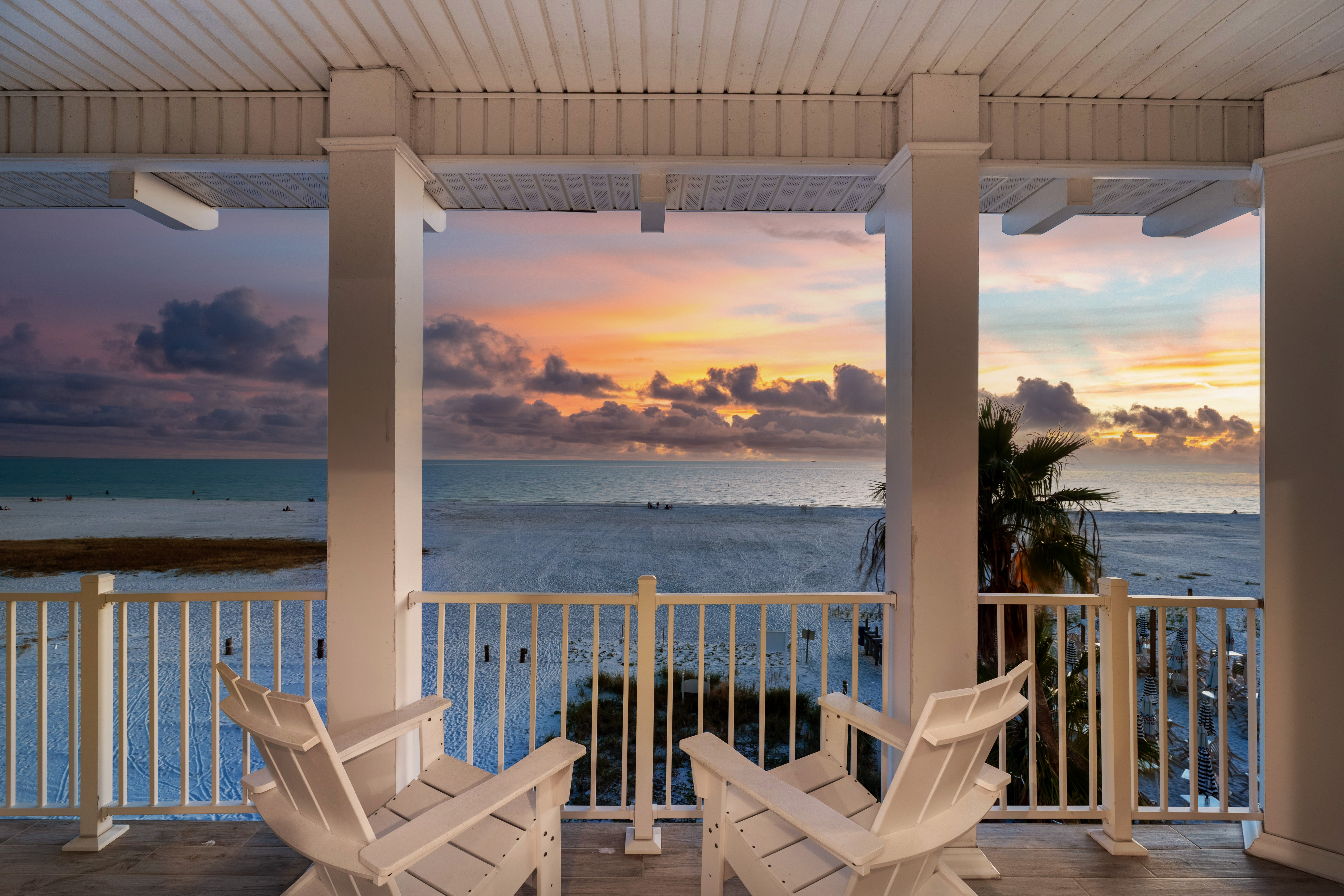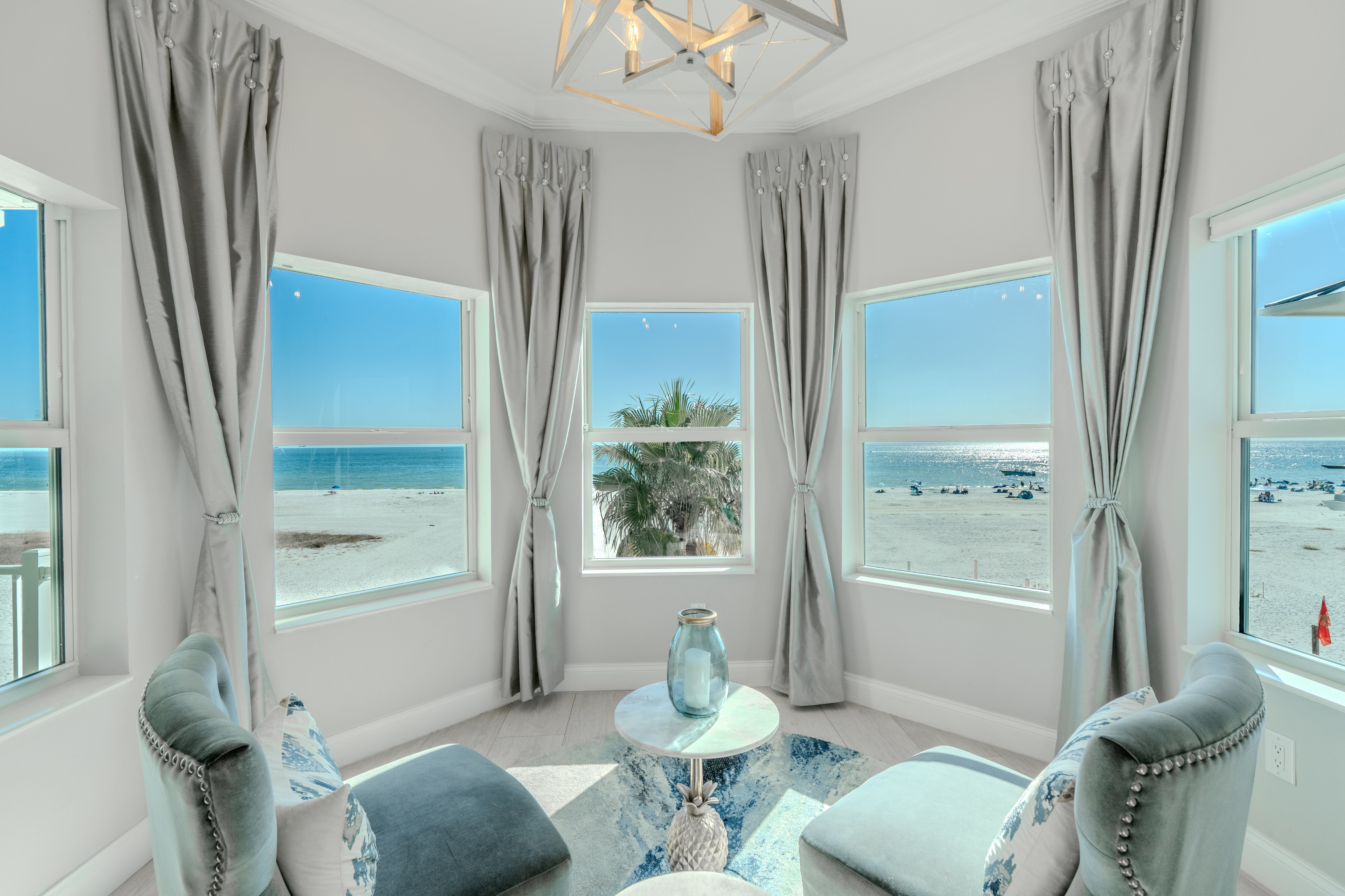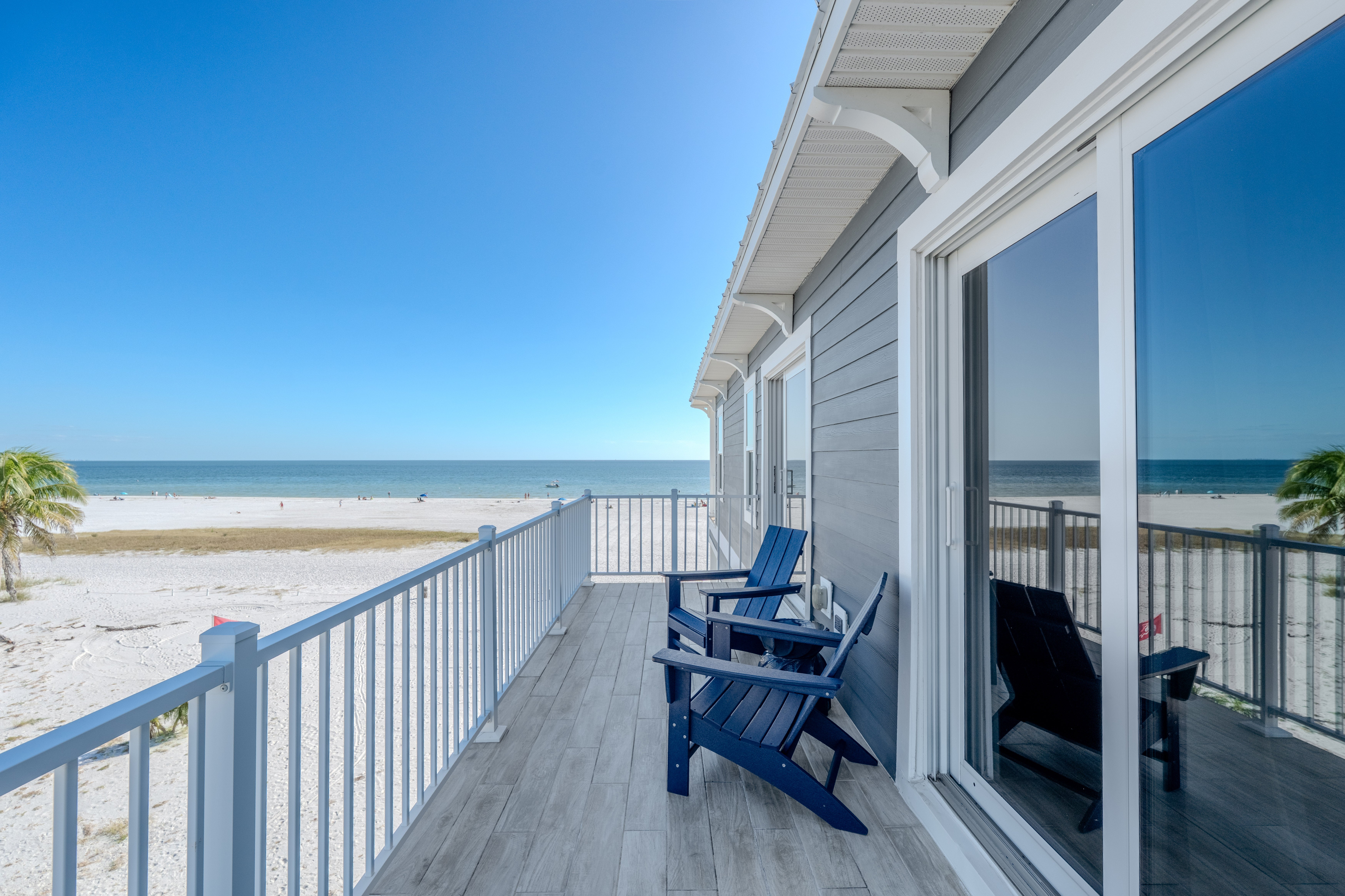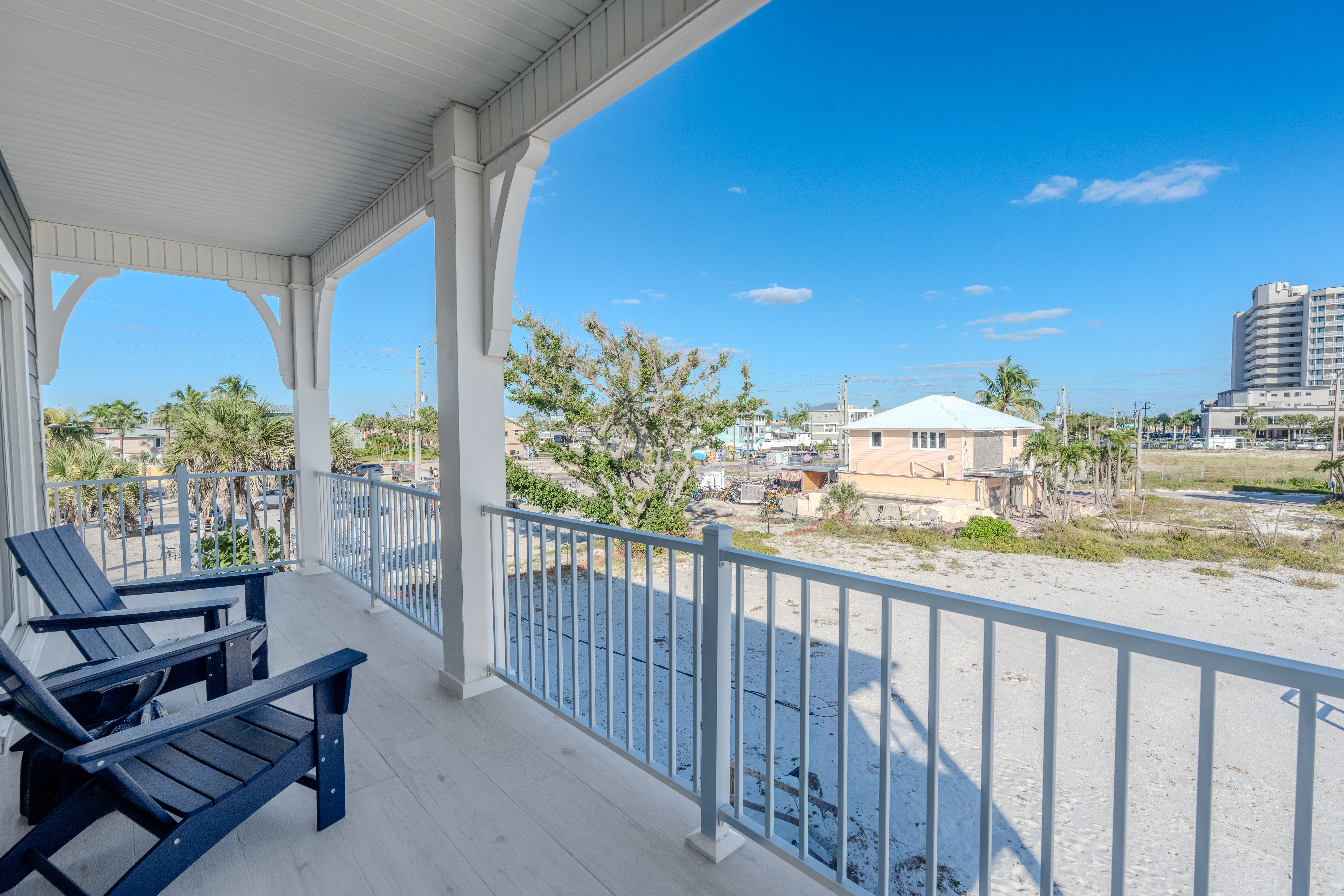 Welcome to the stunning White Sugar Sands located on the North end of Fort Myers Beach. Enjoy spectacular panoramic views of the Gulf of Mexico and incredible sunsets, a private heated swimming pool, and resort style outdoor furnishings from this beach front home. This spacious home features 5 bedrooms on 2 levels, four of them with an en suite and every one of them with a private balcony with Adirondack chairs offering breathtaking views. An elegant kitchen with great white with gold accents, granite counter tops, and stainless-steel appliances is the perfect place to whip up a scrumptious meal. Coastal décor throughout the home is warm and inviting, making this home perfect for a large family or a group of friends. Come stay in the lap of luxury for your next Fort Myers Beach vacation at White Sugar Sands.