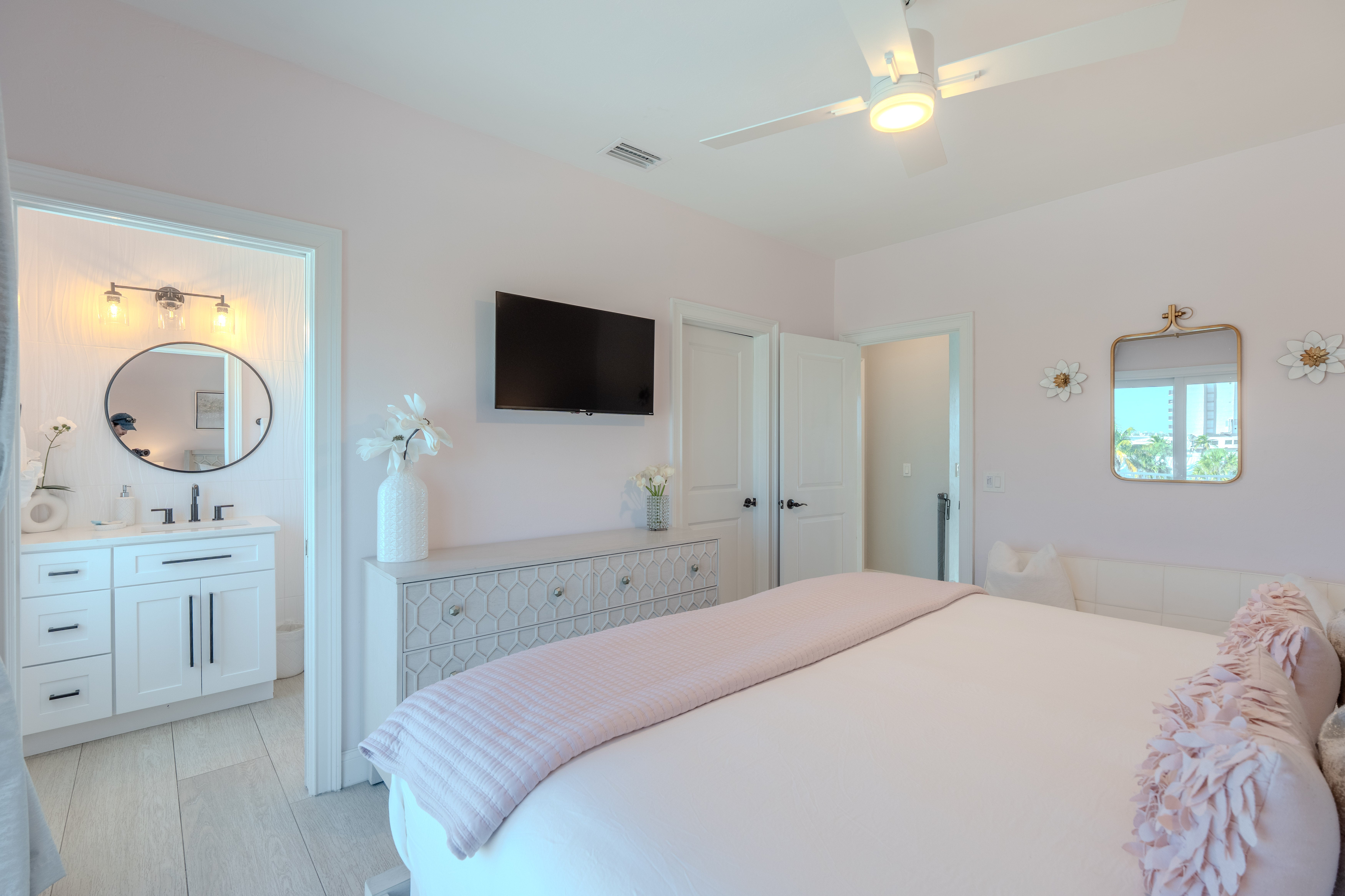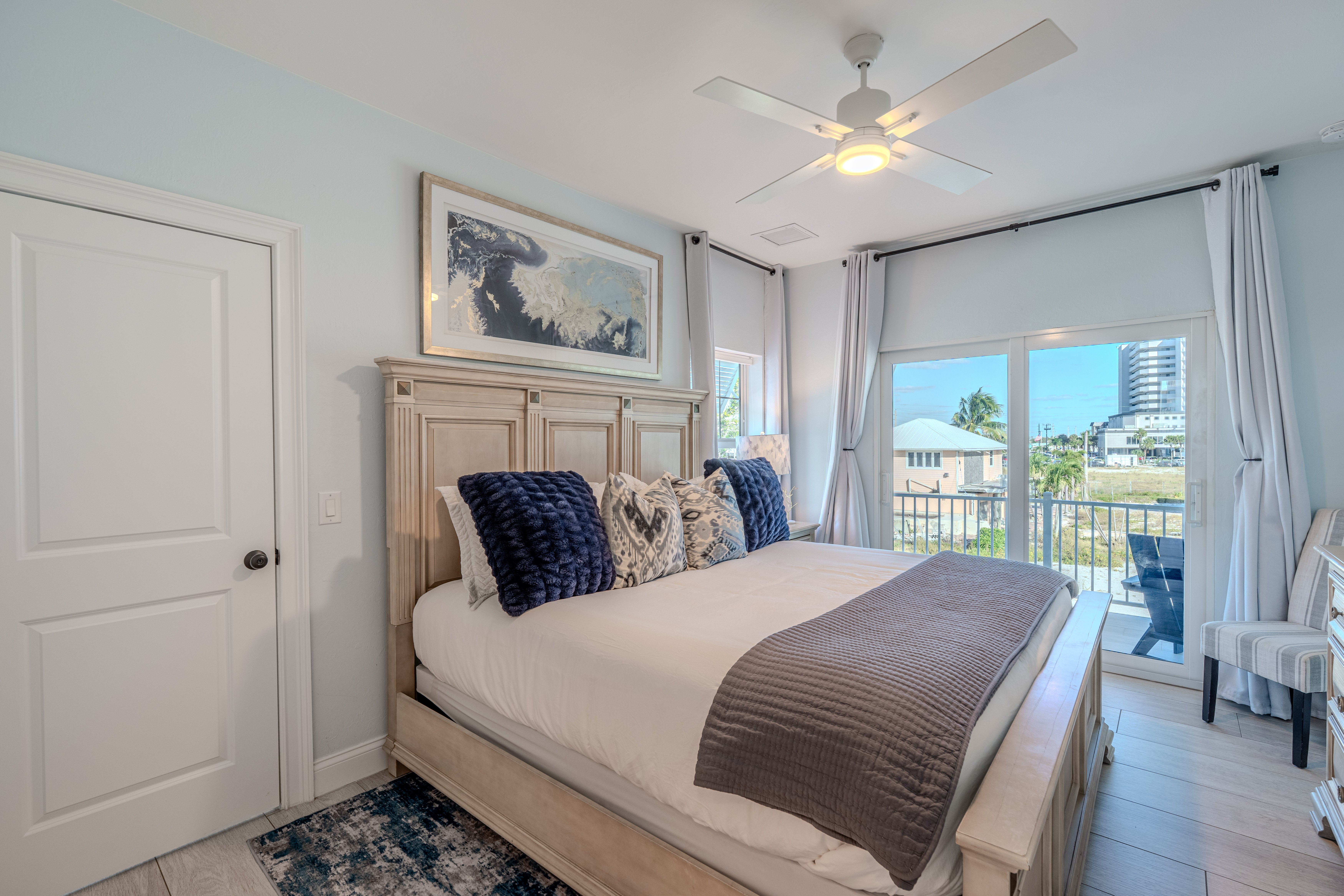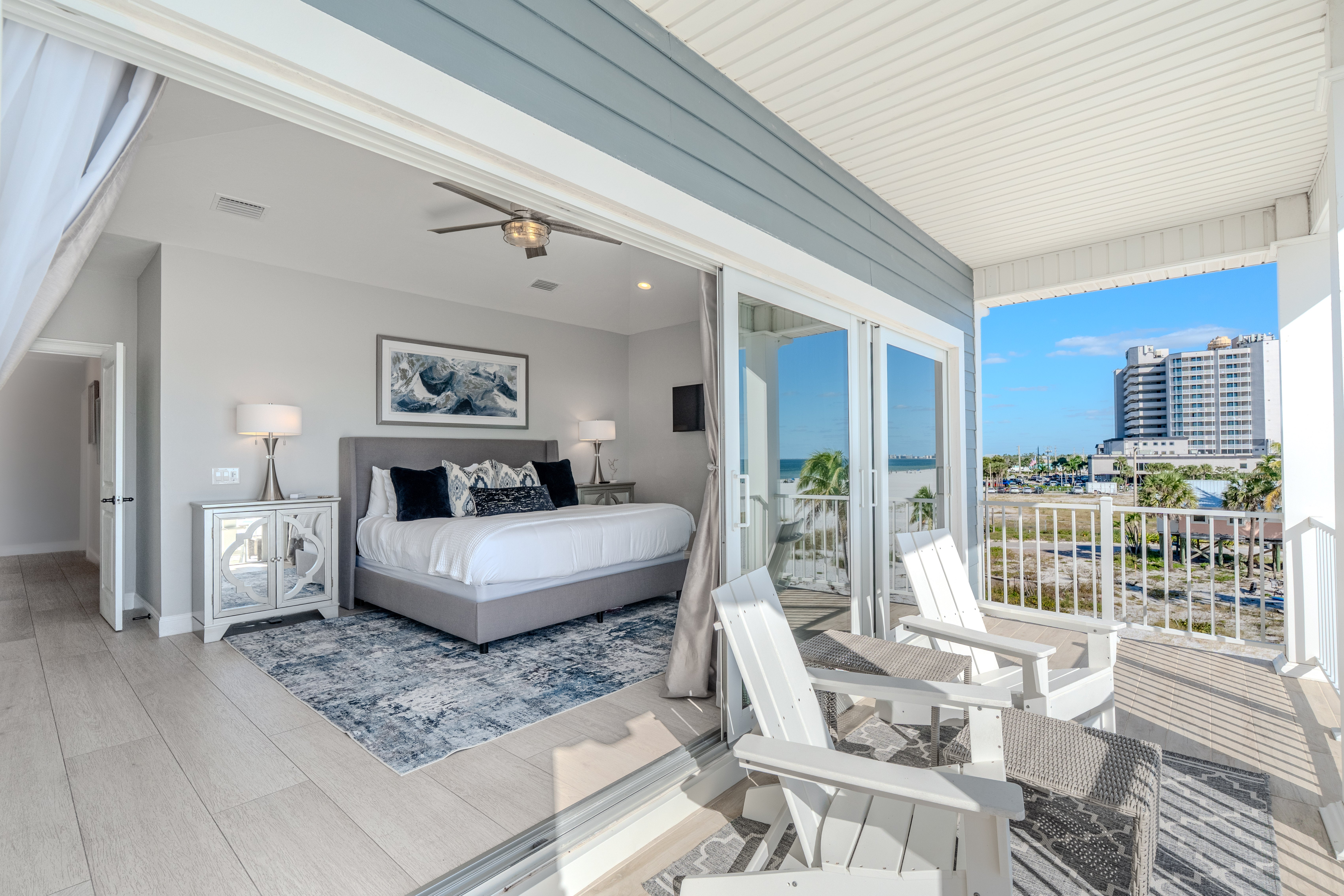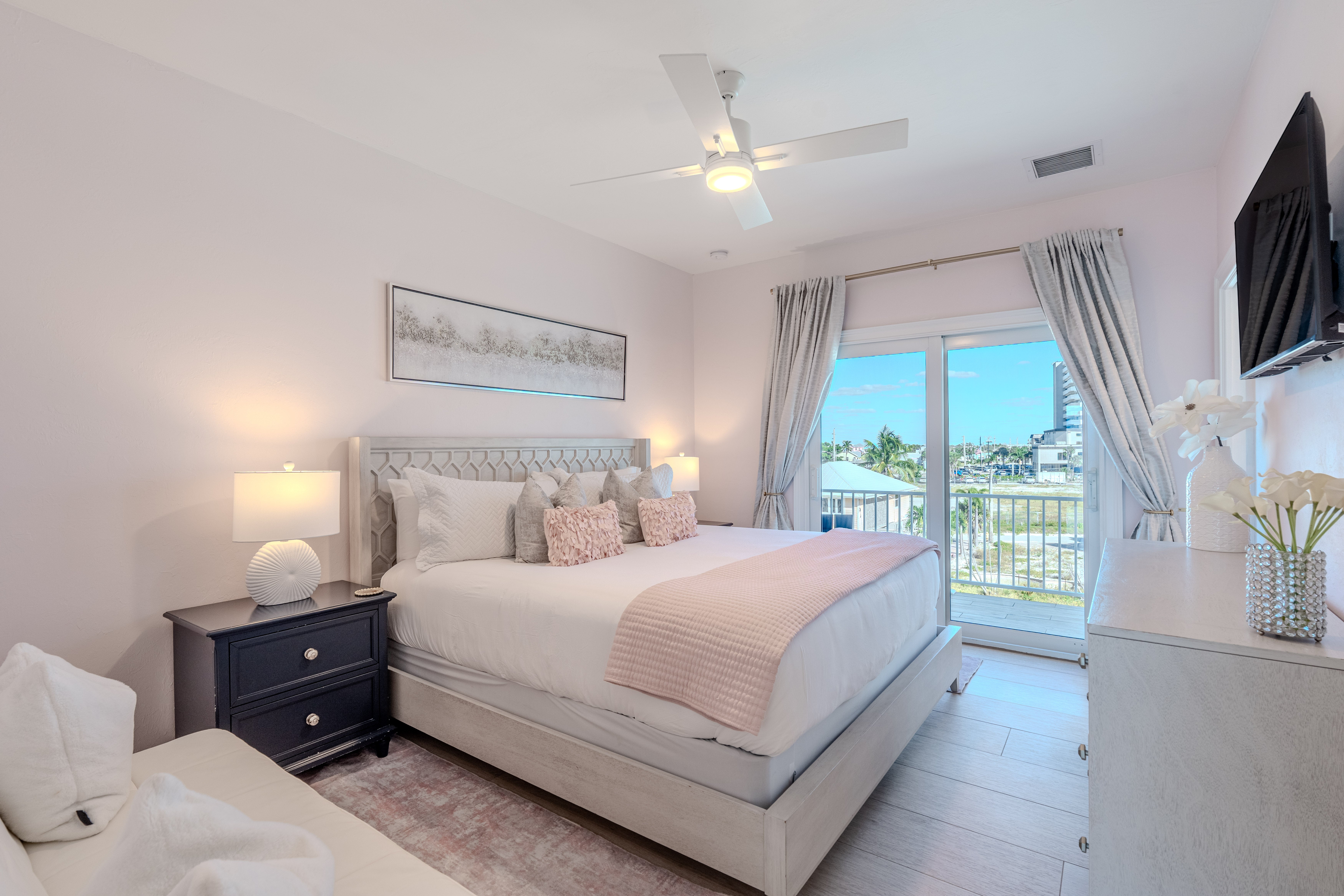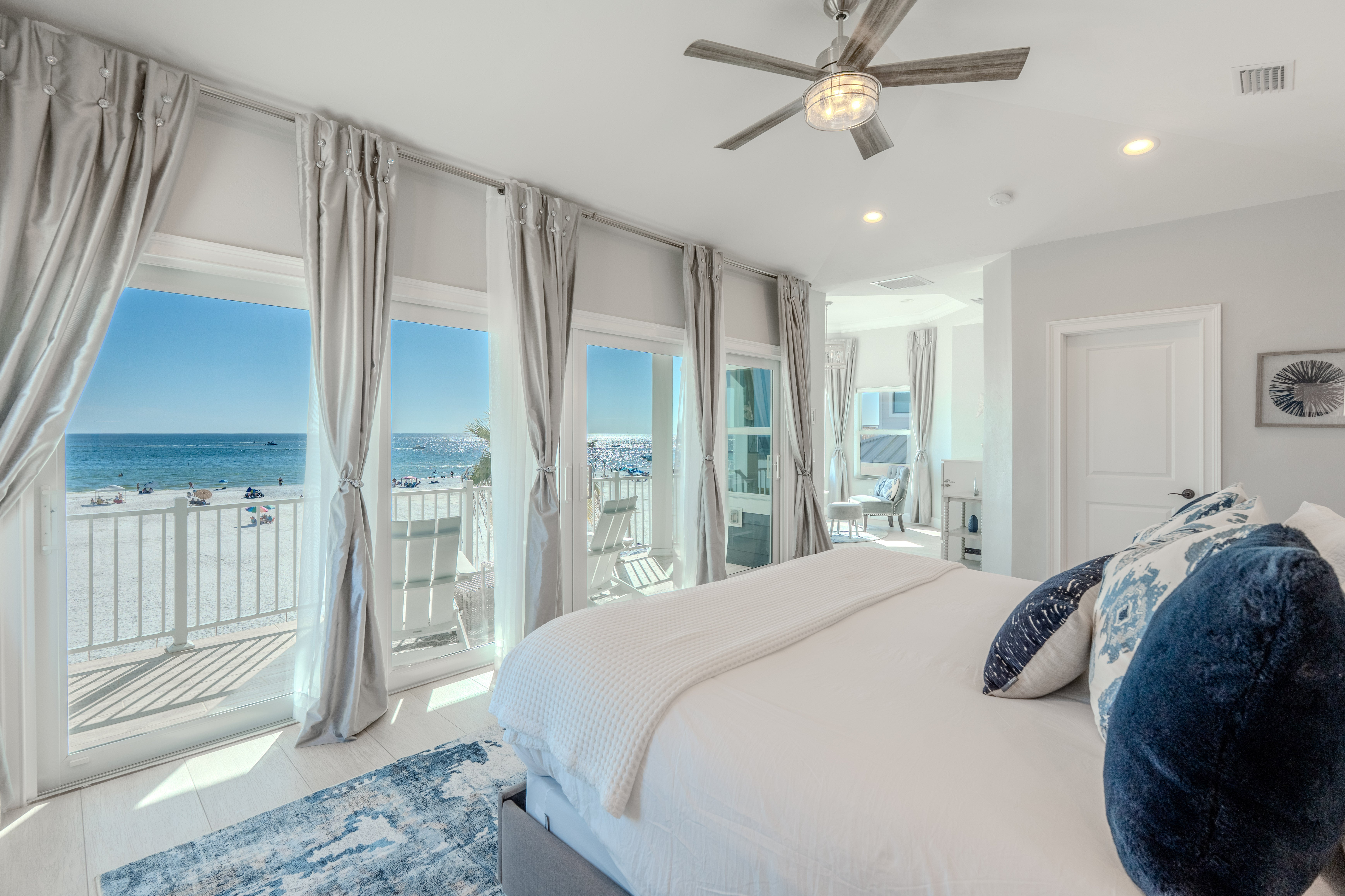 King Bedroom with attached sitting room, TV, ceiling fan and seating on a private balcony overlooking the beach. Walkin closet and ensuite bathroom.